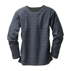 Dit overhemd is gemaakt van een zachte dubbelgebreide stof met een donkerblauw gestreept patroon aan de buitenkant en een effen kleur aan de binnenkant. Wanneer de mouwen worden opgerold, komt de kant zonder motief tevoorschijn; het overhemd kan echter ook “binnenstebuiten” worden gedragen. De tricot van biologisch katoen is individueel gebreid in twee lagen. Beide lagen steken worden met korte tussenpozen stevig met elkaar verbonden door middel van een verbindingsdraad (deze is verantwoordelijk voor het polyamidegehalte): hierdoor ontstaat een homogene gebreide kwaliteit. De randen worden gestikt en aan elkaar genaaid, de (zoomloze) randen worden afgezet met elastisch garen (zogenaamde overlocknaden).