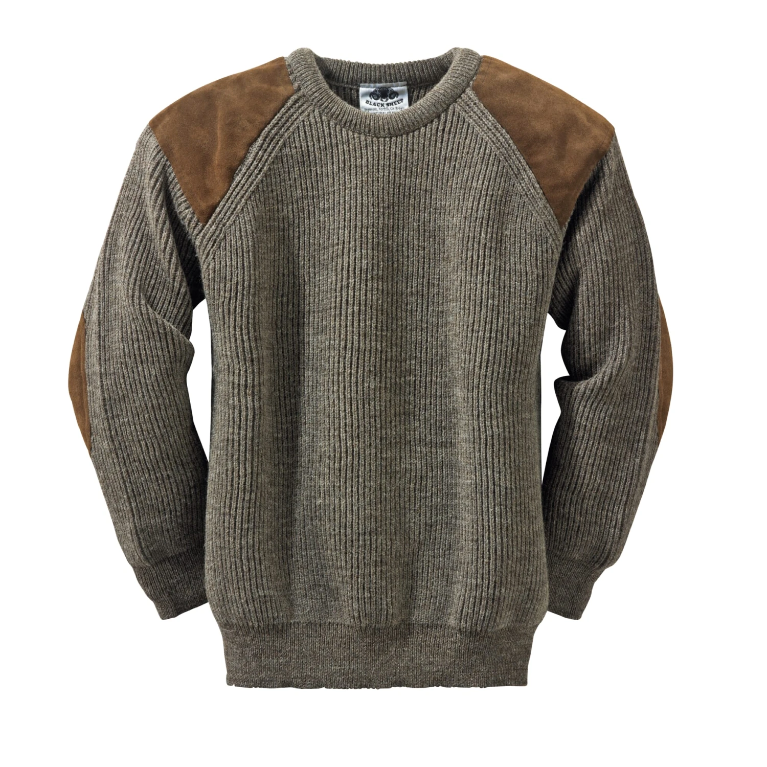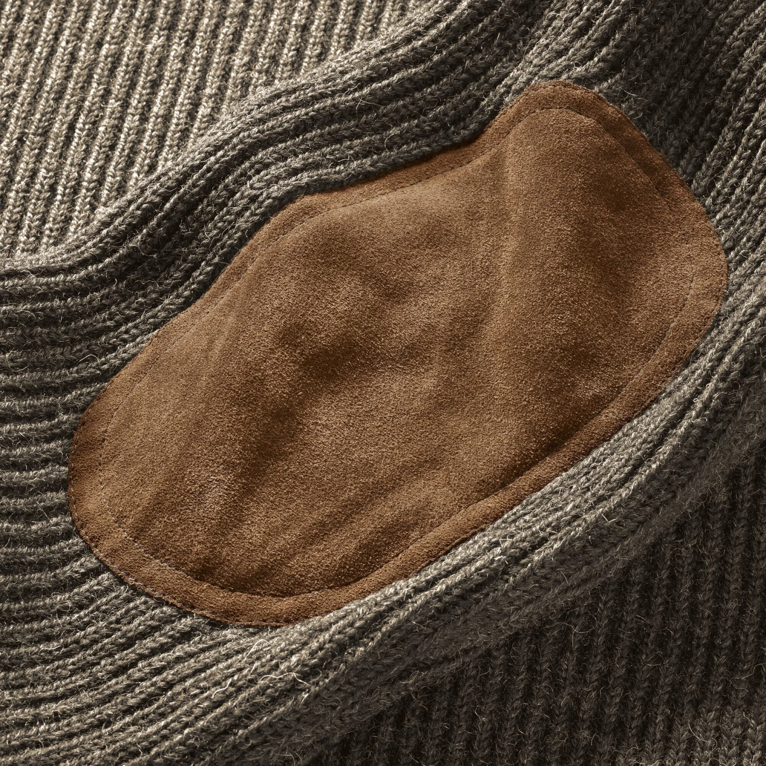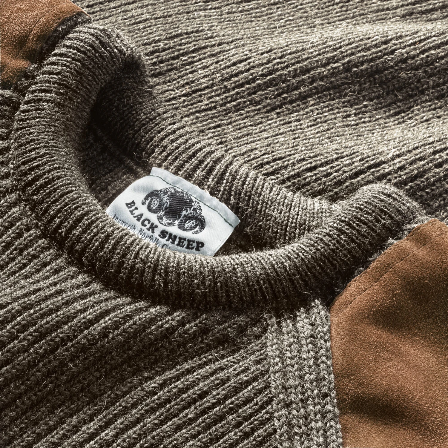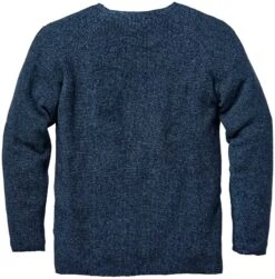 Volumineuze, vormgebreide (“fully fashioned”) pullover met ronde hals en raglanmouwen. De meer belaste delen op de schouders en ellebogen zijn afgezet met suèdeleer in bijpassende kleuren. De manchetten aan de hals, mouwen en romp zijn 1/1 ribgebreid.