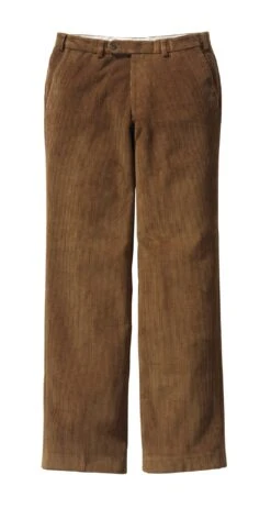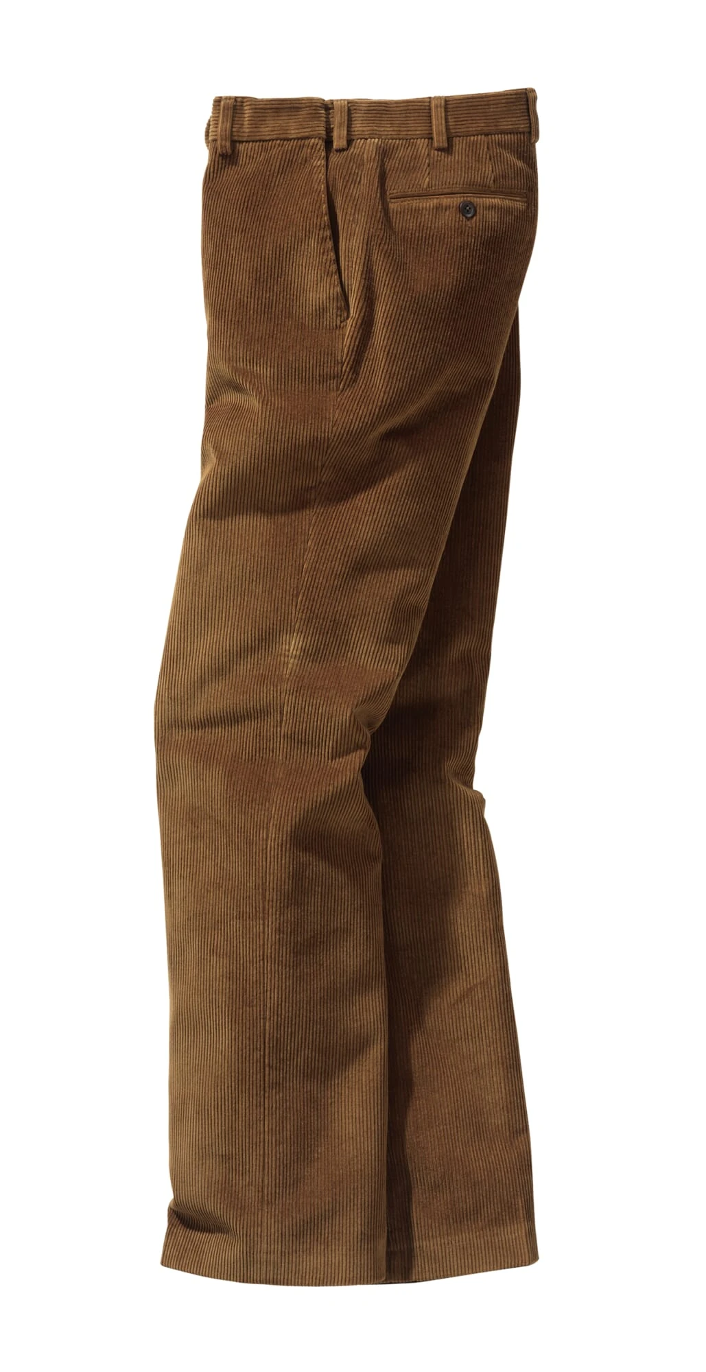 Dit ribfluweel wordt gewoonlijk gebruikt voor werkkleding – het robuuste materiaal is goed bestand tegen extreme slijtage. In de schering wordt een sterk getwijnd garen gebruikt; in combinatie met de hoge inslagdraaddichtheid – 55 draden per centimeter – ontstaat een zwaar, zeer veerkrachtig weefsel (500 g/m²) met een hoge poolweerstand. Dit komt enerzijds door de manier waarop de pooldraad in de stof is verankerd – de zogenaamde VW-weving – en anderzijds door het grote aantal inslagdraden. Herenpantalonspecialist Hiltl laat deze matig wijde herenbroek in Roemenië maken zonder plooi of omslag. De elastische tailleband aan de zijkanten is verdubbeld met buitenstof. De broek heeft Franse zijzakken en twee achterzakken met echte hoornen knopen.