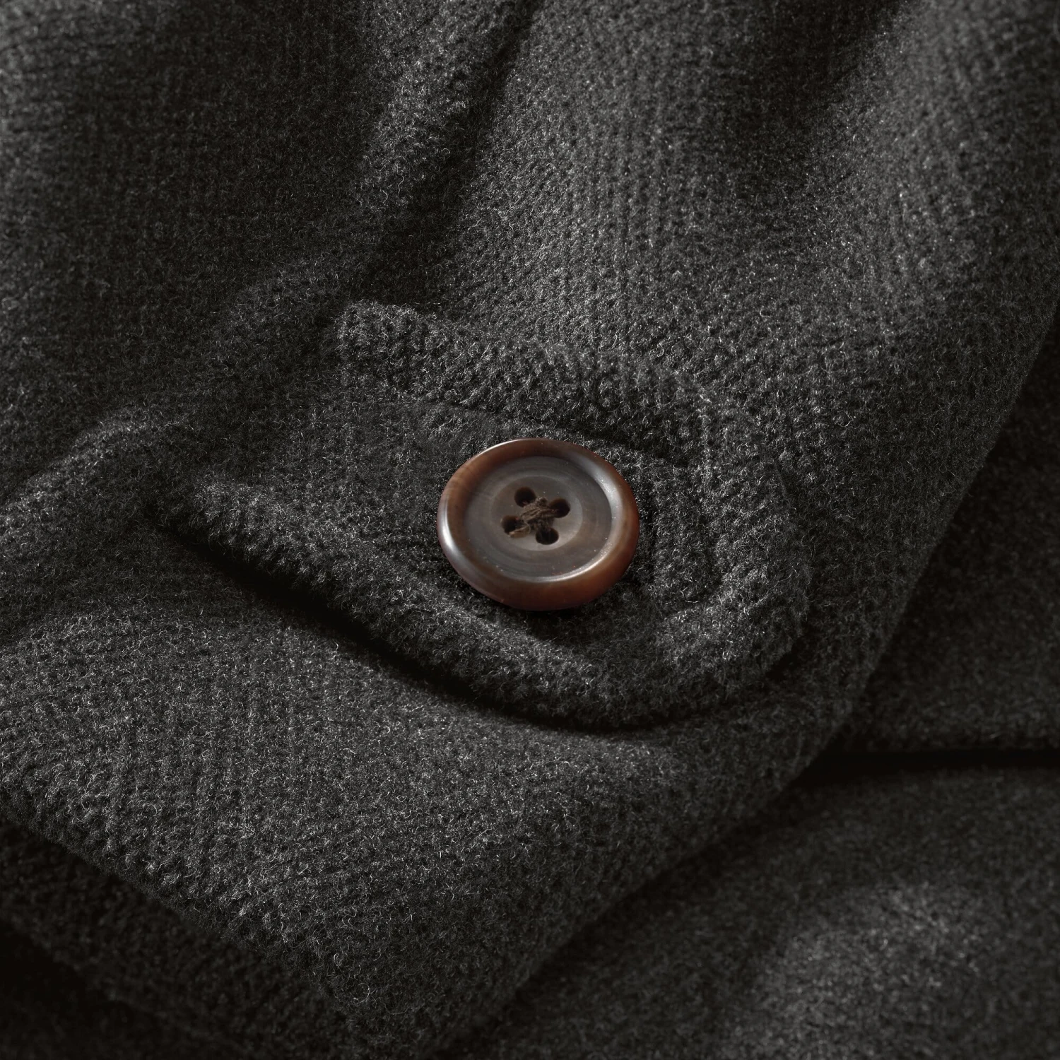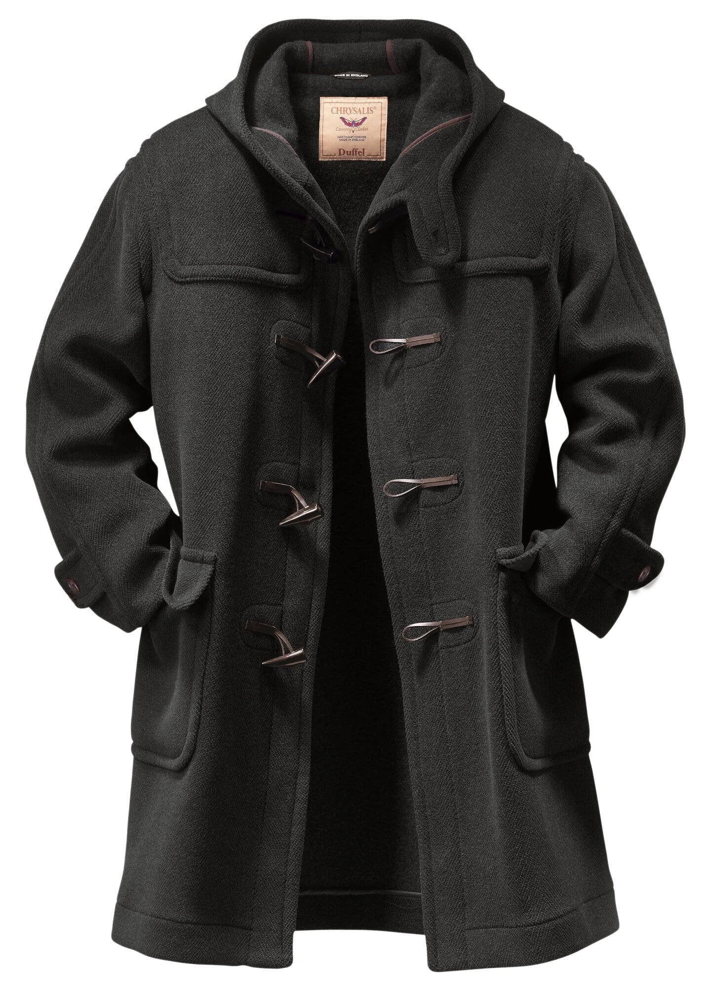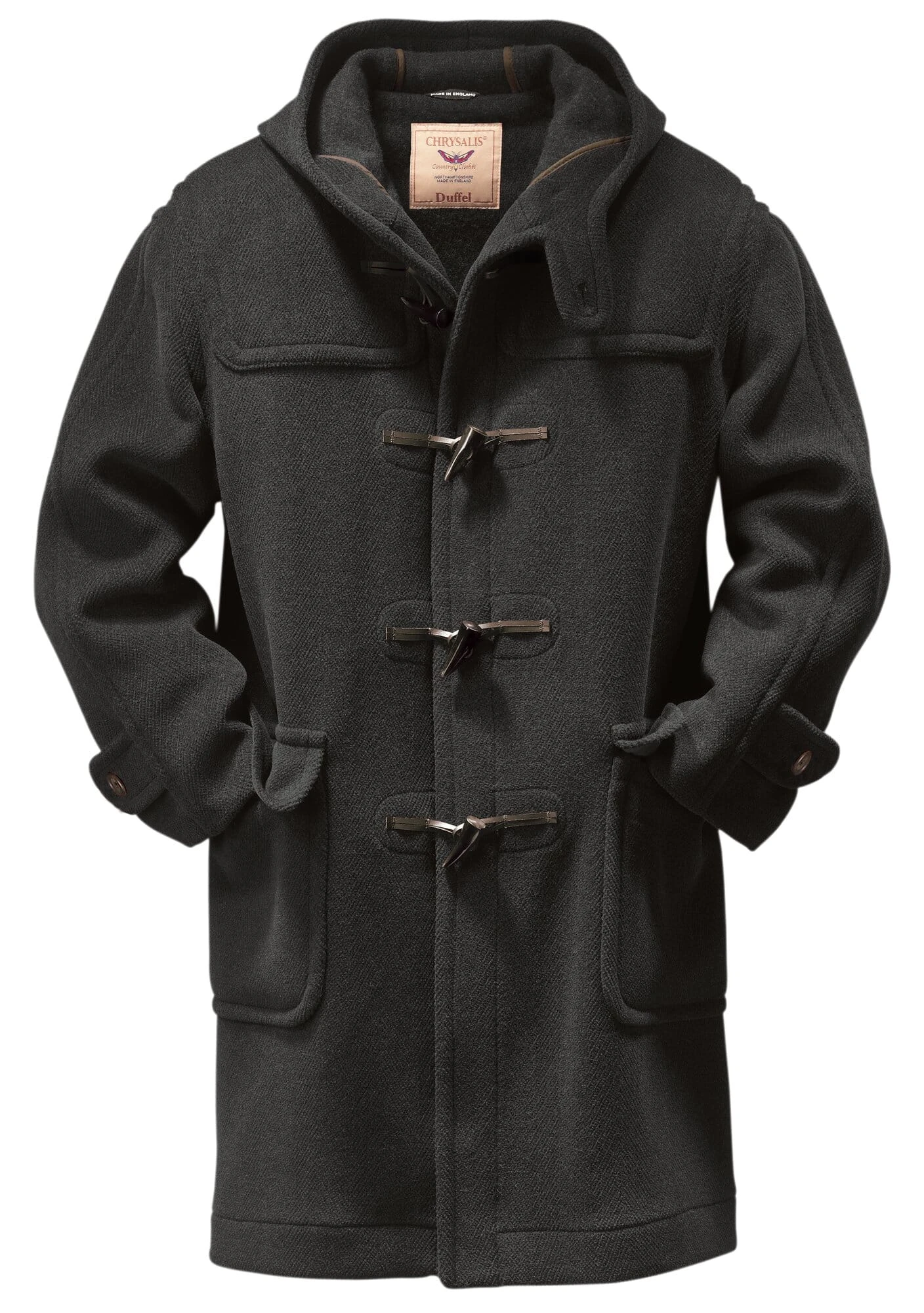 De weverij Mallalieus of Delph, gevestigd in Yorkshire, geniet een uitstekende reputatie voor de kwaliteit van haar tweeds en wollen doeken. Deze duffeljas is bij Chrysalis in Corby, Midden-Engeland, gemaakt van een Mallalieus “Elysian”, een stof van zwaar gekaard garen die zijn bijzondere karakter krijgt door extra inslagdraden die stevig in de stof zijn verankerd. Deze worden opengesneden, kort geschoren en vormen dan een isolerende laag over de basisstof waarop regendruppels of sneeuwkristallen blijven liggen – zonder contact met de aldus afgeschermde stof. De fijne visgraatstructuur vermindert de oppervlaktespanning van de stof, waardoor de volwaardige stof behaaglijk warm en zacht is, maar tegelijkertijd veerkrachtig en vuilafstotend. De jas sluit op vier knevels; de knevels van gekweekt hoorn worden gesloten met leren lussen. De mouwen zijn gevoerd met 100% viscose zodat er gemakkelijk een blazer of jasje onder gedragen kan worden. Alle naden zijn kapnaden en de snijranden zijn gebiesd.