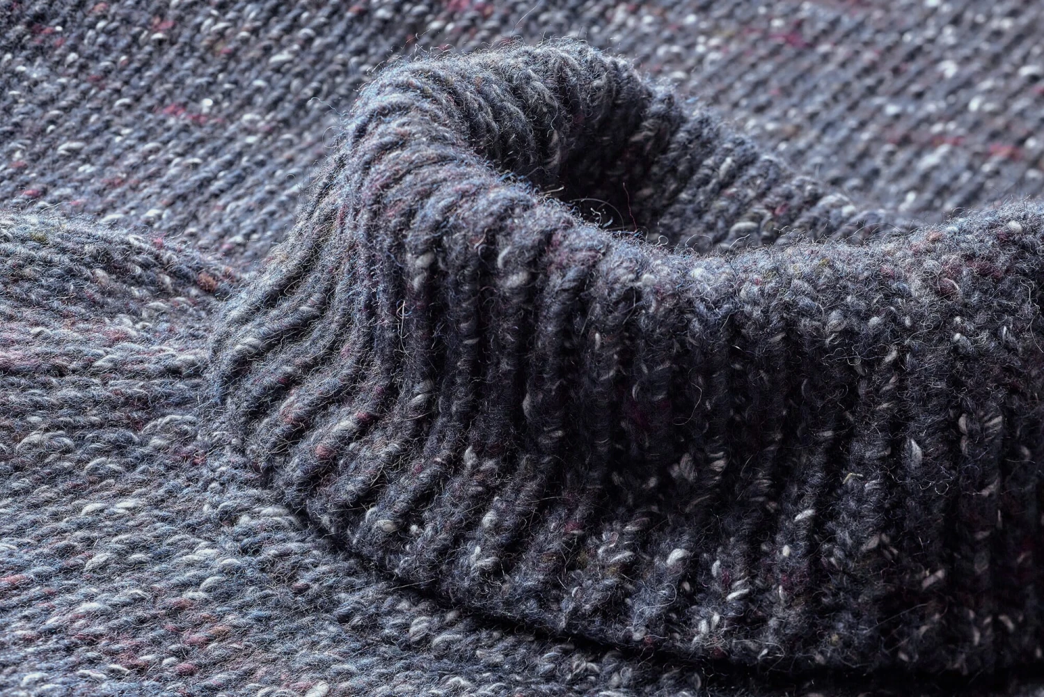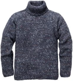 Het breiwerk van deze coltrui bestaat voor ongeveer tweederde uit scheerwol, plus alpacahaar en zijde. Deze ongewone combinatie geeft de trui uitstekende draageigenschappen: hij is warm, maar niet te zwaar, voelt zacht en relatief soepel aan. Talrijke gekleurde spatten in de basistint geven het een opvallende uitstraling.