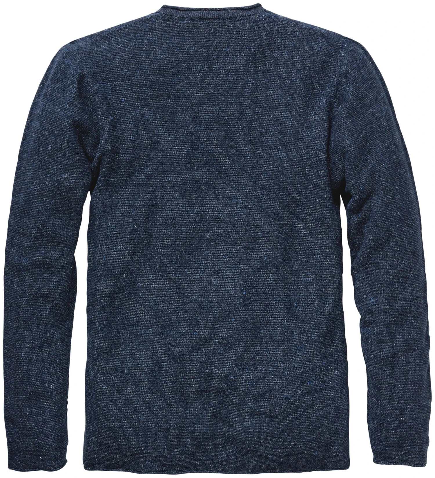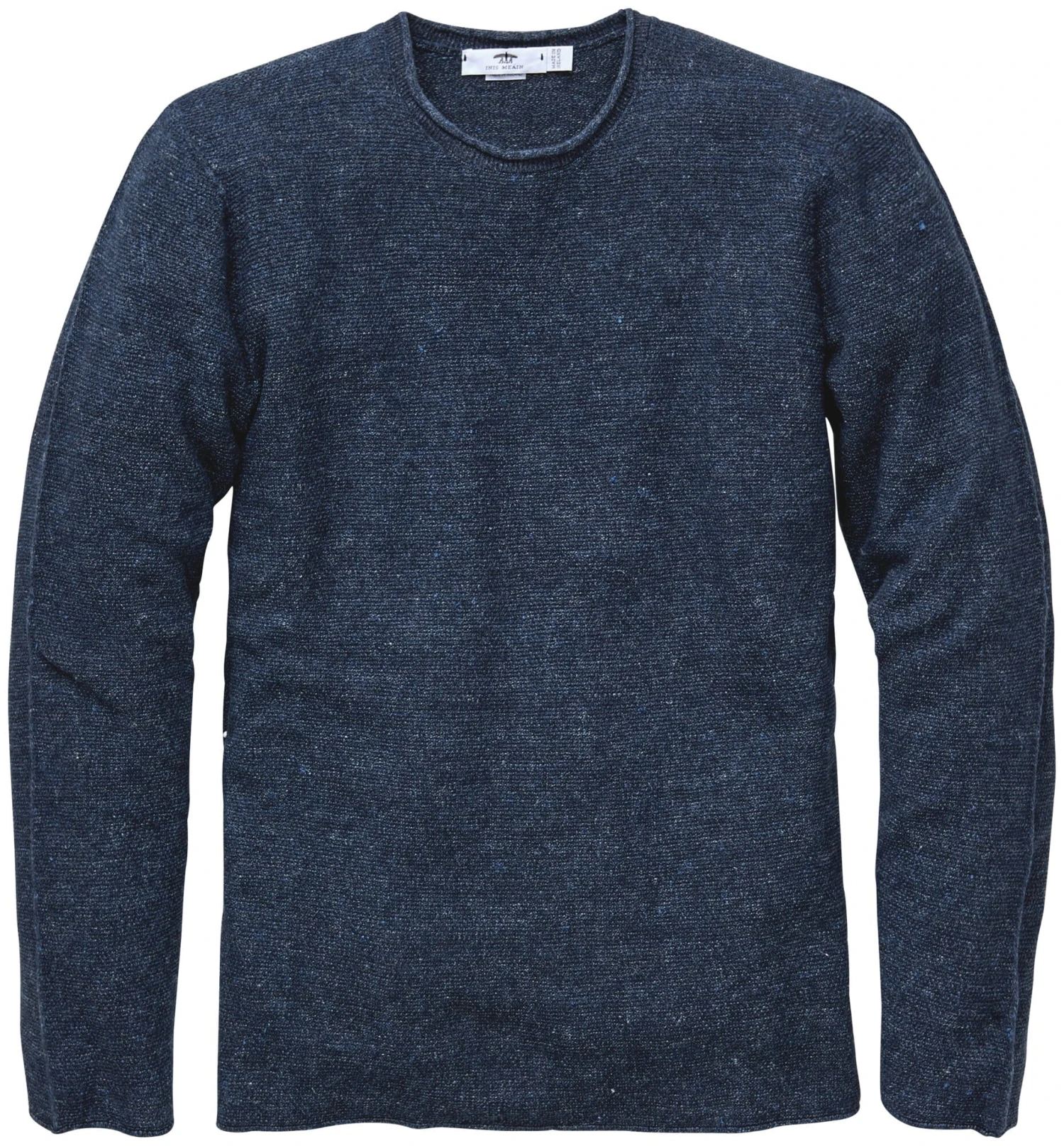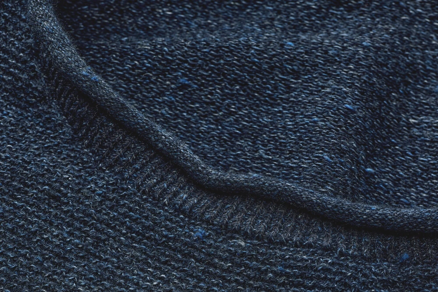 Het breisel van deze trui is gemaakt van linnen, dat geen warmte vasthoudt, en huidvriendelijk katoen. Het voelt korrelig aan en ziet er opvallend gemêleerd uit. De trui sluit met een fijne rolzoom bij de hals, en de zomen van de mouwen en de romp zijn gebonden.