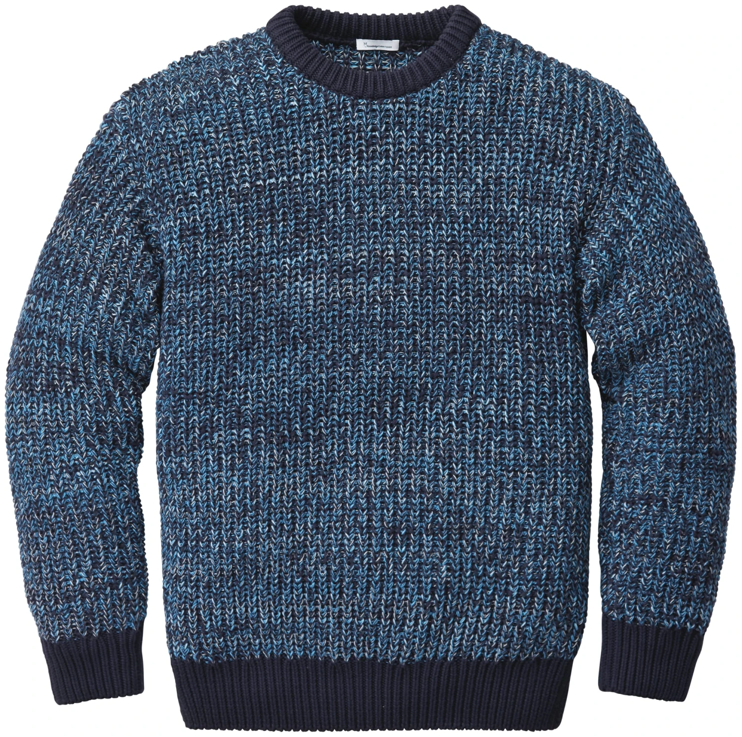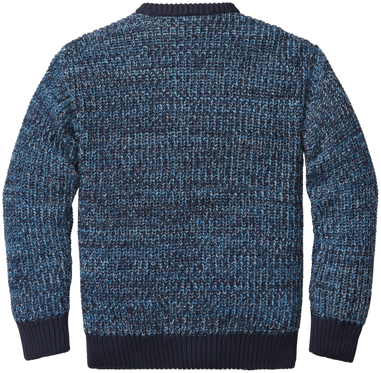 Deze vrij zware trui van gecertificeerd biologisch katoen is grof gebreid, waardoor hij een opvallend, plastisch steekpatroon vertoont. Gemêleerde garens in verschillende tinten blauw geven hem extra structuur. Contrasterende effen ribboorden werken de hals, mouwen en rompzoom af.