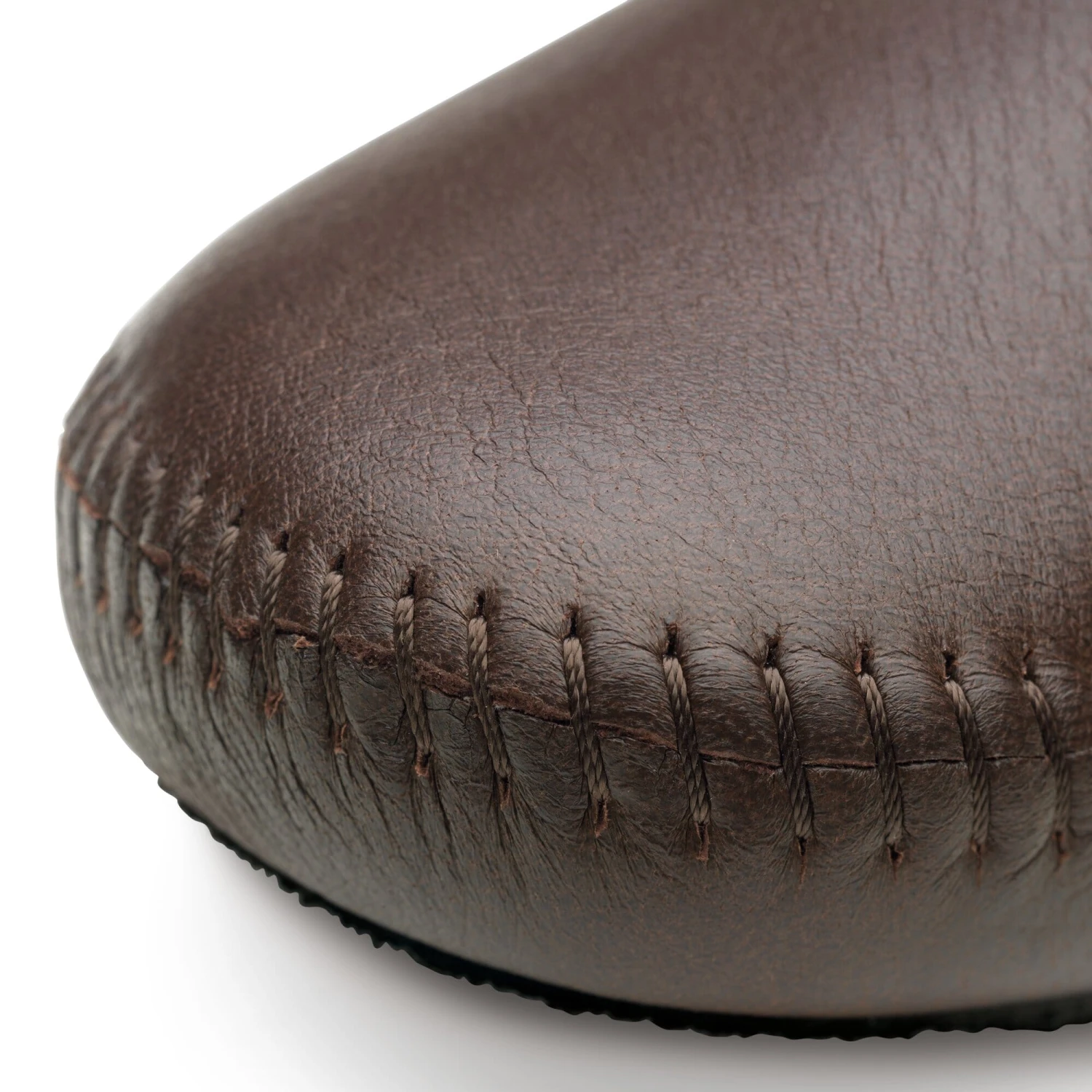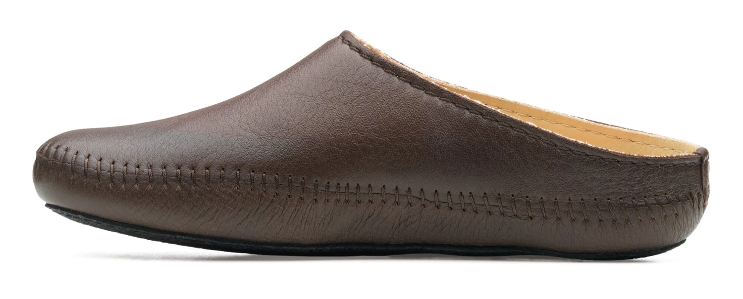 Bij deze pantoffel van Haflinger wordt het soepele bovenleer gecombineerd met een voering van kalfsleer, die niet minder comfortabel is voor de voet (en overigens zeer vriendelijk voor de huid). Het anatomisch voorgevormde kurk-latex voetbed ligt losjes in de schoen, maar is goed ingebed dankzij de smalle verhoging in het hielgedeelte – indien nodig kan het vrij onopvallend worden vervangen door eigen (medische) inlegzolen. De buitenzool is gemaakt van stevig, fijn geprofileerd rubber en is duurzaam gestikt met zadelmakersdraad. Hij is bestand tegen een wandeling op het terras of in de tuin, maar door zijn dunheid is hij niet echt geschikt voor straatgebruik.