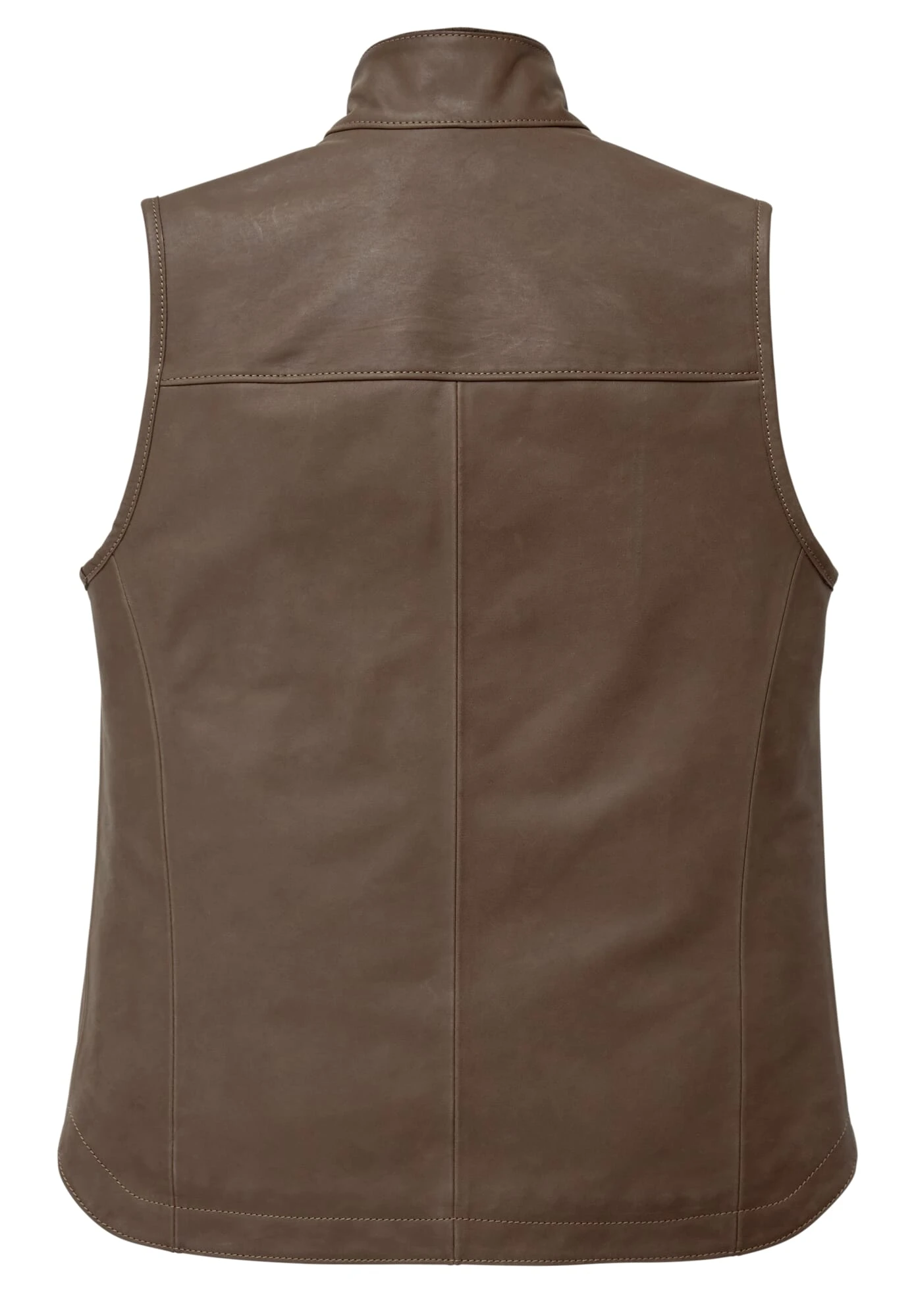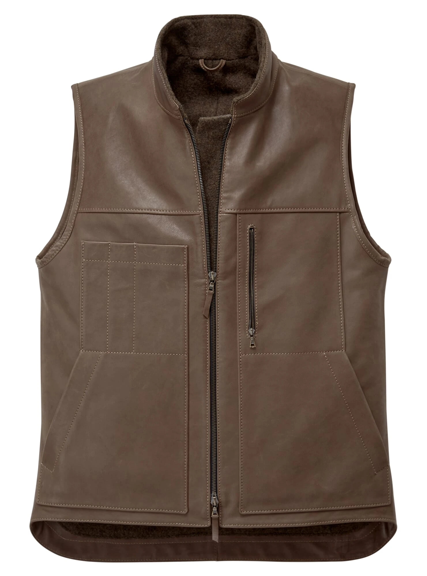 Aan de buitenkant geeft gewaxt rundleer dit gilet een opvallende look en een robuust gevoel. Binnenin houdt een wollen voering van de Mehler lakenfabriek je behaaglijk, zelfs als het kouder is. Onder de tweewegrits zit een winddicht paneel, zodat het niet tocht. Er zijn verschillende zakken voor klein dagelijks gebruik: twee zijzakken, een open borstzak rechts met twee pennenvakken, een borstzak met verticale ritssluiting links en niet te vergeten een binnenzak met drukknoop, groot genoeg voor bijvoorbeeld een smartphone.