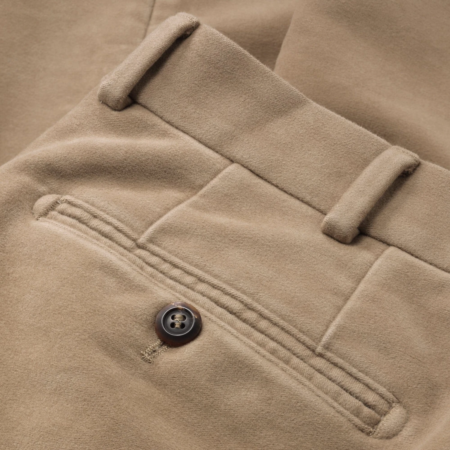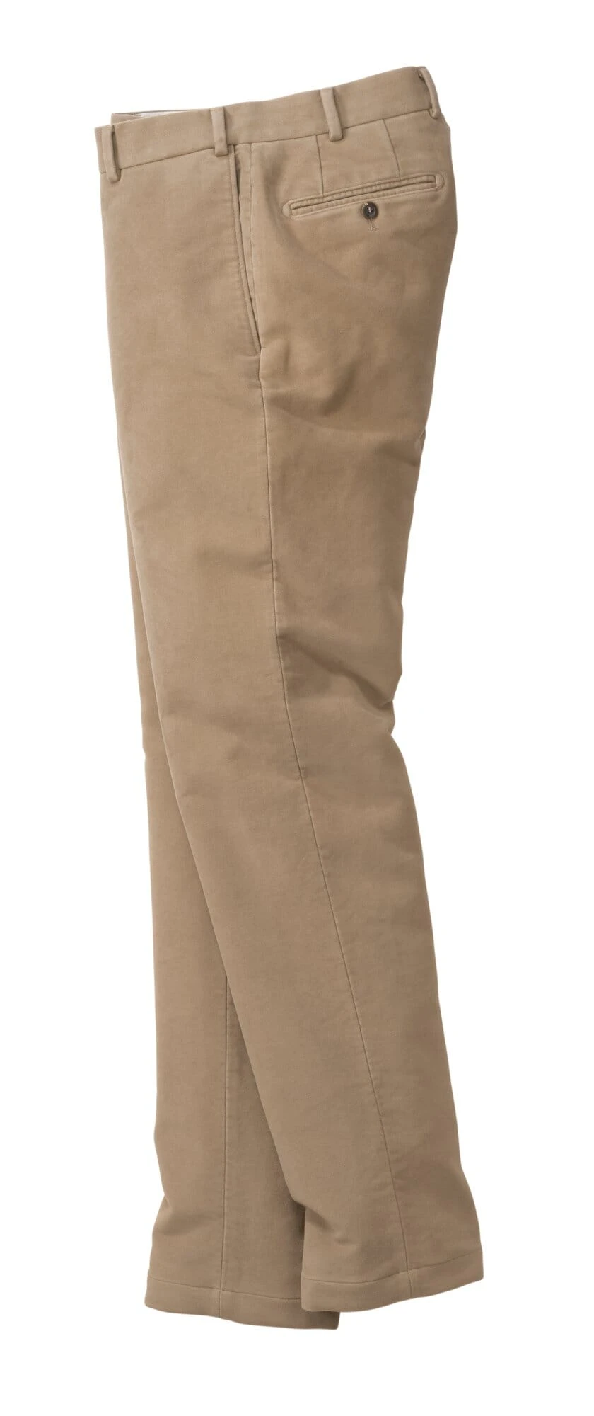 Zacht en toch robuust en slijtvast is deze zware stof van zuiver katoen: een moleskin van Kindermann, specialist in werkkledingstoffen. Het afgewerkte doek wordt in verschillende stadia geschuurd en opgeruwd om de onnavolgbare zachtheid en het gevoel te verkrijgen dat zo typisch is voor een moleskin. Hiltl gebruikt het om deze rechte chino’s met zijzakken te maken. Onder de tailleband bevindt zich een horlogezakje, en de achterzakken sluiten met echte hoornen knopen.