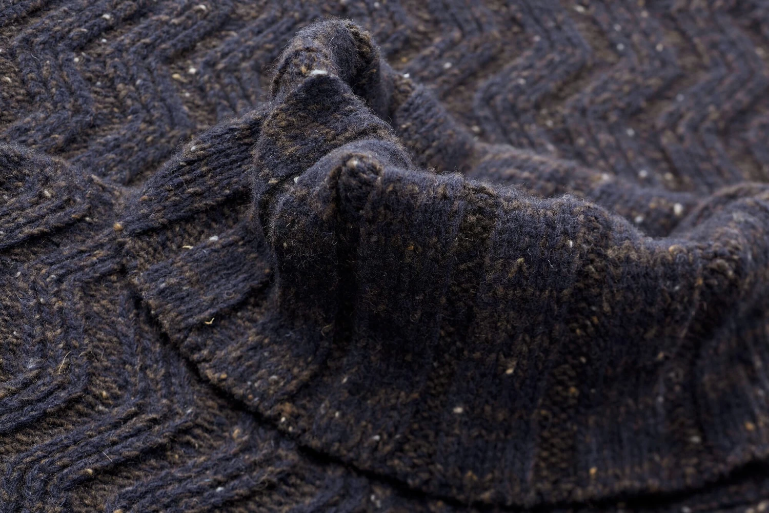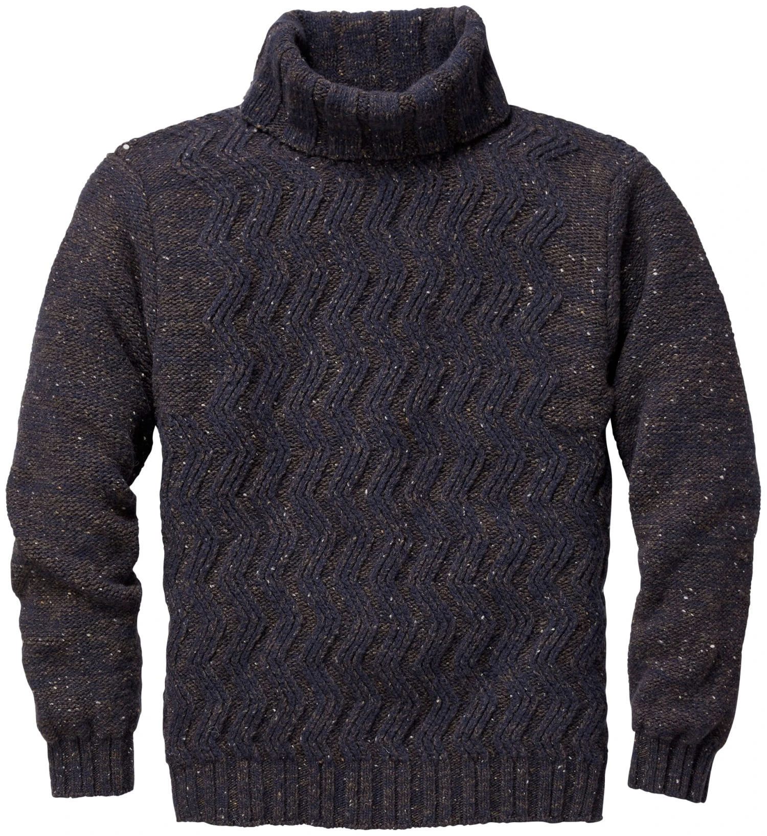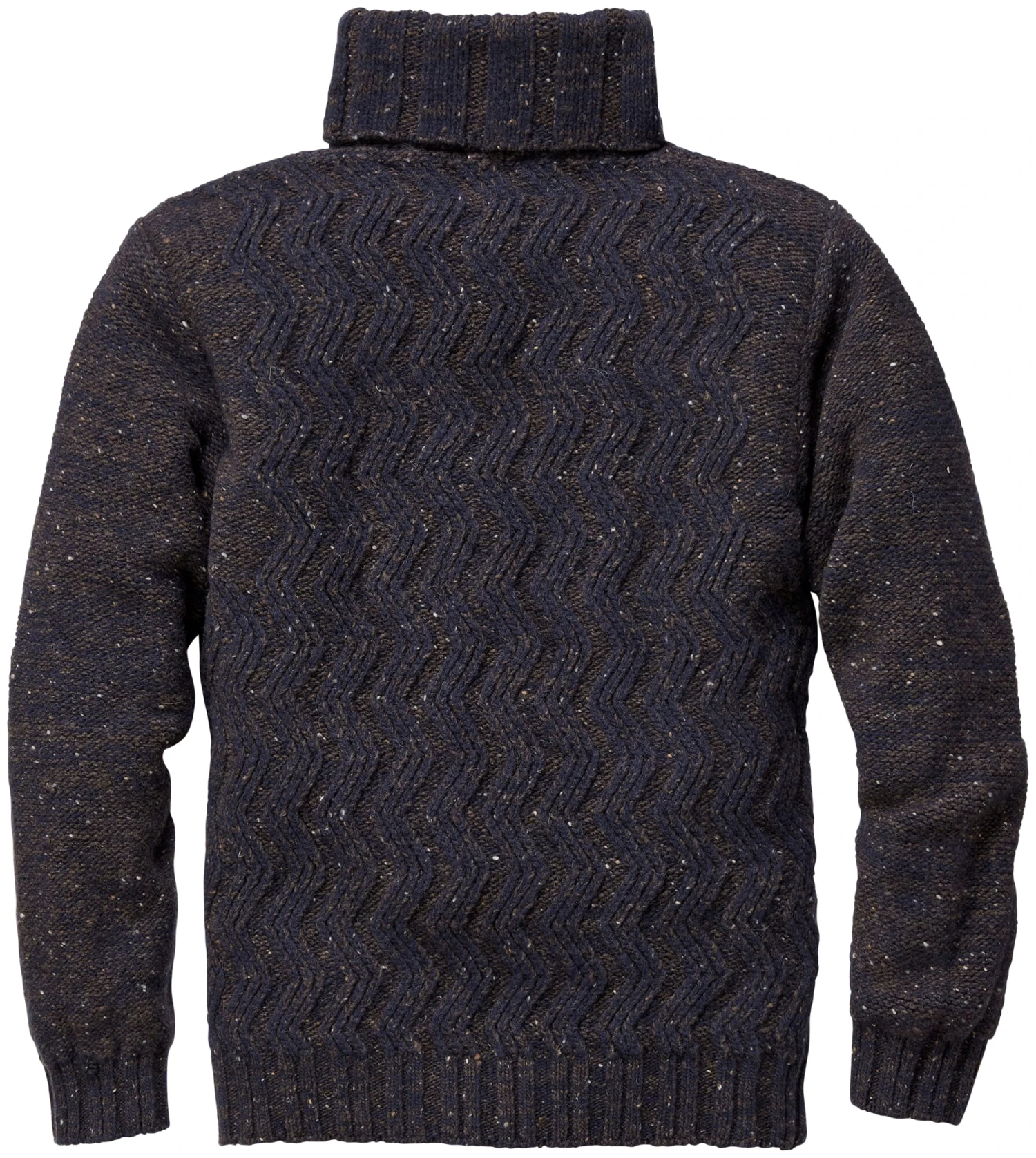 Deze karaktervolle coltrui van warme scheerwol heeft sculpturale zigzagstrepen op de borst en de rug. Het is gebreid in twee strengen van blauwe en braungarens voor een prachtig gemêleerd effect. Lichte kleurinsluitsels in het breisel versterken de opvallende uitstraling. De vrij brede col is gemaakt als een breed geribd breisel, en ook de mouwen en de romp sluiten met geribde gebreide manchetten.
