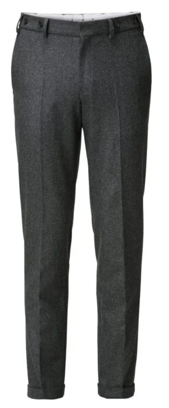 Hiltl maakt deze ongevoerde broek van een zachte en toch soepele scheerwolflanel. Ze zijn gemaakt zonder plooien, maar met een plooi. De omslag is aan de binnenkant versterkt met een schokkoord. De broek heeft twee steekzakken en twee achterzakken met paspel, en wordt gesloten met een rits- en haakknoop. Ze hebben riemlussen en bretelknopen.