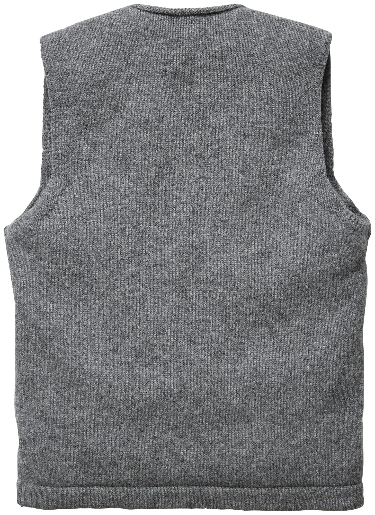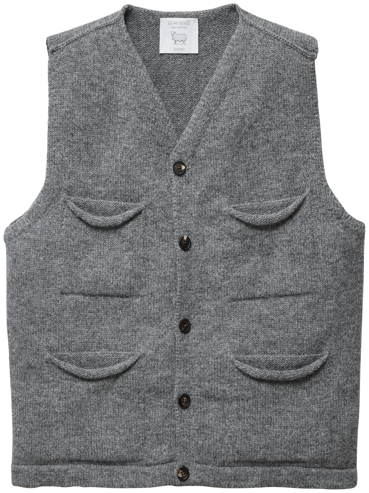 Urbrits gilet waarvan het warme breisel van zuivere scheerwol een mooie gemêleerde tint vertoont. Het vest sluit met contrasterende knopen van echt hoorn. Het heeft vier ingebreide zakken met opgerolde zomen bij de openingen. Een smalle gebreide manchet rondt het bovenlichaam af, en de hals heeft een gerolde zoom.