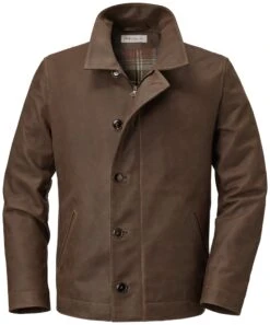 Gemaakt van gewaxt rundleer, heeft Hack deze pittige halflange leren jas gemaakt waarvan de vorm is geïnspireerd op een historisch marine-dekjasje. Het leer heeft een levendige uitstraling. Het is nogal troebel van kleur en neemt snel allerlei gebruikssporen aan, kortom: het krijgt snel een mooi patina. De mouwen zijn voorzien van royaal gesneden leren garnituren, een geruite rompvoering van wol verwarmt de drager van de jas. De zijvakken zijn netjes afgewerkt en binnenin is een zak met rits in een leren omslag. De jas wordt gesloten met een metalen rits van Riri, waaroverheen een breed winddicht paneel met knopen.