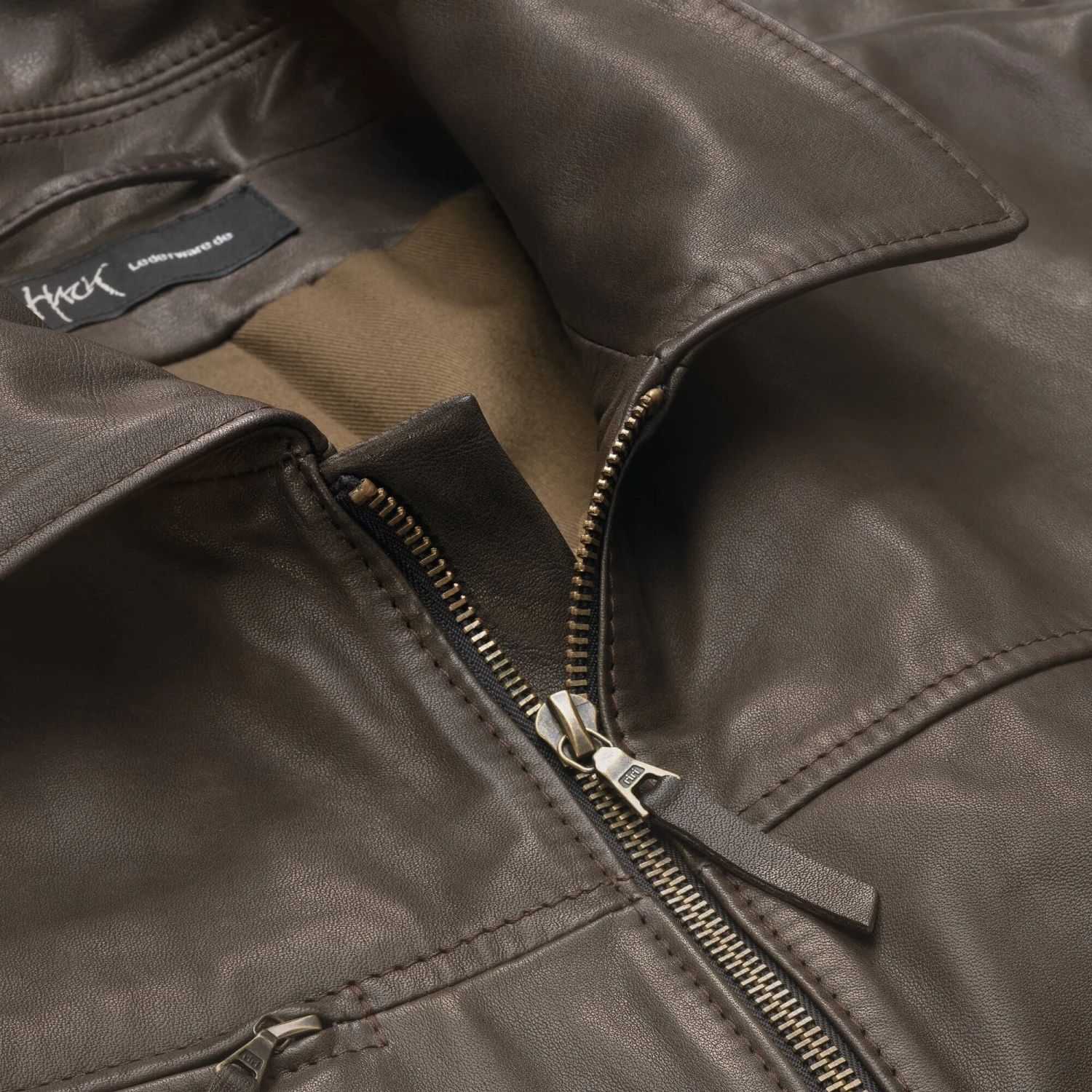 Achter Hack Lederware staat Christoph Hack, oprichter en fijn lederbewerker met een eigen atelier in Keulen. Hij werkt al tientallen jaren met een grote verscheidenheid aan leersoorten, waardoor hij een schat aan ervaring heeft opgedaan die doorwerkt in het ontwerp van de kledingstukken. Hack verwerkt bijvoorbeeld alleen leer met natuurlijke oppervlakken uit Duitsland, Italië en Scandinavië tot slijtvaste, functionele kleding en eenvoudige accessoires. De modellen van koeienhuid, paardenhuid en hertenhuid documenteren sporen van het leven van een dier, zoals insectenbeten of doornscheuren. Hun patina, dat zich ontwikkelt door beweging en veelvuldig dragen, is uitdrukkelijk gewenst omdat het bewijst dat het lederen kledingstuk met eer mag verouderen. Juist dit natuurlijke verouderingsproces geeft Hack jacks hun unieke “gezicht”. Ze worden samengesteld in het hoofdkantoor van Hack in Keulen en in een Pools partnerbedrijf.
