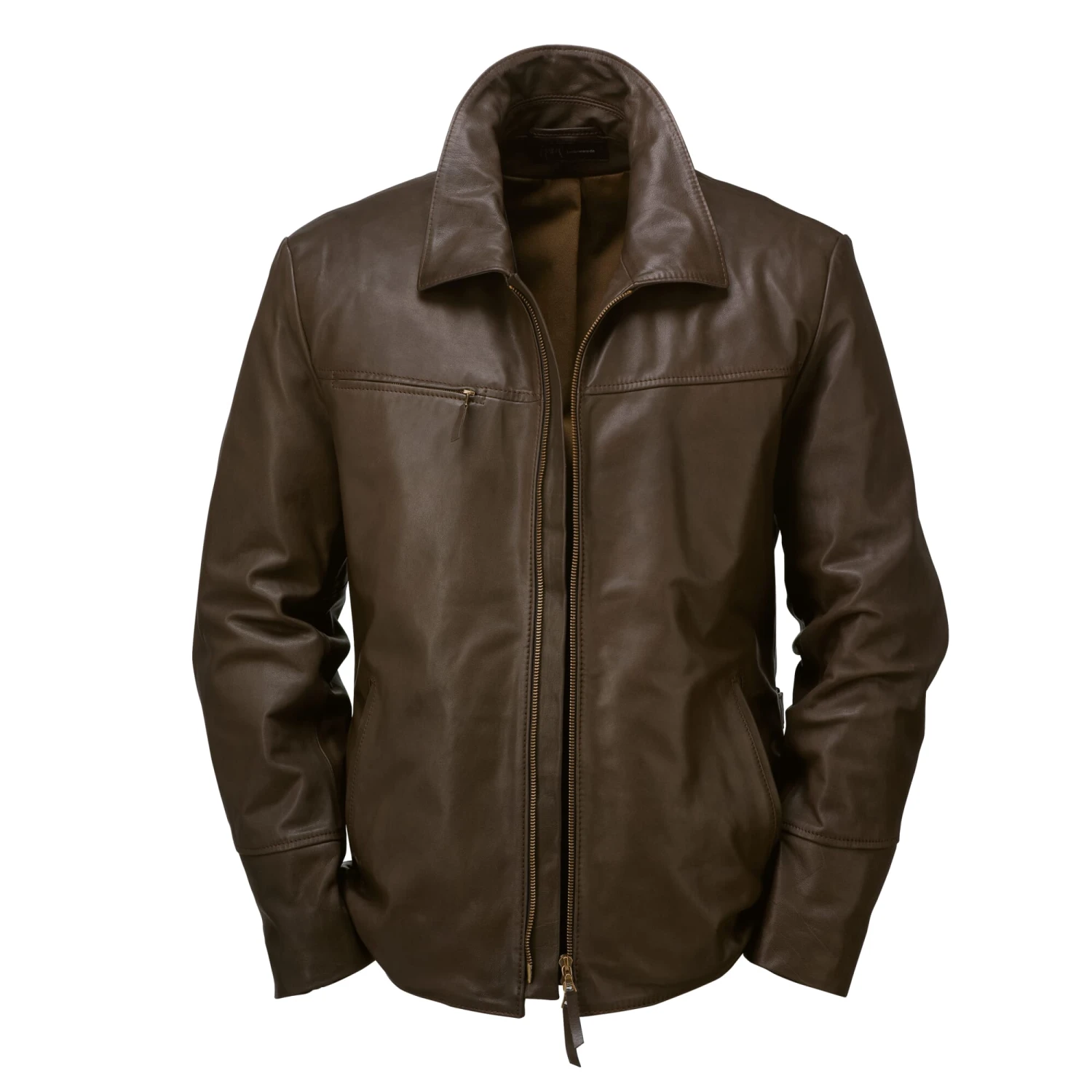 Runderhuid (dikte 1 mm), plantaardig gelooid. Lichaamsvoering 100% katoen, mouwvoering 100% viscose. Twee paspelzakken, een borstzak, een binnenzak. Messing ritsen. Gemaakt in Polen. Ruglengte in maat 52 = 72,5 cm.