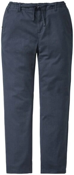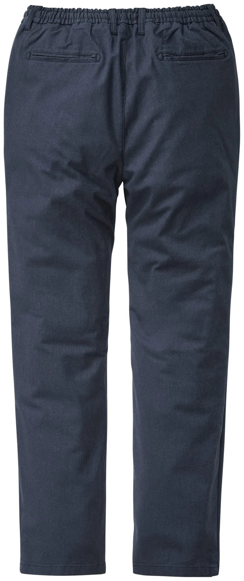 Casual en comfortabele broek in de stijl van een joggpants. Gemaakt van gecertificeerd biologisch katoen, lijkt de stof ergens tussen flanel en denim in. Een beetje elastaan houdt de vorm en verhoogt het draagcomfort. Dit laatste wordt niet alleen versterkt door de snit, maar ook door een elastische tailleband met een strikband. De broek sluit met een rits en een knoop. Ze zijn uitgerust met twee zijzakken, twee achterzakken en een veiligheidszak met rits vooraan.