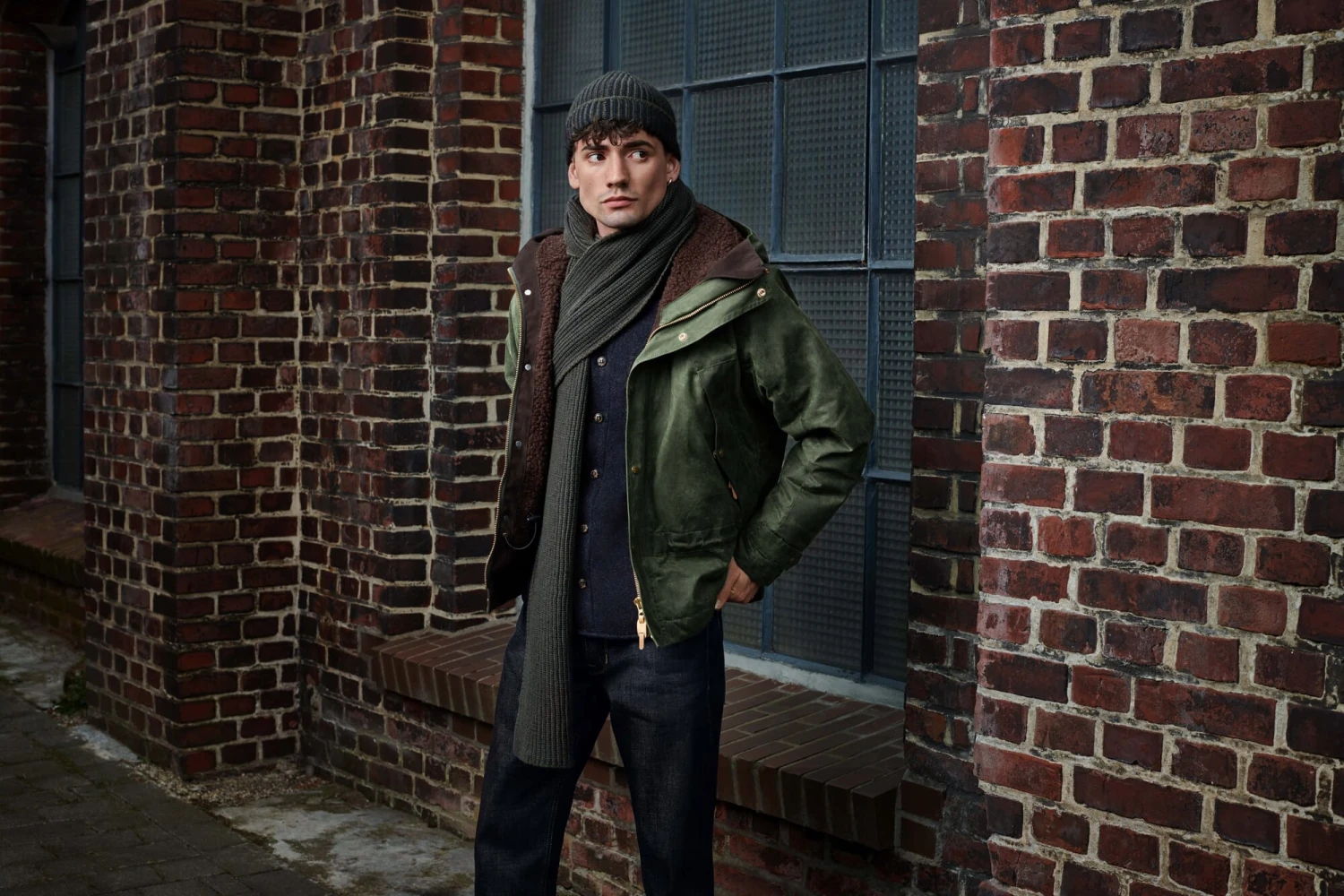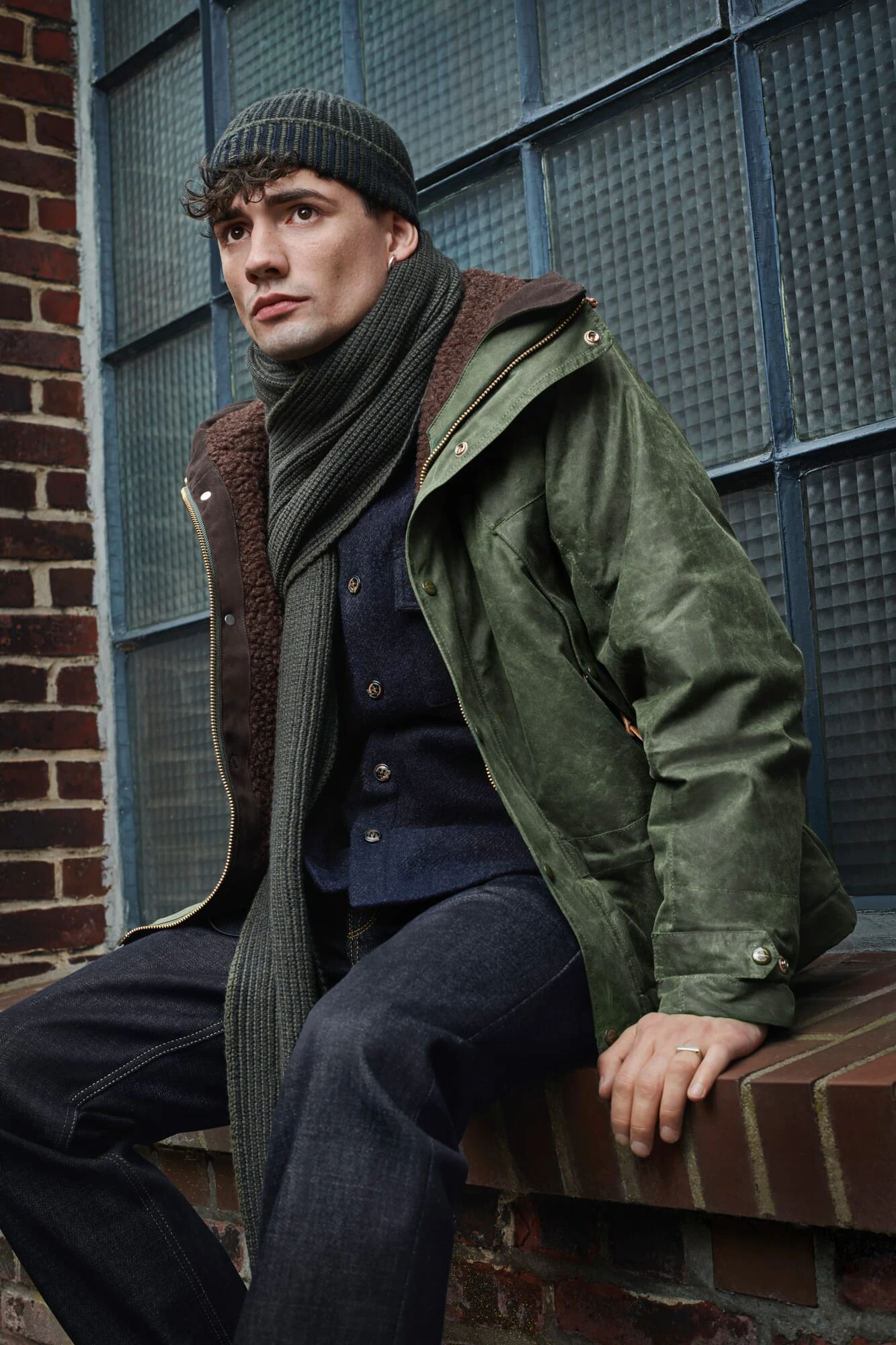 De door Ceccarelli voor deze jas met capuchon gebruikte gewaxte katoenen stof voelt pittig aan. Het maakt de jas weerbestendig. Een verwarmende teddyvoering van 90% wol en 10% polyester beschermt tegen de kou. De piek van de capuchon, de knoopsluiting van de kraag, de manchetten en de zoom van de romp zijn aan de binnenkant gevoerd met zacht moleskin. Ribgebreide manchetten in de mouwen houden de wind buiten. De jas wordt gesloten door middel van een metalen tweewegrits, waarover een knoopbaar, windbestendig paneel zit. Een trekkoord in de taille geeft de jas vorm, en de capuchon en de rompzoom hebben ook trekkoorden. Er zijn twee voorzakken met kleppen met knopen. Een binnenzak met rits biedt nog meer opbergruimte voor kleine spullen voor dagelijks gebruik.