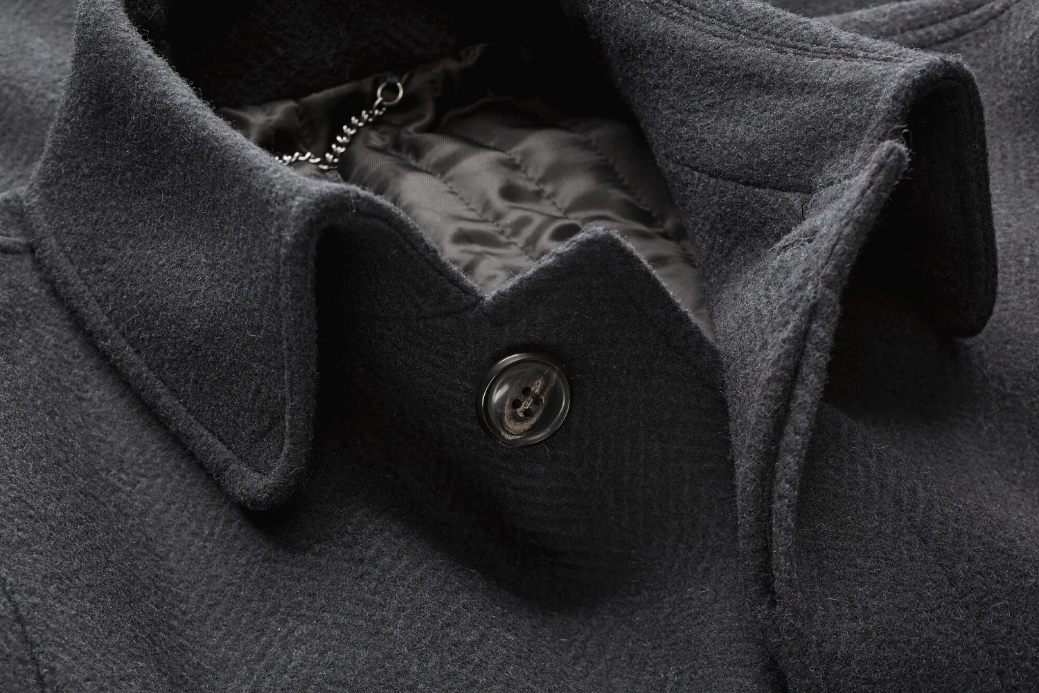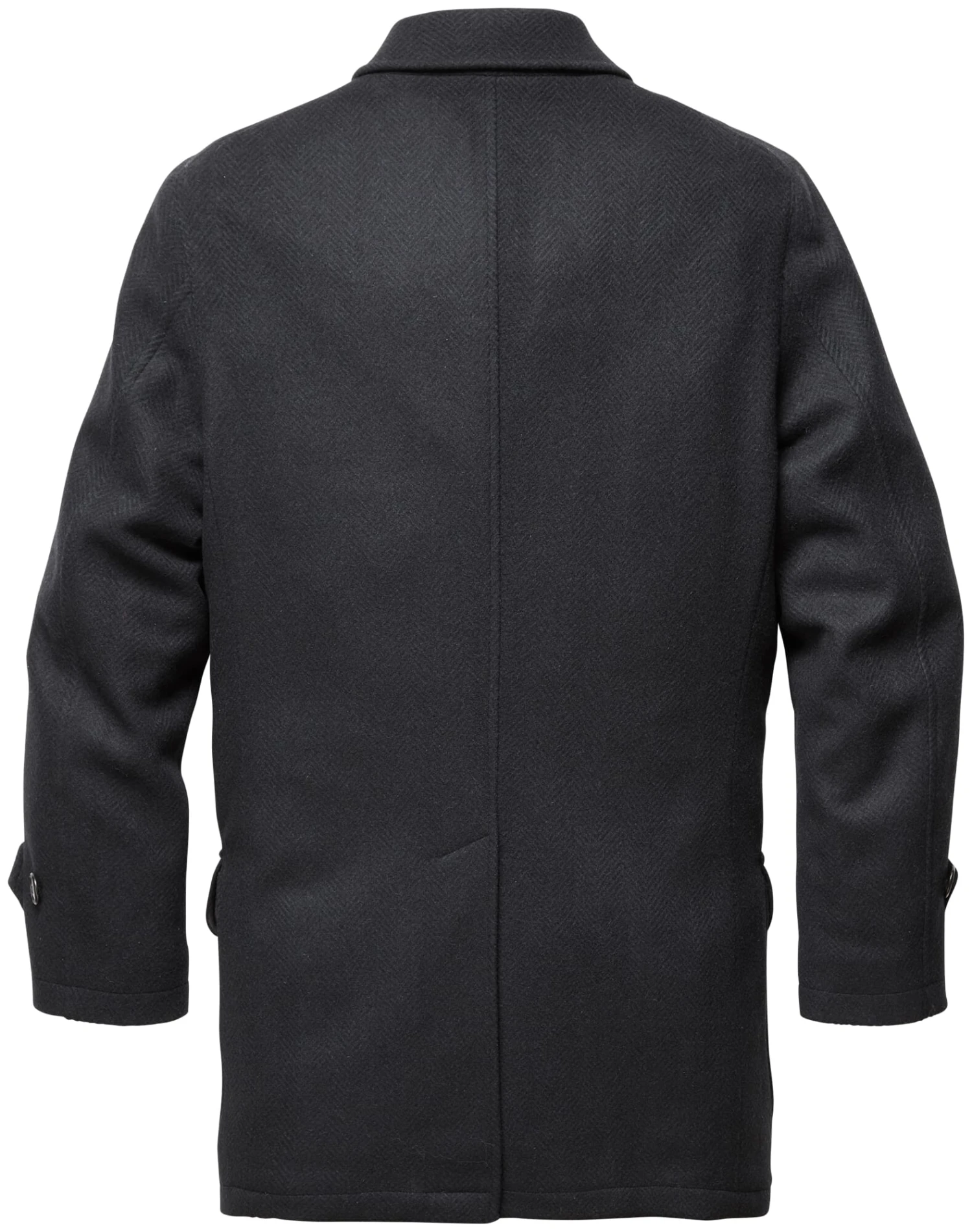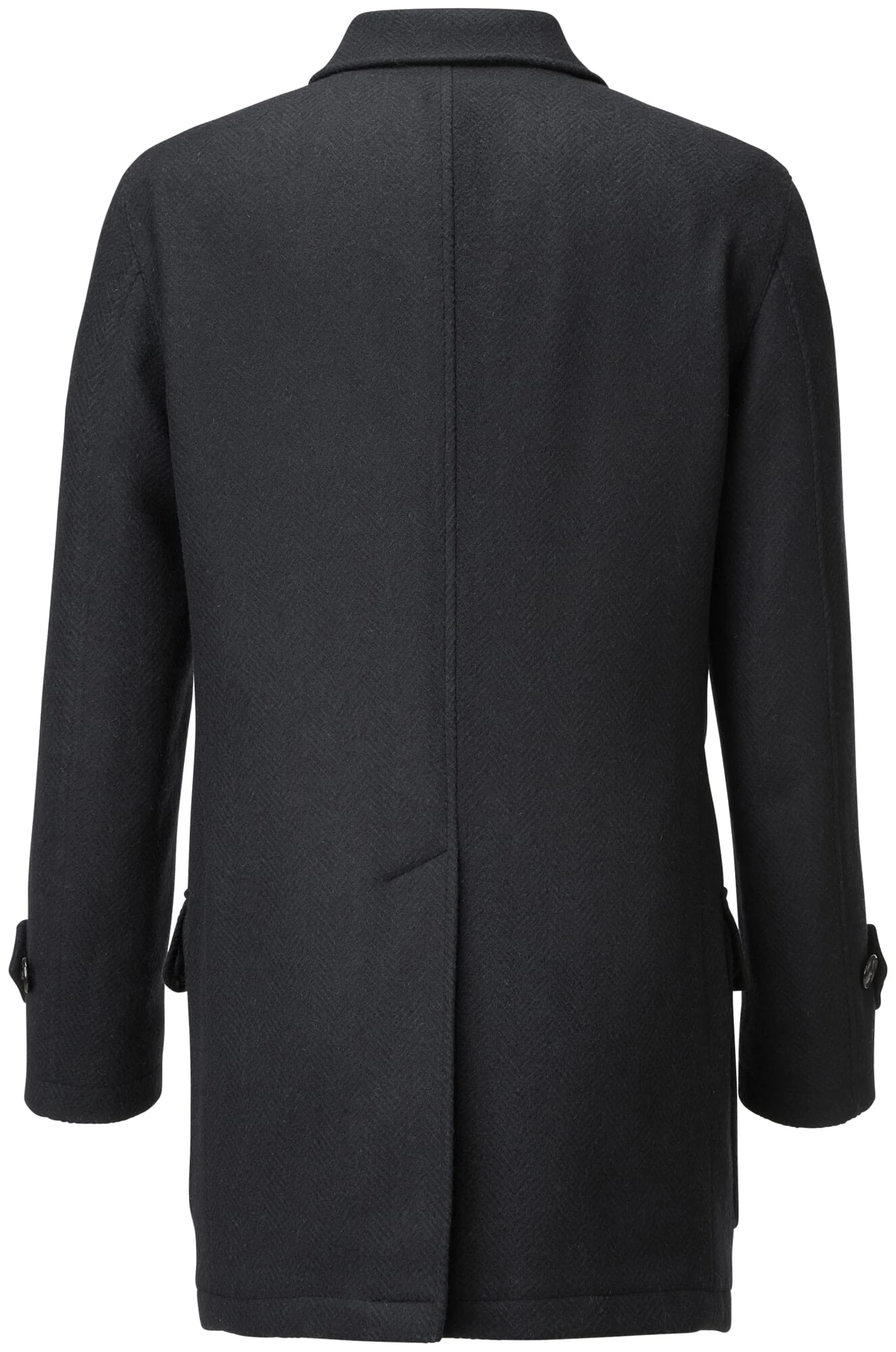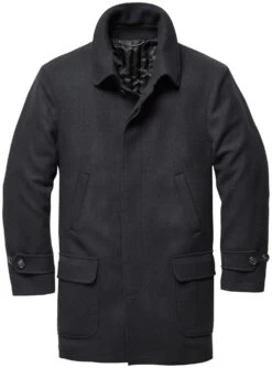 Lange jas van warme wol met een verborgen knoopsluiting. Onder de stof zit een katoenen vulling die met een stiksel in de lengterichting over de gladde viscose voering wordt gehouden. Aan de buitenkant heeft de jas twee opgestikte klepzakken en twee steekzakken op borsthoogte. Aan de binnenkant zitten twee binnenzakken in de stoffen buitenvoering voor kleine voorwerpen voor dagelijks gebruik. Verdeelnaden voor en achter geven het jack vorm, een rugopening verhoogt het draagcomfort en een overlangse verdeelnaad achter slankt het optisch af.