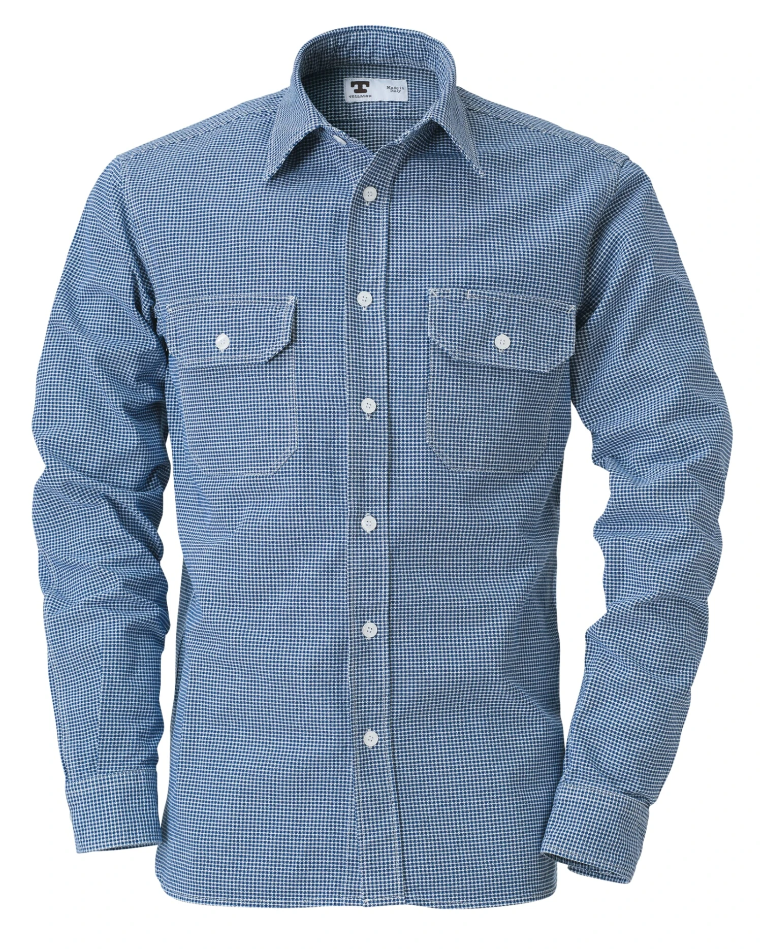 In de vorm van een klassiek werkoverhemd, is ook deze door Tellason gemaakt van een overeenkomstige stof. De gesanforiseerde en zacht afgewerkte stof is afkomstig van de weverij Kröner & Schlikker in Nedersaksen, die gespecialiseerd is in stoffen voor gilde- en werkkleding. Het heeft een blauw en wit pepita patroon. Het overhemd is voorzien van twee klepzakken met knoopsluiting.