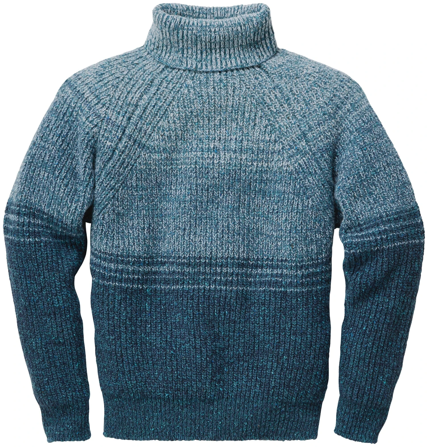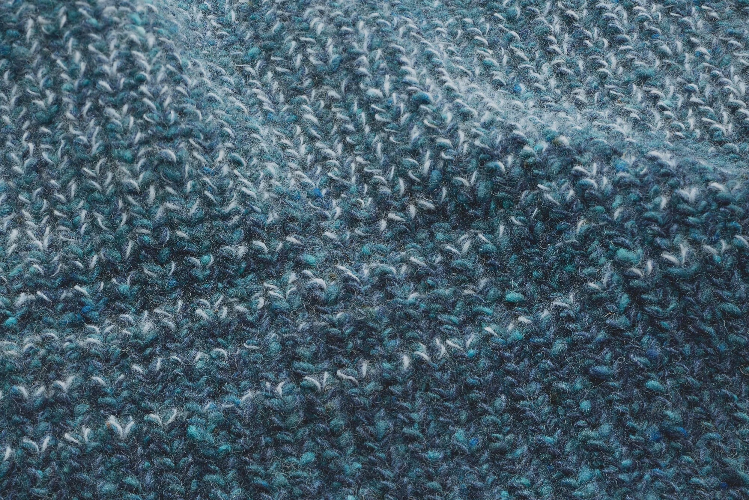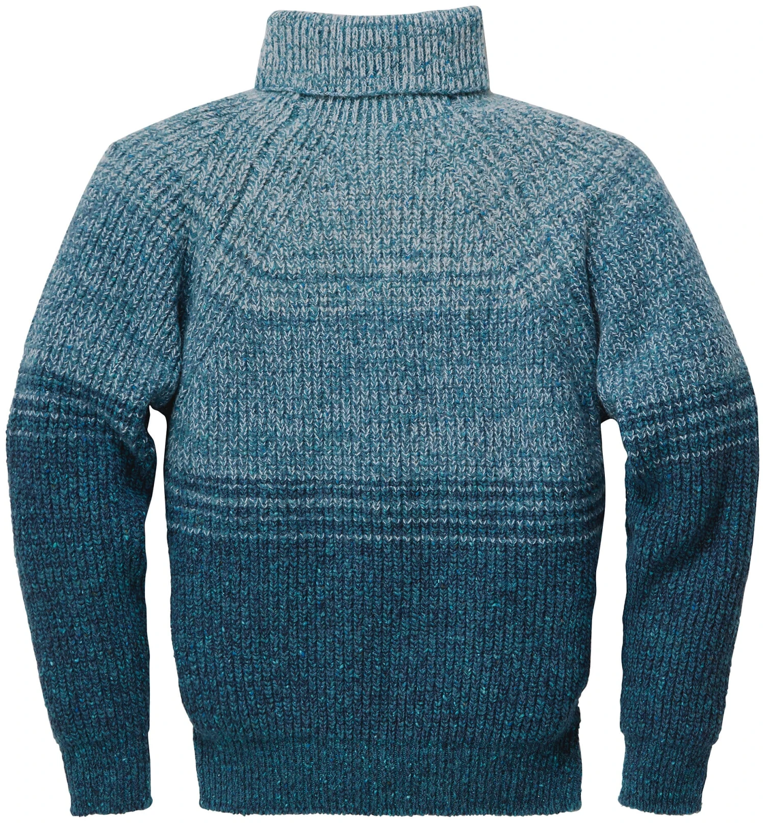 Inis Meáin maakt deze warme trui van garens van scheerwol die afkomstig zijn uit Donegal, Ierland. Het zijn gemêleerde garens gebreid in twee gekleurde blokken – licht in de borst, bovenarmen en schouders, donker daaronder. Een levendige afwisseling van smalle strepen markeert de overgang van de kleuren. De trui is gepatenteerd gebreid en bewerkt met raglanmouwen, geribde gebreide manchetten maken de hals, mouwen en romp af.