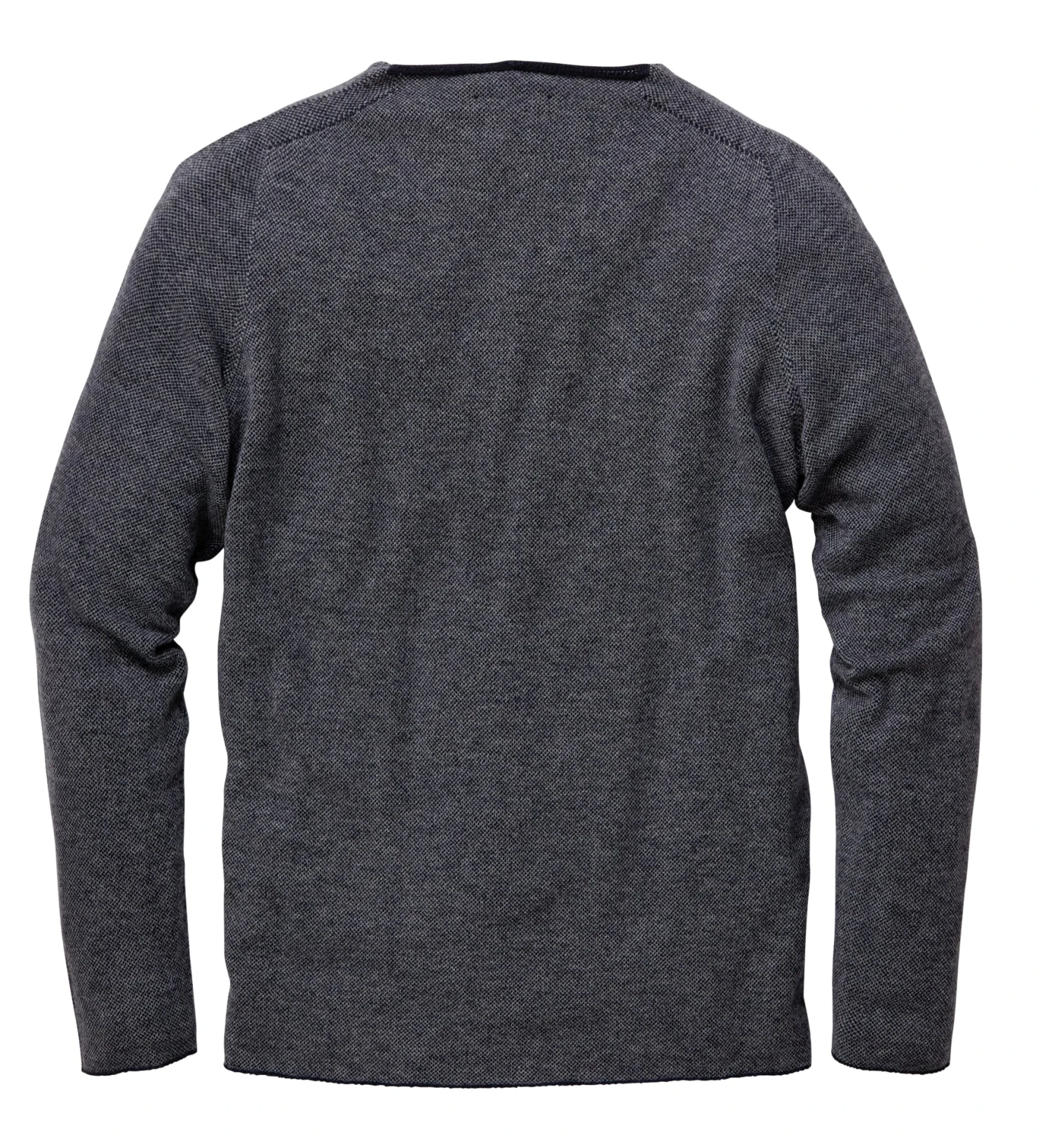 De gemêleerde garens van deze trui zijn gemaakt van zuivere gecertificeerde biologische merinowol. De gebreide stof, die een fijne wafelstructuur heeft, is dienovereenkomstig fijn, zacht en verwarmend. Smalle rolzomen vormen de afwerking bij de hals, mouwen en romp van de trui.