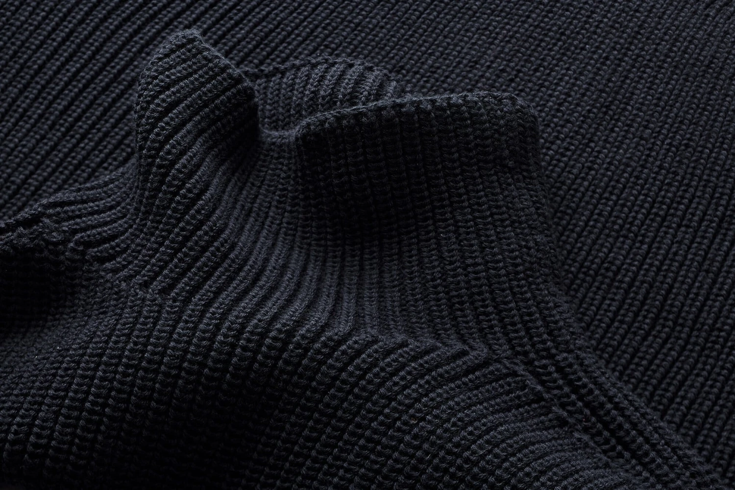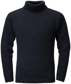 Trui uitgevoerd in plastic patentbreisel met een variabele kraag die als staande of col kan worden gedragen.