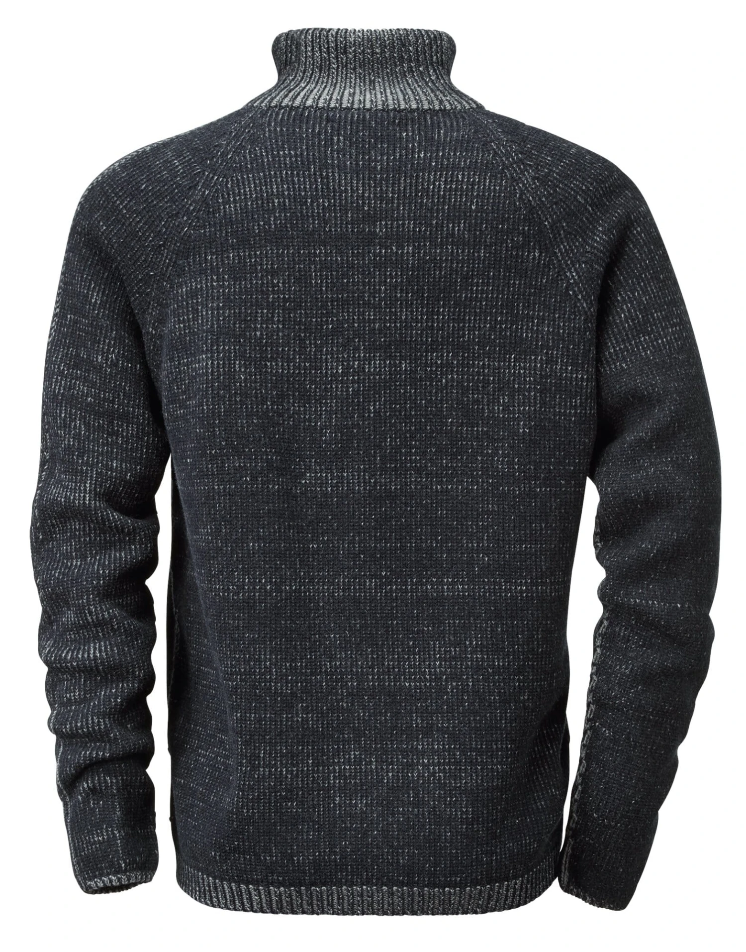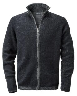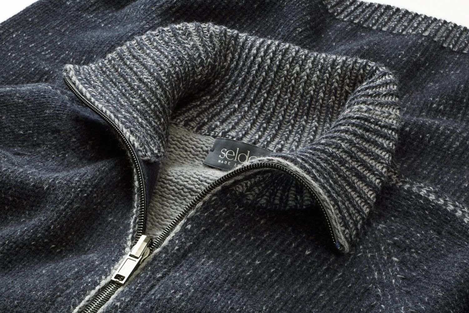 Naadloos en verguld gebreid jack met geribde boorden aan de opstaande kraag, mouwen en romp. Het breiwerk van biologische scheerwol is wat grover, wat overeenkomt met het robuuste karakter van de jas.