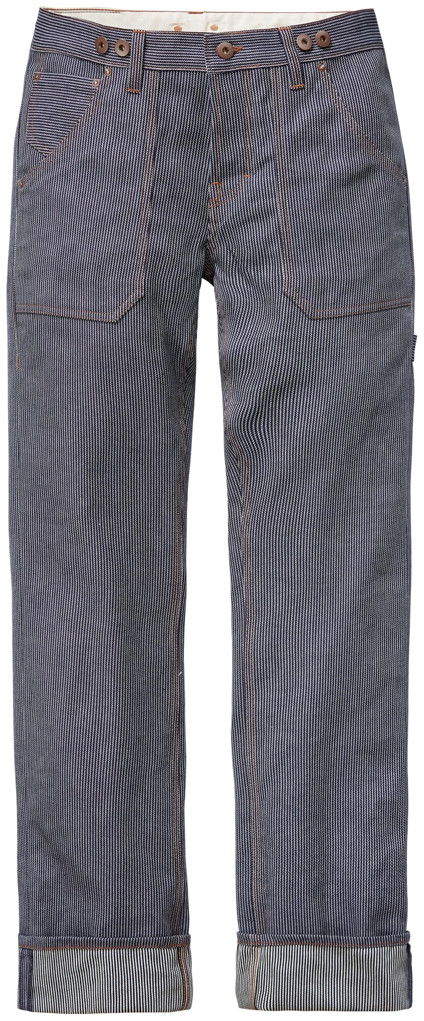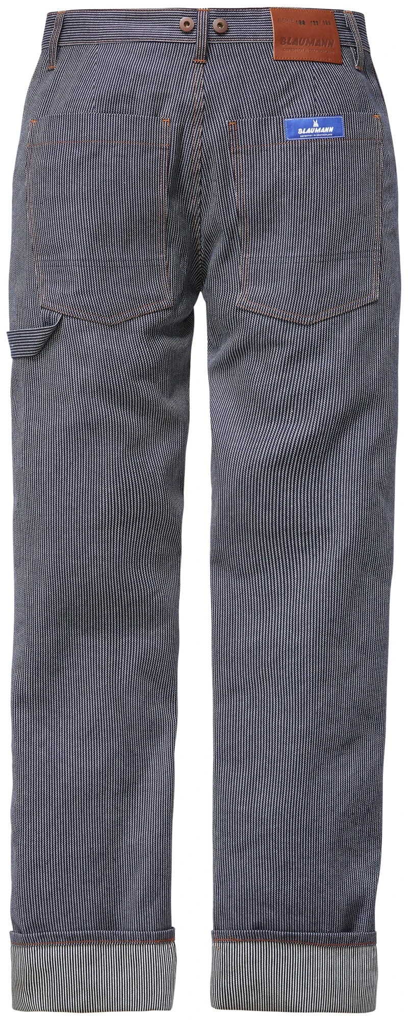 Blaumann betrekt de kenmerkende en contrasterende visgraatstof voor deze broek van een Japanse weverij. Ook de snit is in overeenstemming met het robuuste materiaal: hij is gemodelleerd naar een klassieke werkbroek in 5-pocketstijl met een extra hamerlus. De broek wordt gesloten door middel van een knoopsluiting en knoop, en is voorzien van riemlussen en bretelknopen.