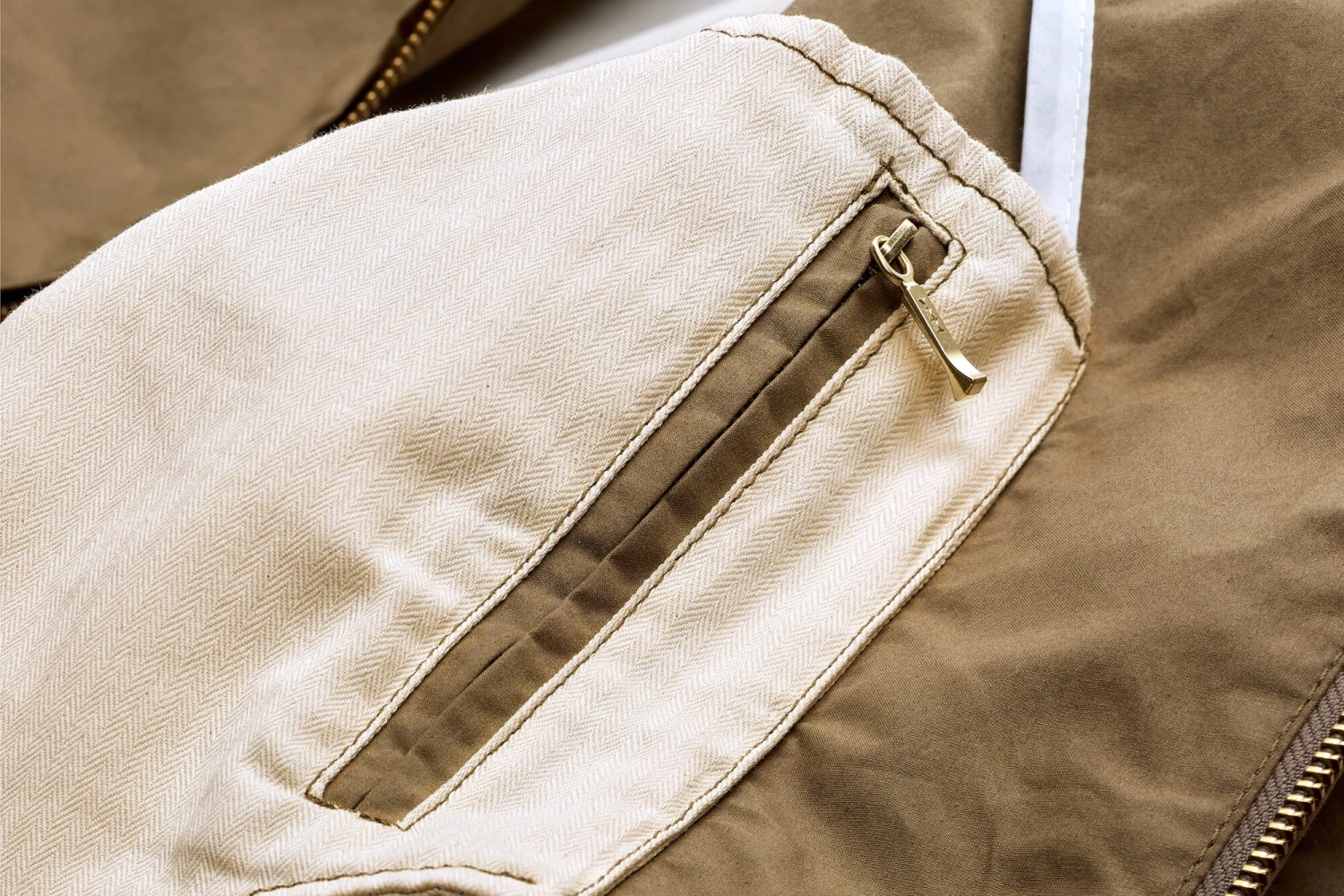 100% katoen. Gedeeltelijke voering 100% katoen. Bevat niet-textiele delen van dierlijke oorsprong: Lederen rits. Metalen ritsen, plastic knopen. Gemaakt in Italië. Ruglengte in maat 52 = 65 cm.