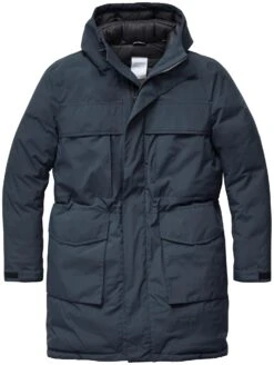 Bij de buitenstof, voering en vulling van deze verwarmende, winddichte, waterdichte en ademende parka draait alles om recycling. Terwijl de buitenstof en de voering van gerecycled polyamide zijn gemaakt, is de vulling van gerecycled polyester. Het doordachte stuk overtuigt ook qua functie: de opvallende tweewegrits kan hoog gesloten worden. Daarboven zit een breed winddicht paneel met verborgen metalen magneetknopen. Goed aansluitende gebreide manchetten in de mouwopeningen houden wind en kou effectief buiten, en de breedte van de mouwopeningen kan bovendien worden aangepast via verstelbare bandjes met klittenband. Een intern elastisch koord met koordstoppers ter hoogte van de taille zorgt voor aanpassing van de wijdte, en ook de opening van de capuchon kan worden geregeld door middel van een elastisch koord in het trekkoord en koordstoppers. Verschillende zakken bieden ruimte voor kleine spullen voor dagelijks gebruik: Aan de buitenkant zijn er twee grote opgestikte klepzakken, twee schuine paspelzakken en twee ingezette borstzakken met verticale, verborgen ritsen. Aan de binnenkant zijn er twee zakken met verticale, in de naad verborgen ritsen en een opgezette zak met klep en klittenbandsluiting.