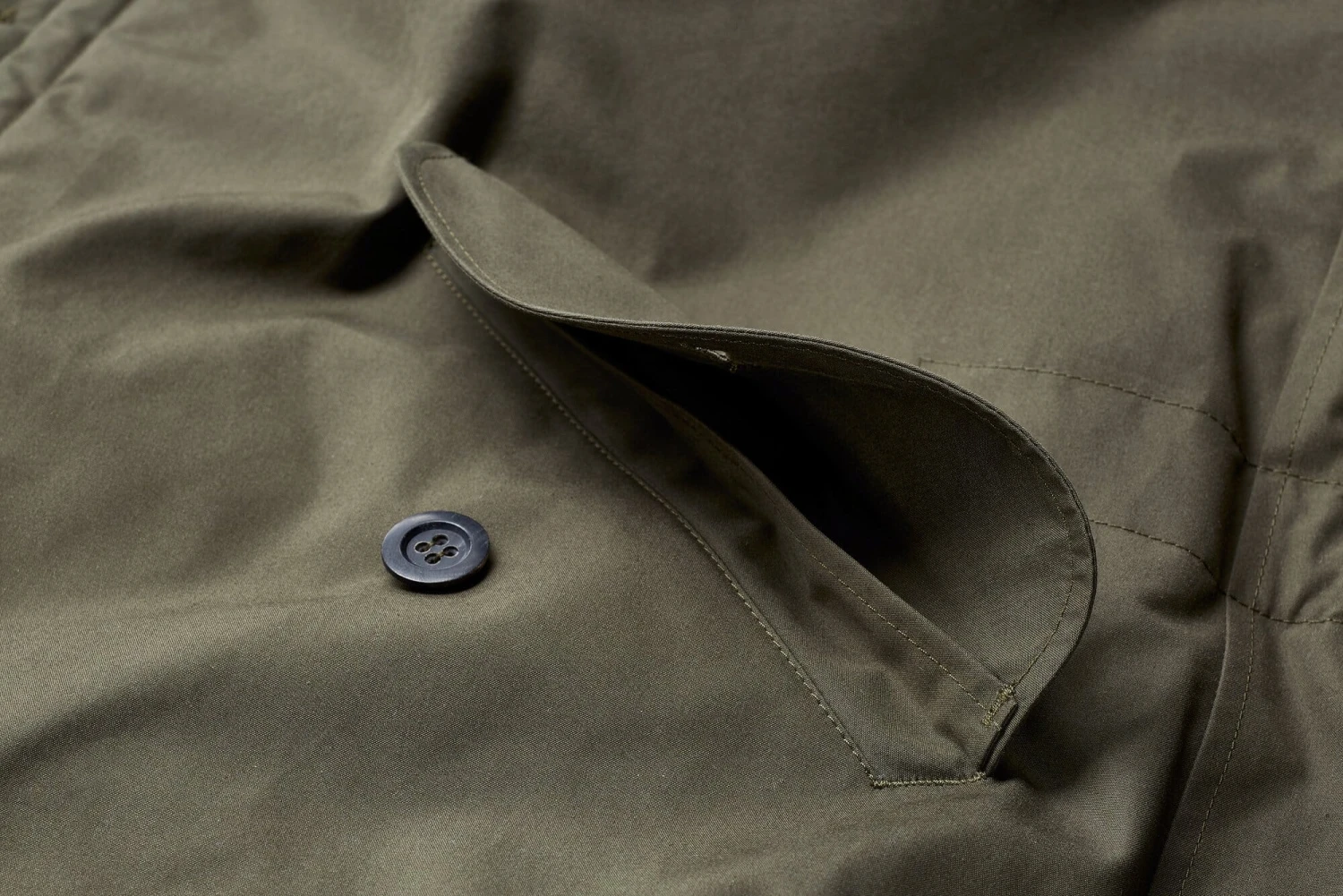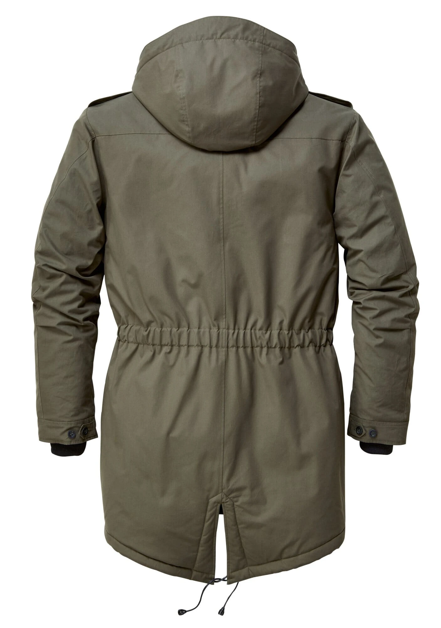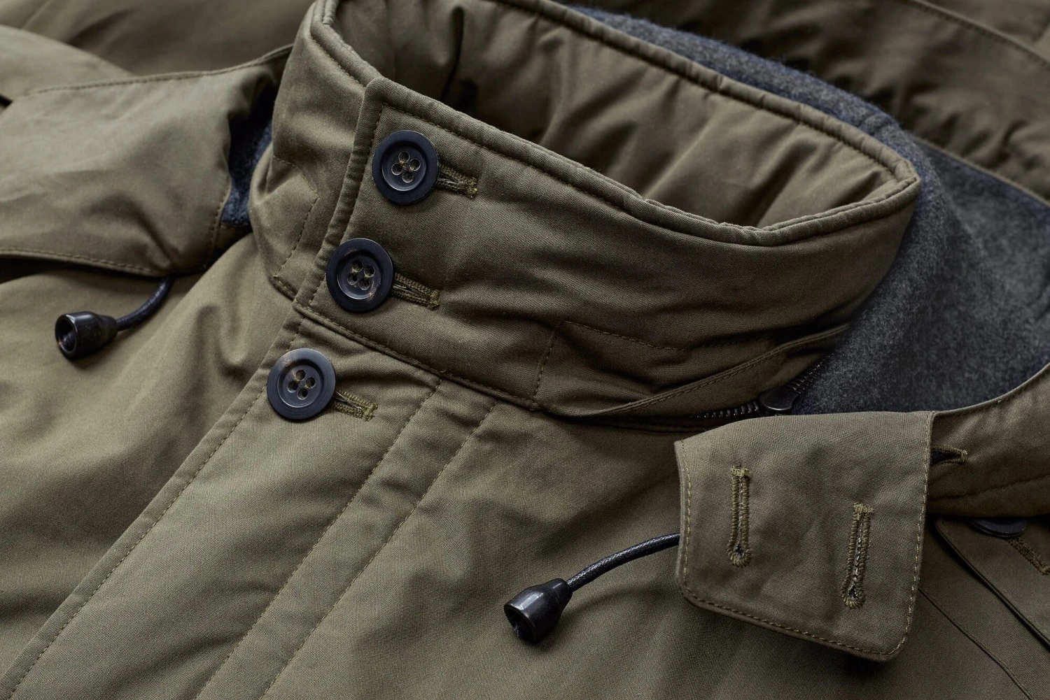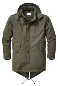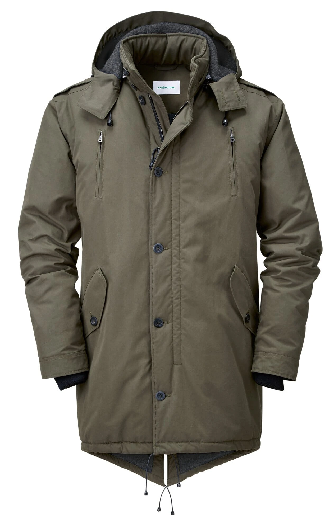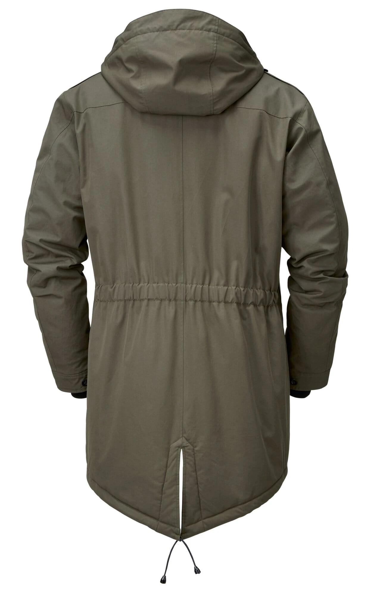 Duidelijk een parka qua snit: vrij lang met een zwaluwstaart en capuchon. We hebben het in een wintervaste en gedetailleerde afwerking. Er is een knoopbaar paneel over de tweewegrits van Riri, en de mouwopeningen hebben nauwsluitende, winddichte gebreide manchetten. De afneembare capuchon is gewatteerd, net als de hele parka. Het verwarmende effect van deze vulling wordt nog versterkt door de wollen voering. Het buitenmateriaal van de parka is EtaProof®, een matig met was geïmpregneerde en zeer dicht geweven stof van biologisch katoen. Bij contact met vocht zwellen de vezels op en parelen waterdruppels op het oppervlak. Met trekkoorden in de capuchon, ter hoogte van de taille en aan de zoom van de romp kan de wijdte individueel worden aangepast. Twee ingezette klepzakken met knoopsluiting aan de voorkant, twee verticaal ingezette zakken met rits op de borst en twee binnenzakken houden kleine spullen voor dagelijks gebruik.