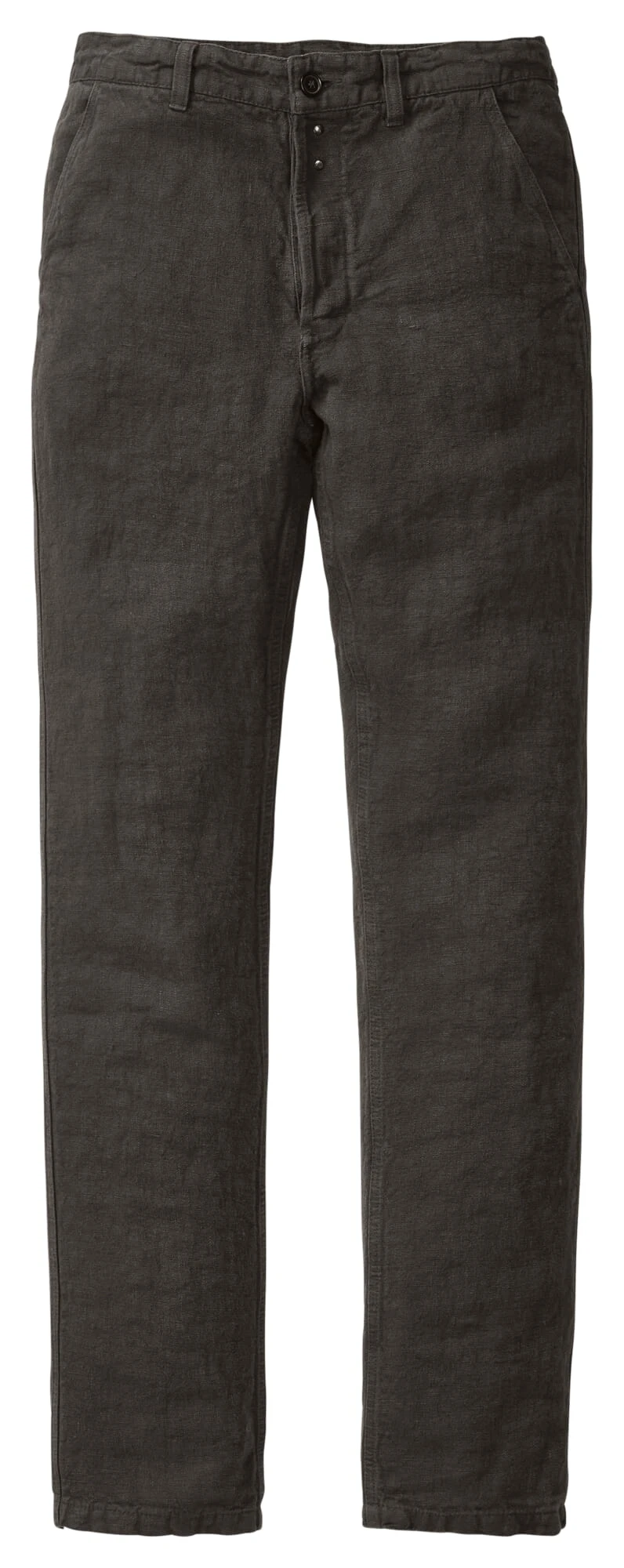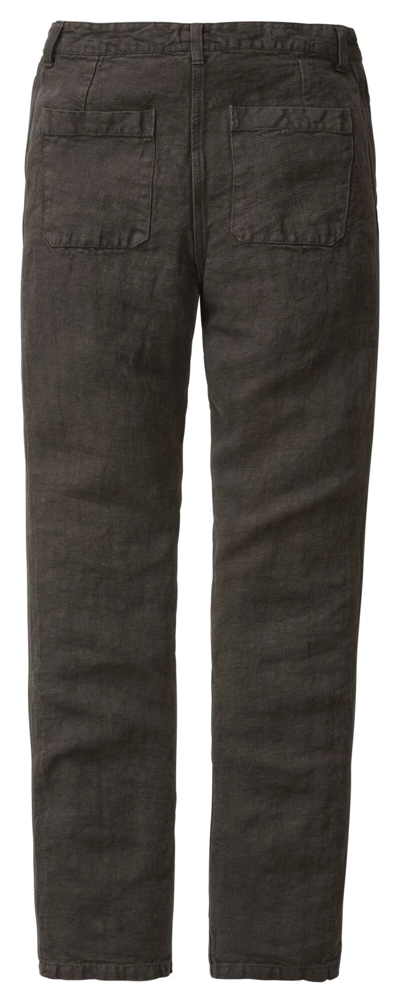 Ongevoerde linnen broek die sluit door middel van een knoopsluiting, knoop en veiligheidshaak. De broek is voorzien van twee steekzakken en twee achterzakken.