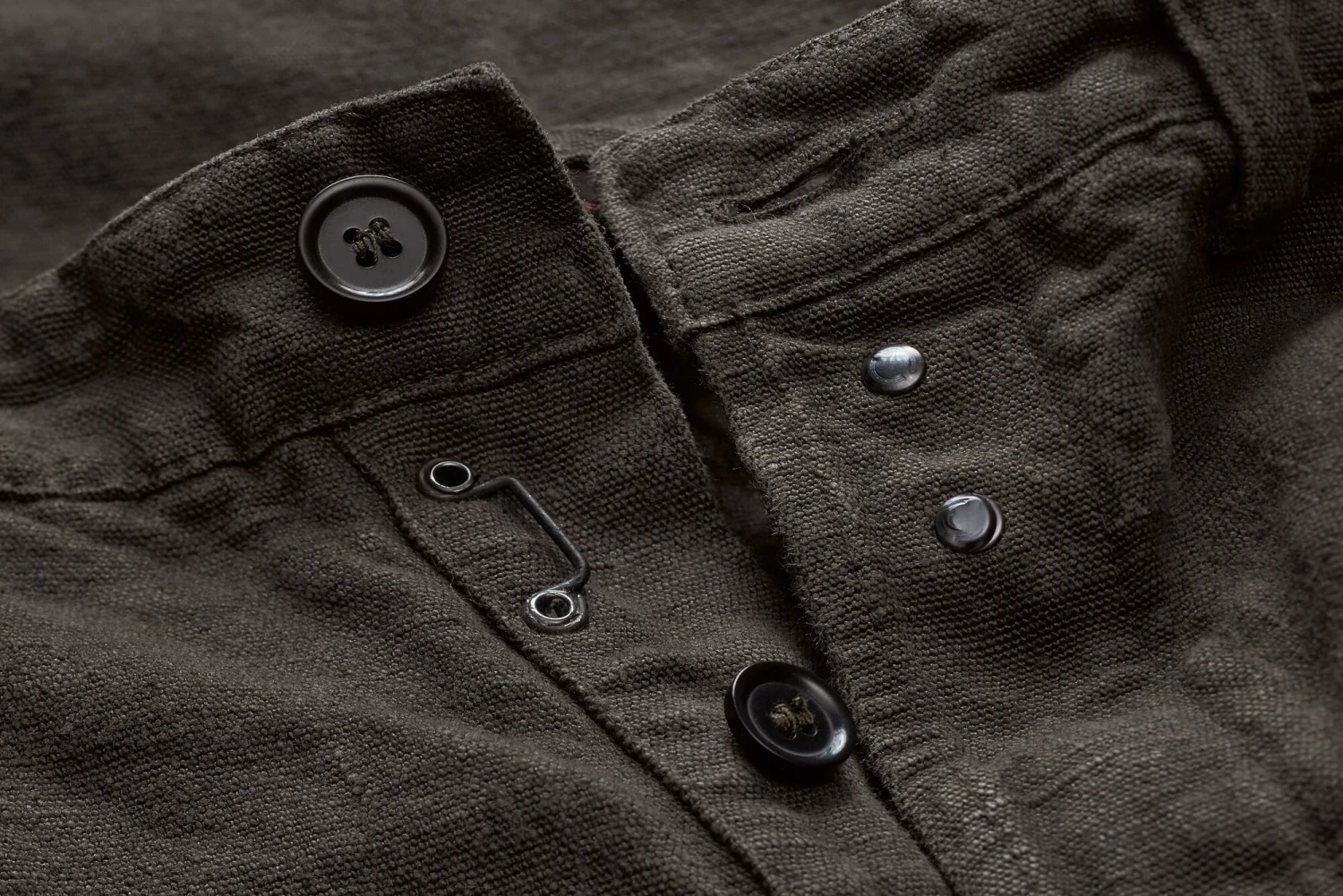 100% linnen. Plastic knopen, metalen haak en oog. Gemaakt in Frankrijk. Binnenbeenlengte 84 cm.