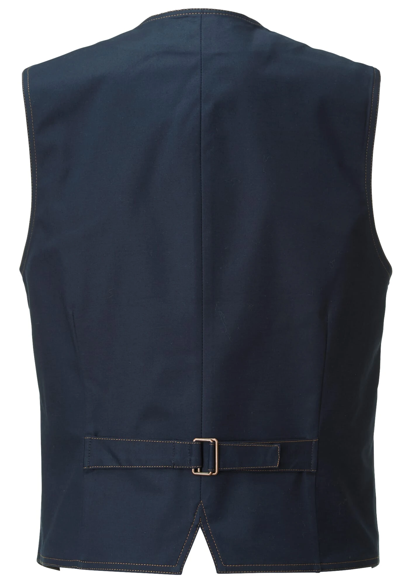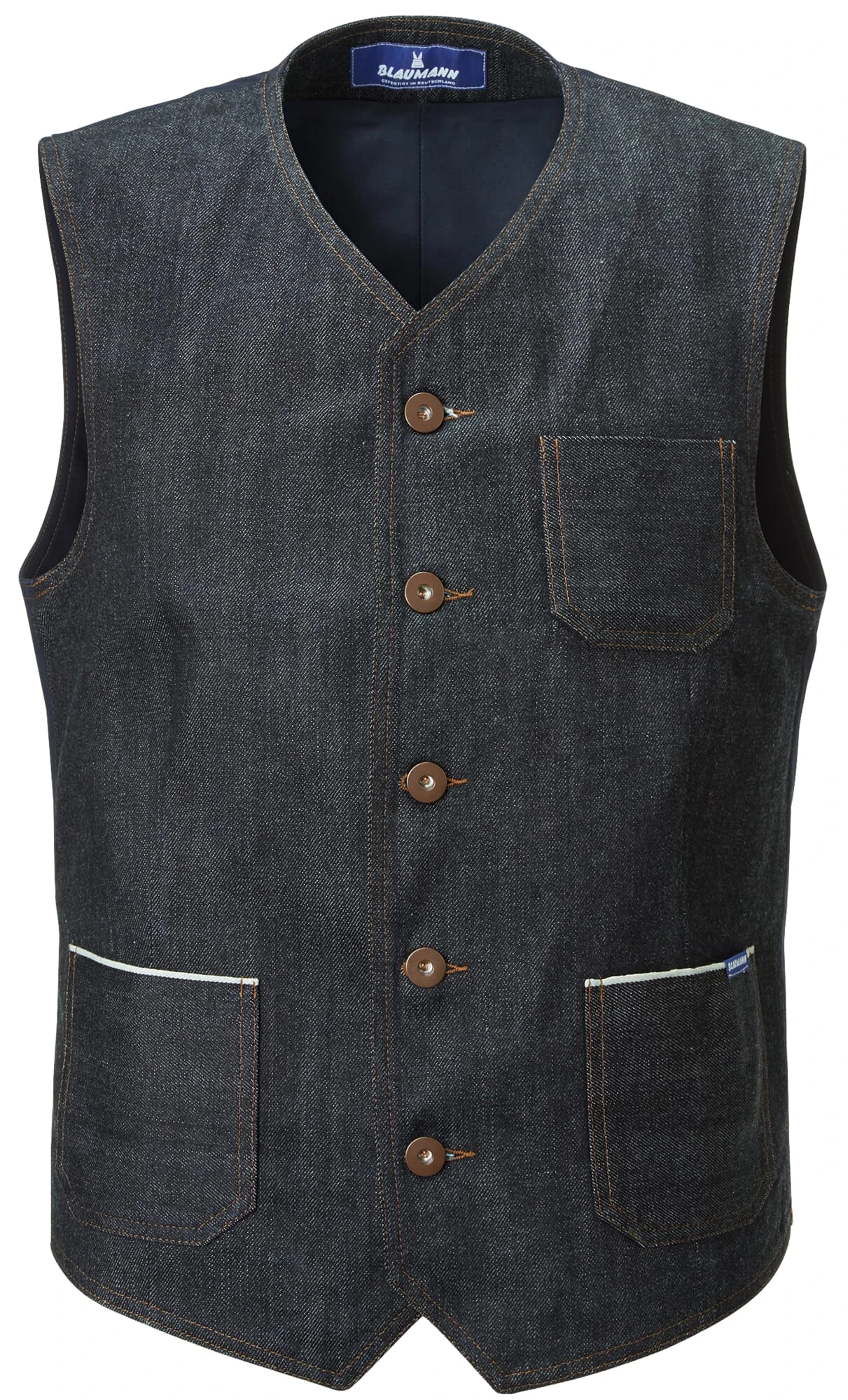 Het voorpand en de drie opgestikte zakken van dit gilet zijn gemaakt van stevig en zwaar denim van Japanse oorsprong. De achterkant is gemaakt van donkerblauwe katoenen stof. Net als bij een klassieke spijkerbroek zijn de knopen van het gilet van metaal. Een vastgemaakte stang met metalen gesp aan de achterkant zorgt voor een gematigde aanpassing van de breedte.