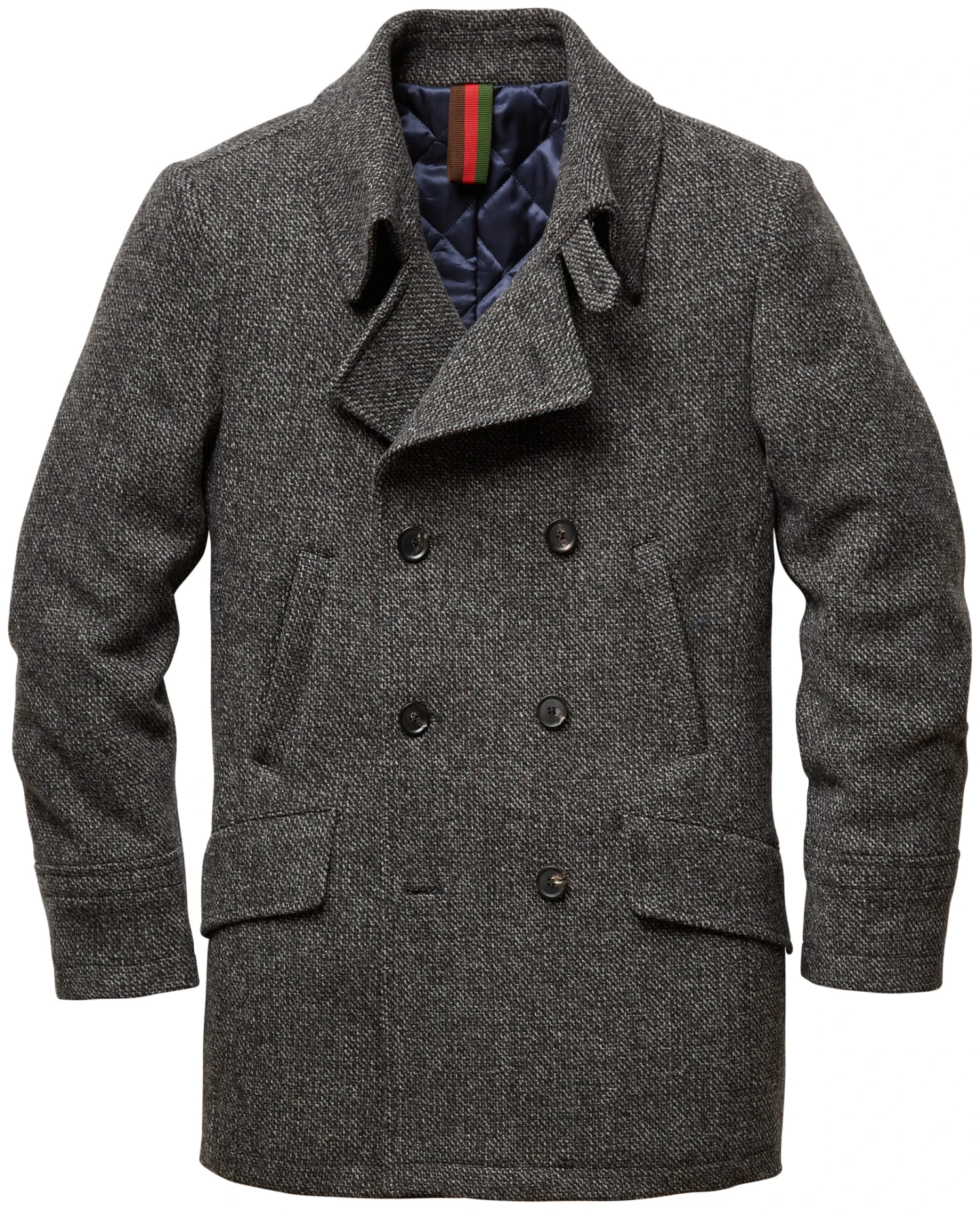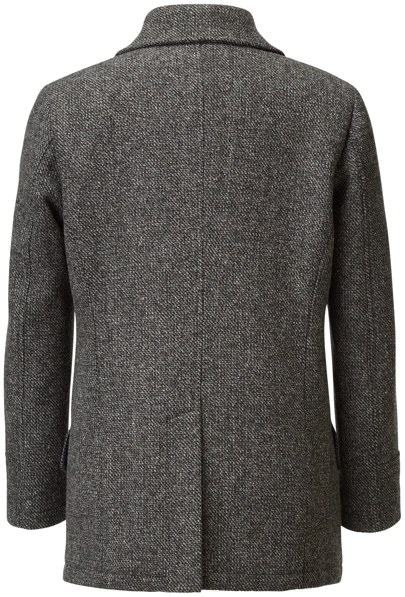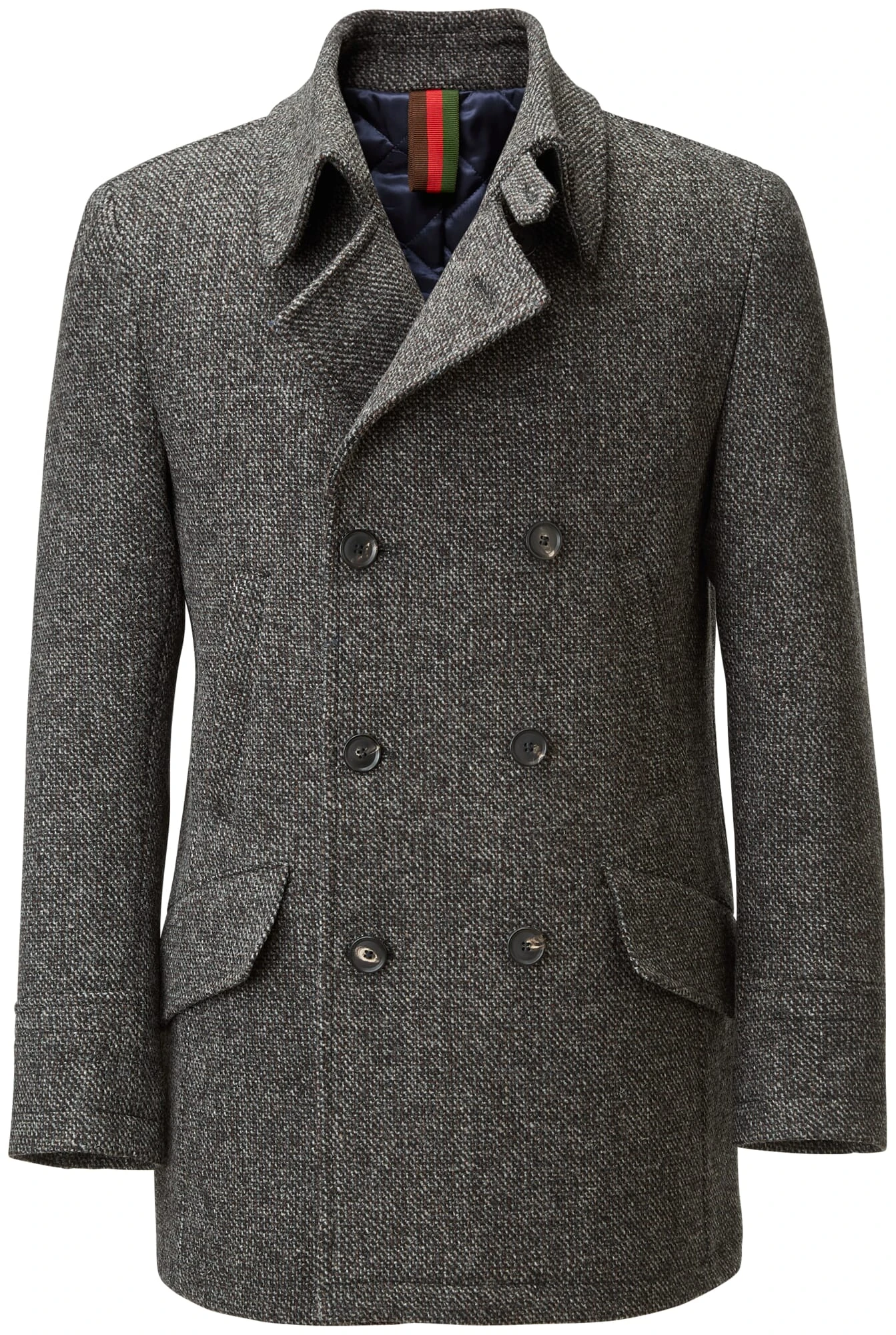 Jassen met twee rijen knopen houden de borst warm dankzij de grote overlapping van de stofpanelen. Zo ook dit model met een silhouet met zes knopen, gemaakt van sterke wol in een opvallende salt-and-pepper look. Onder de stof ligt een katoenen vulling die op zijn plaats wordt gehouden met geruite naden die over de gladde viscose voering lopen. Aan de buitenkant heeft de jas twee opgestikte klepzakken en twee steekzakken op borsthoogte. Aan de binnenkant zitten twee binnenzakken met rits in de buitenste stoffen bekleding voor kleine voorwerpen voor dagelijks gebruik. Verdeelnaden voor en achter geven het jack vorm, een rugopening verhoogt het draagcomfort en een overlangse verdeelnaad achter slankt het optisch af.