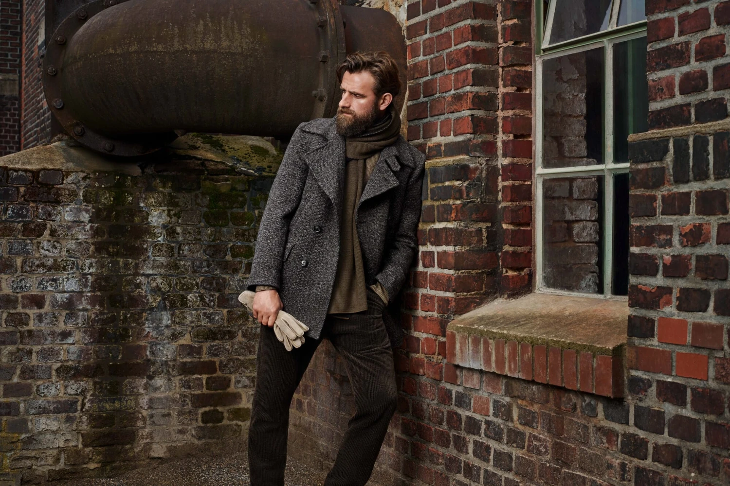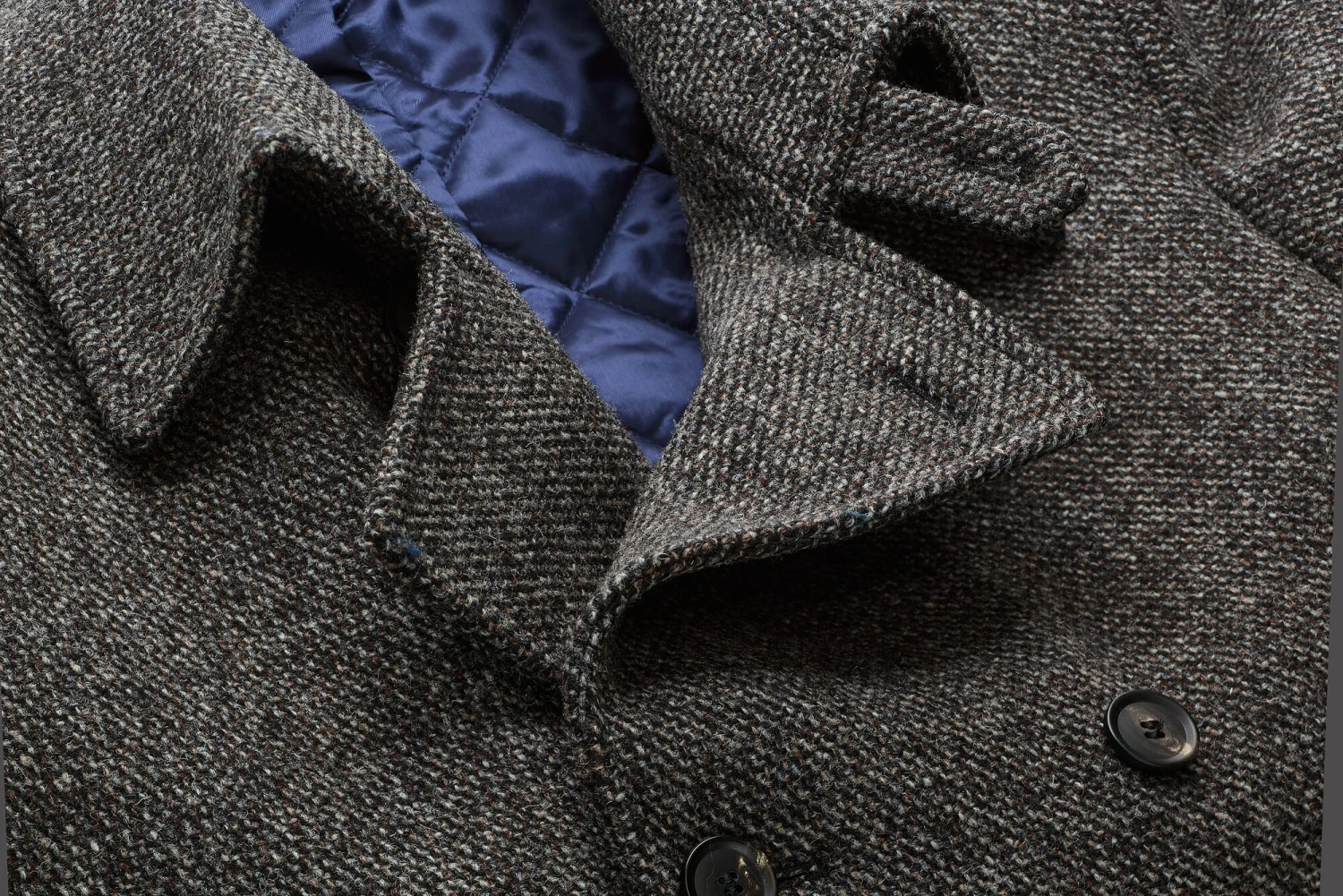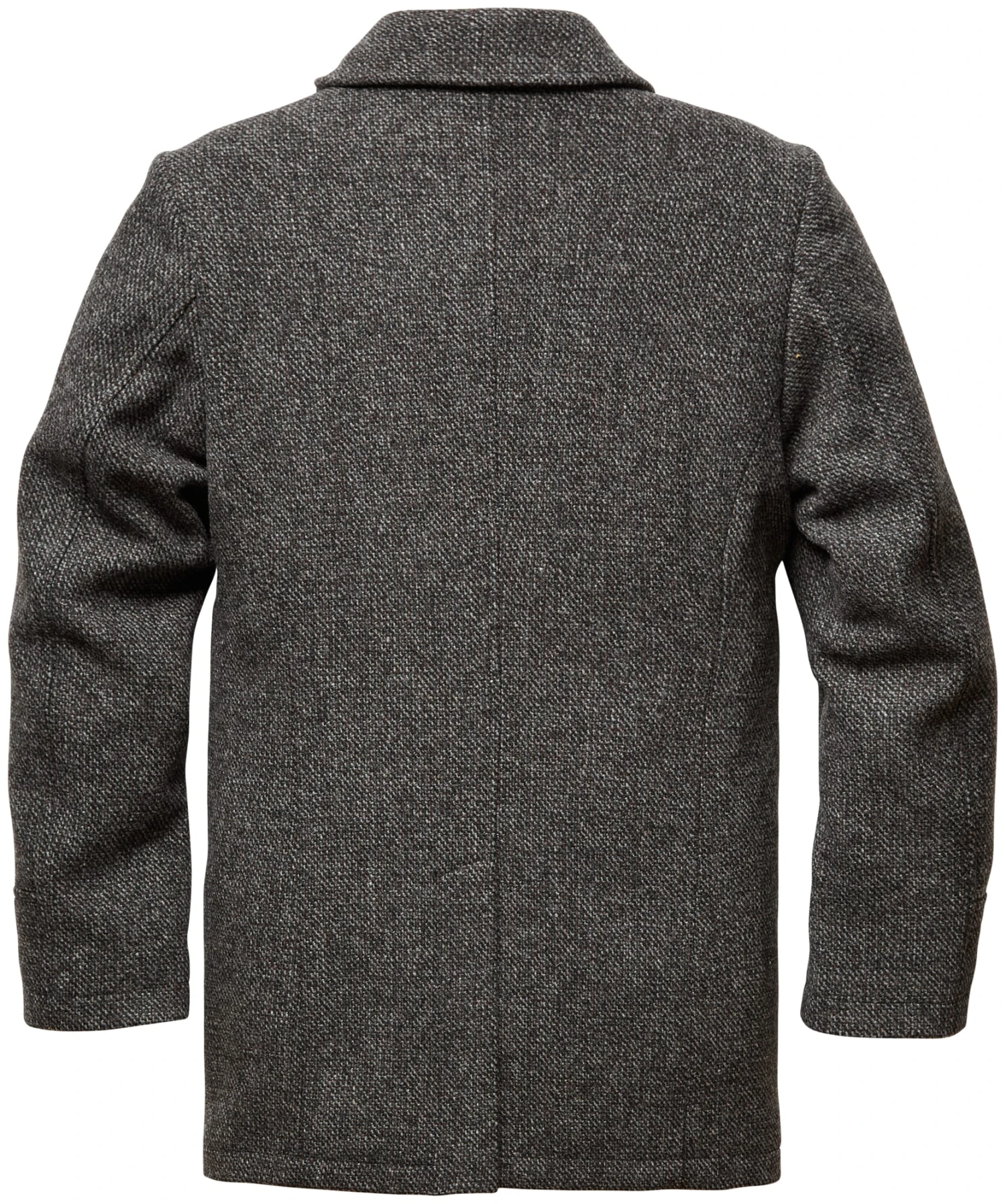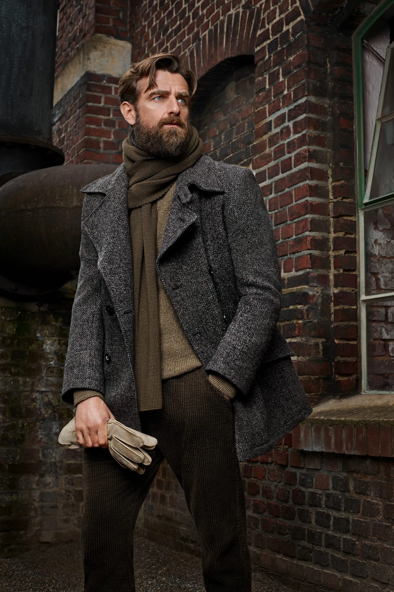 Jassen met twee rijen knopen houden de borst warm dankzij de grote overlapping van de stofpanelen. Zo ook dit model met een silhouet met zes knopen, gemaakt van sterke wol in een opvallende salt-and-pepper look. Onder de stof ligt een katoenen vulling die op zijn plaats wordt gehouden met geruite naden die over de gladde viscose voering lopen. Aan de buitenkant heeft de jas twee opgestikte klepzakken en twee steekzakken op borsthoogte. Aan de binnenkant zitten twee binnenzakken met rits in de buitenste stoffen bekleding voor kleine voorwerpen voor dagelijks gebruik. Verdeelnaden voor en achter geven het jack vorm, een rugopening verhoogt het draagcomfort en een overlangse verdeelnaad achter slankt het optisch af.