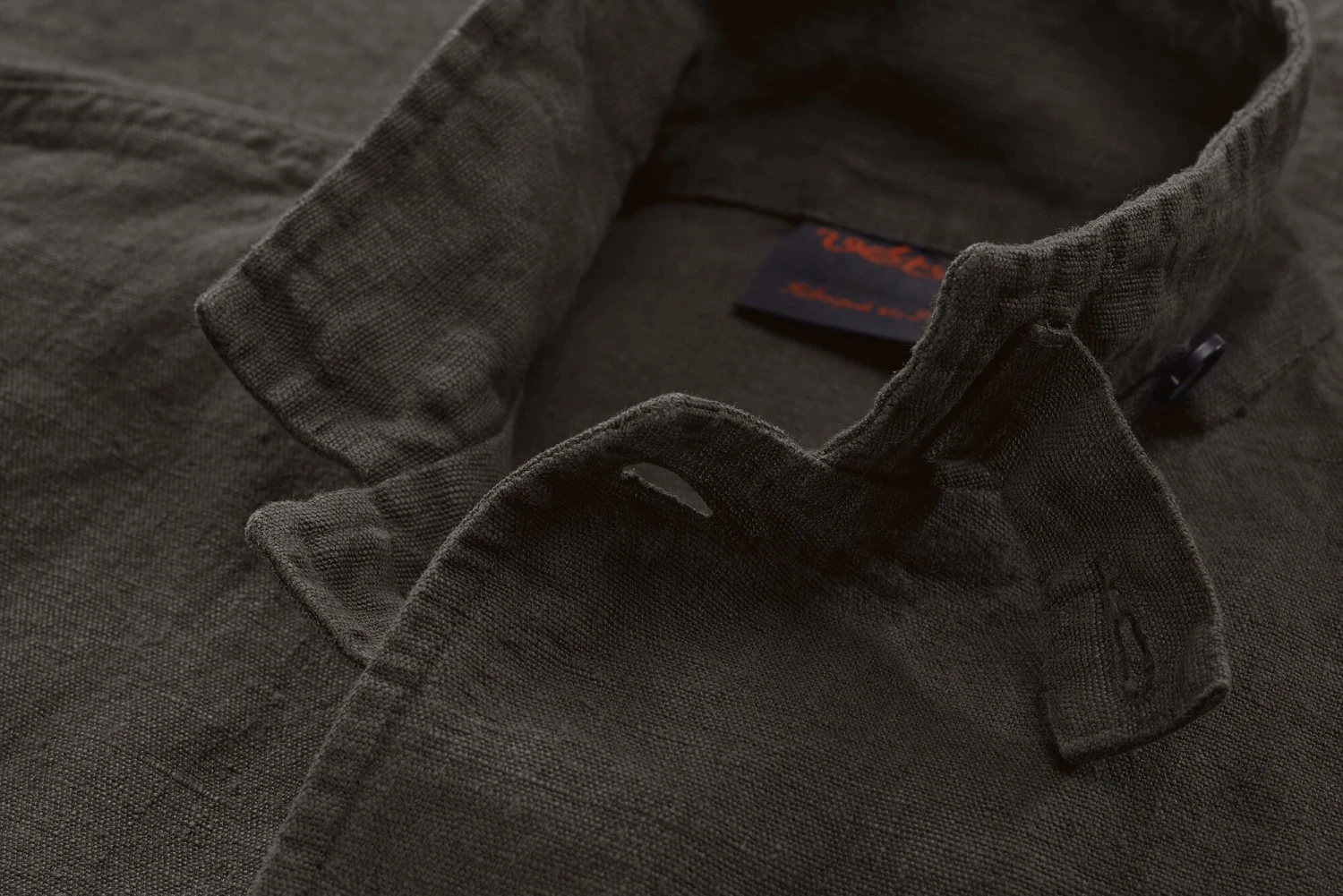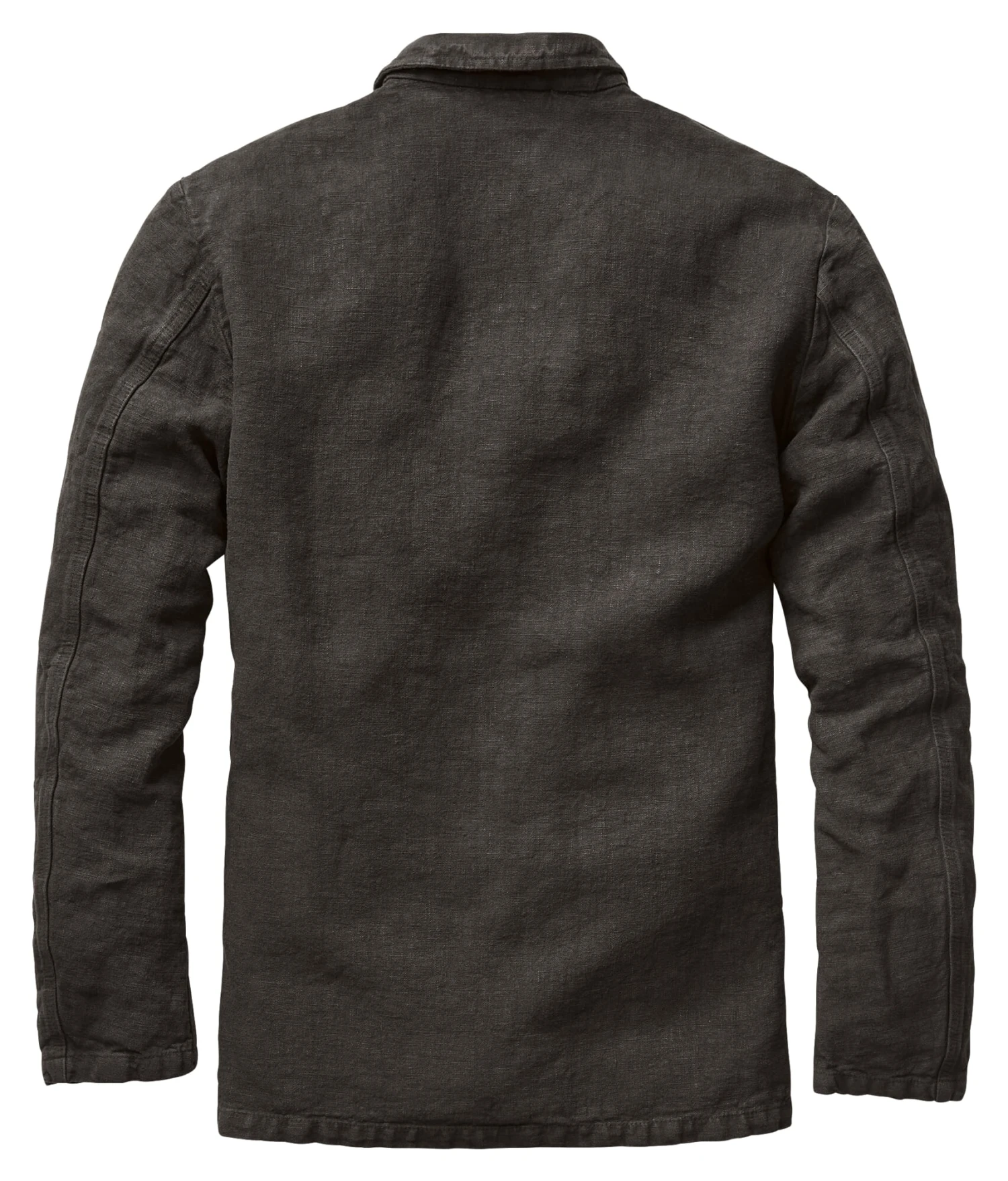 100% linnen. Ongevoerd. Plastic knoppen. Gemaakt in Frankrijk. Ruglengte in maat 52 = 76 cm.