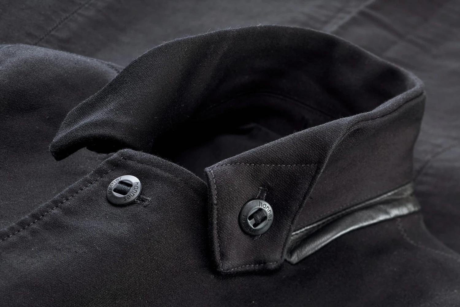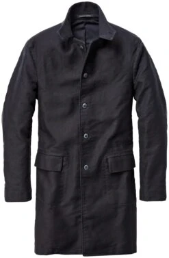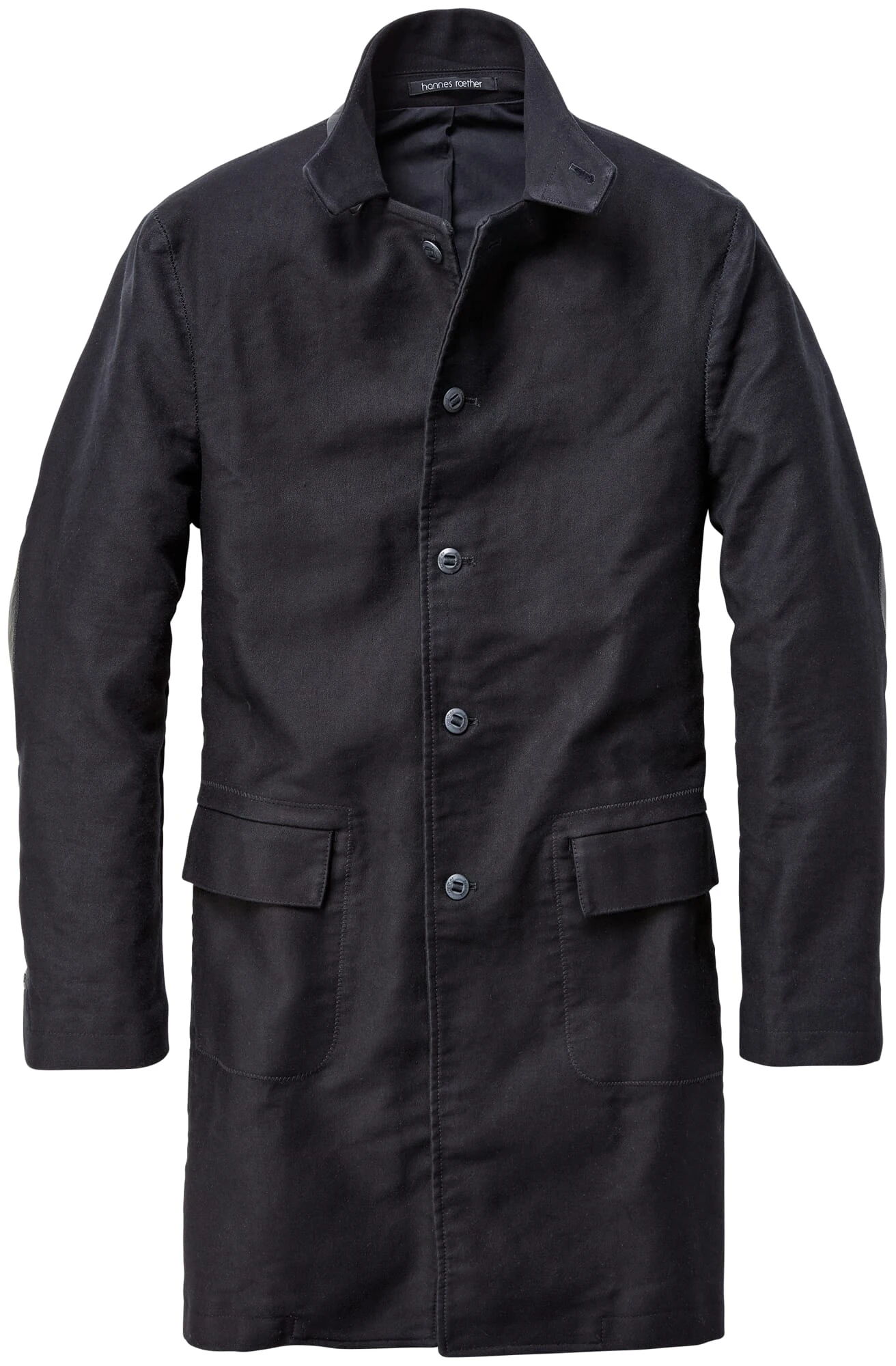 Twisted double pilot wordt geweven met ongewoon sterke kettinggarens en een hoge dichtheid van inslaggarens. Het heeft een glad, licht glanzend oppervlak en is bijna onverwoestbaar – daarom werd er vroeger bijna alleen werk- en beschermende kleding van gemaakt. Vanuit deze traditie heeft Hannes Roether deze karaktervolle jas ontworpen. Het is versterkt aan de kraag en de ellebogen met lamsvel en heeft manchetten met knopen en twee klepzakken aan de onderkant en twee binnenzakken, één met een horizontale en één met een verticale opening.