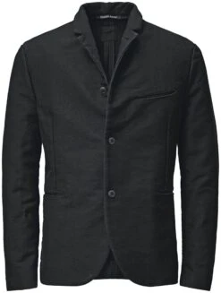 Twisted double pilot wordt geweven met ongewoon sterke kettinggarens en een hoge dichtheid van inslaggarens. Het heeft een glad, licht glanzend oppervlak en is bijna onverwoestbaar – daarom werd er vroeger bijna alleen werk- en beschermende kleding van gemaakt. Dit jasje van Hannes Roether staat in dezelfde traditie en heeft dezelfde uitstraling als een werkjasje. Het heeft een lichte “used look”. Darts aan de voorzijde geven het jasje vorm, een opvallende middensplit aan de achterzijde maakt het optisch slanker en langer. Twee rugsplitten verhogen het draagcomfort. Drie steekzakken bieden ruimte voor kleine voorwerpen voor dagelijks gebruik.