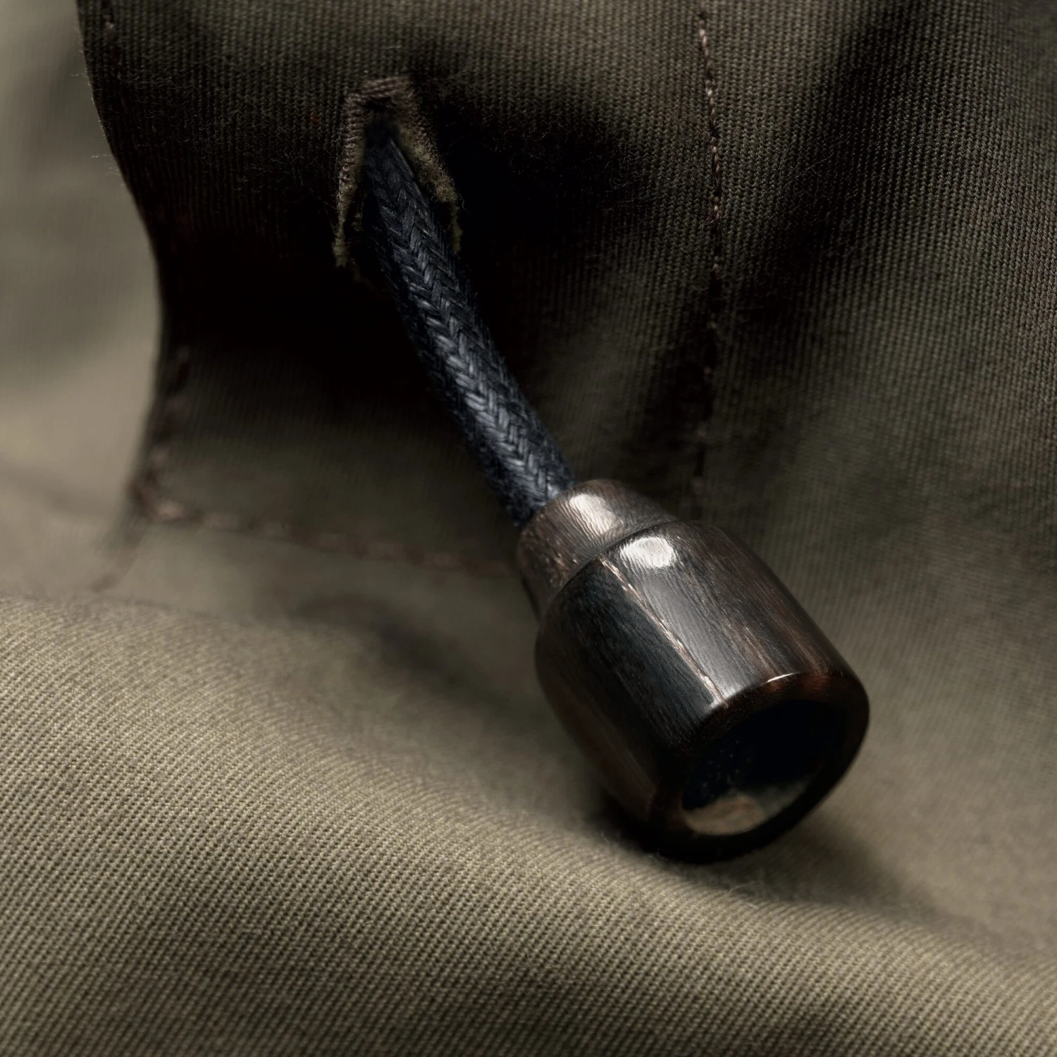 100% katoen (EtaProof®). Impregnatie op basis van was. Bevat niet uit textiel bestaande delen van dierlijke oorsprong. Echte hoornen knopen en koordstoppers. Klepzakken, mouwzoom met elastiek in koord, binnenkoord verstelbaar in de taille met knopen. Riri metalen ritsen, metalen gesp op capuchon. Gemaakt in Polen. Ruglengte in maat L (52) = 110 cm.
