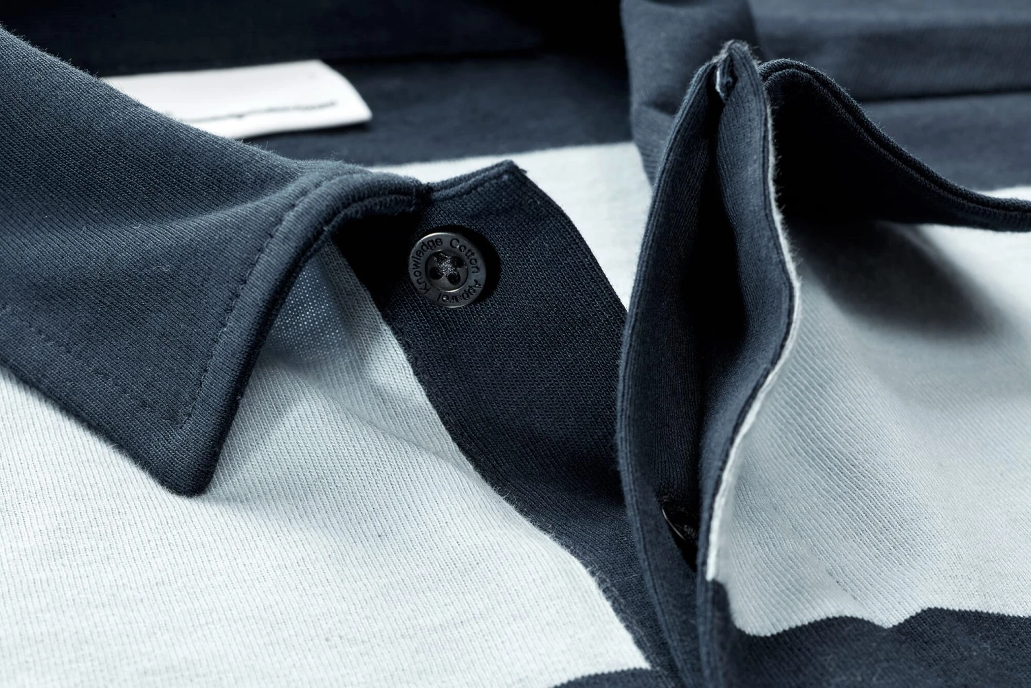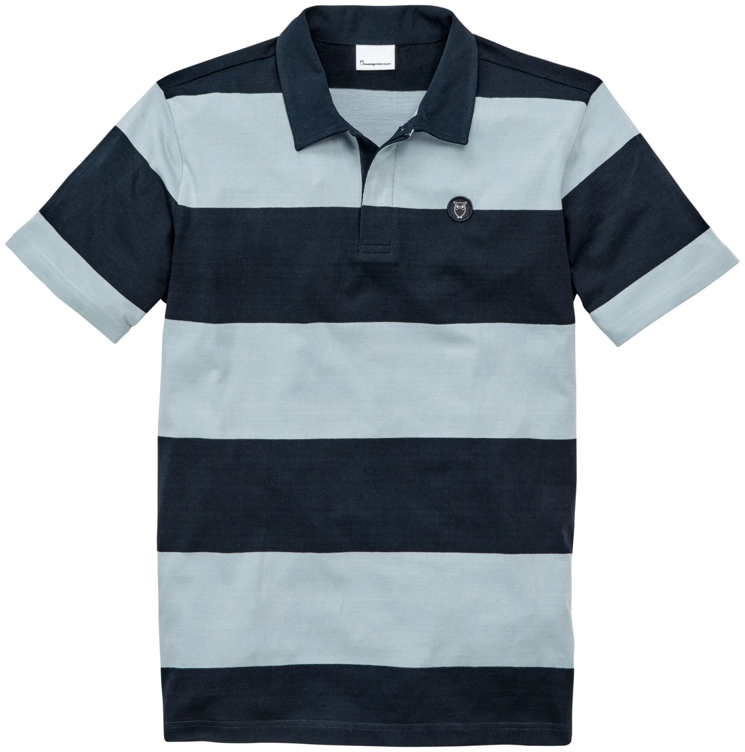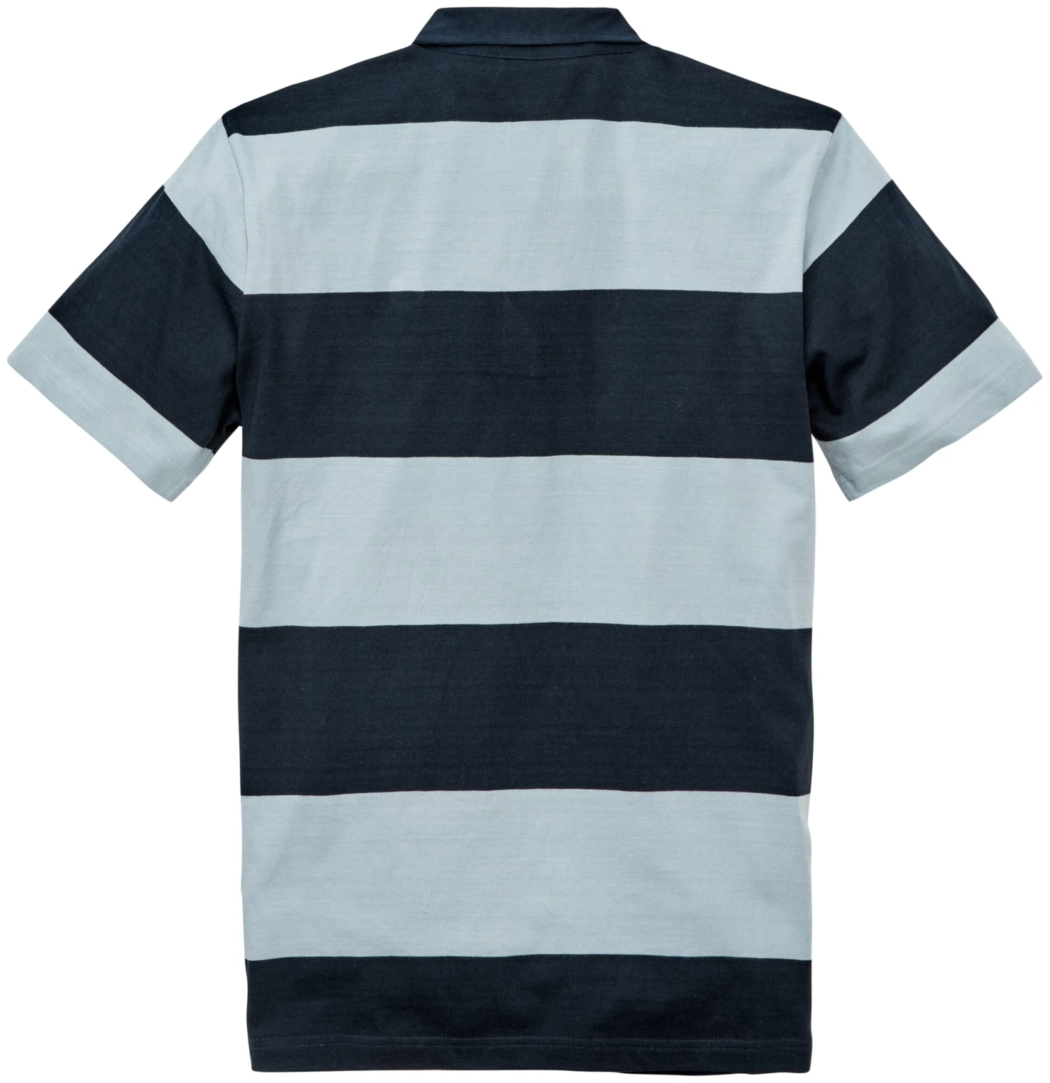 Contrastrijke polo met opvallende blokstrepen, gemaakt van gecertificeerd biologisch katoen. Bijzonder is de knoopsluiting: Het overhemd is verborgen dichtgeknoopt, alleen het bovenste knoopje is zichtbaar.