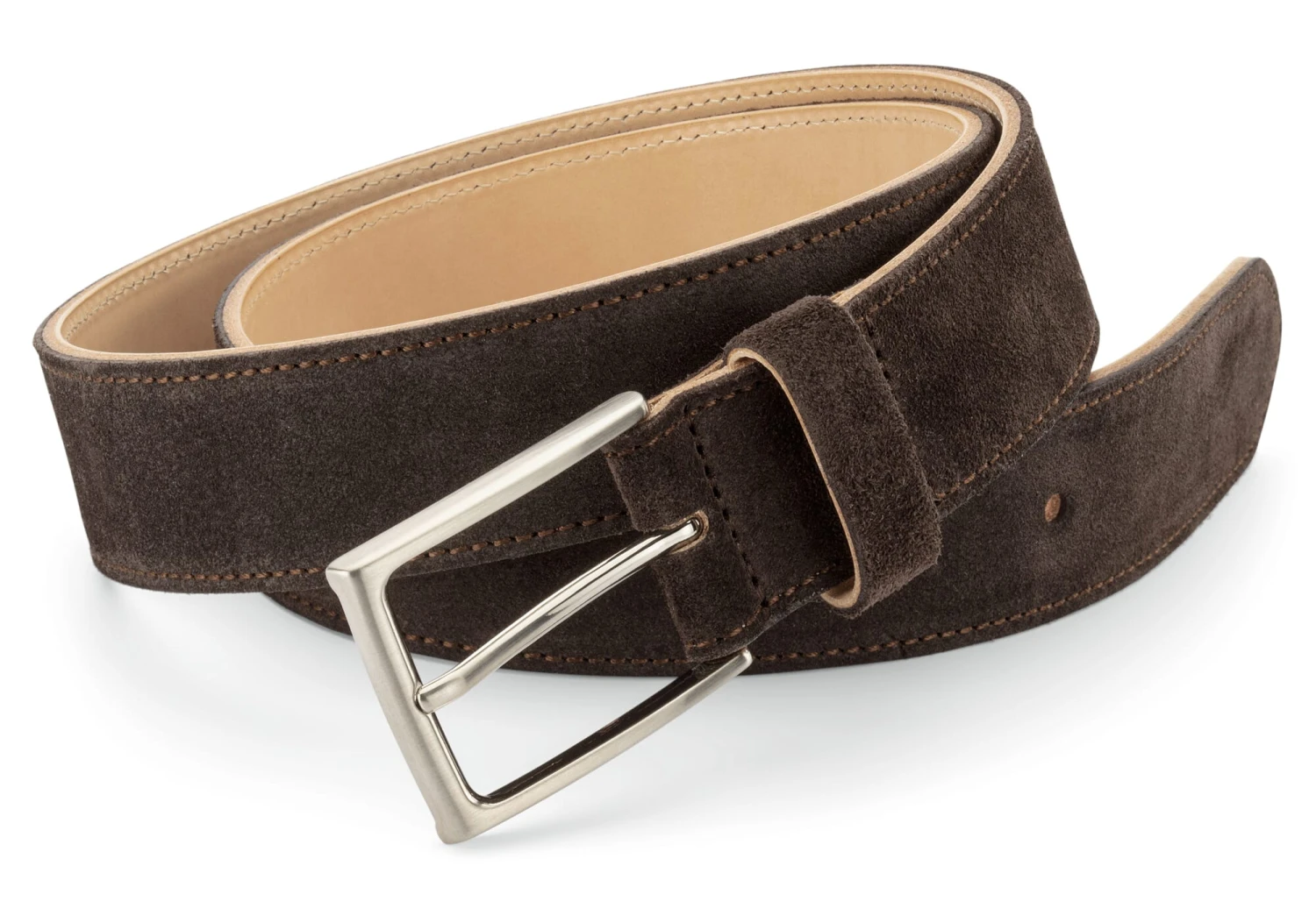 Het bovenleer van deze tweelaagse riem is een donkerbraungemêleerd gelooid rundssuède met een fluweelachtig oppervlak. Het voeringleer is een naturelkleurig plantaardig gelooid rundleer. De riem heeft een zilverkleurige koperen gesp.