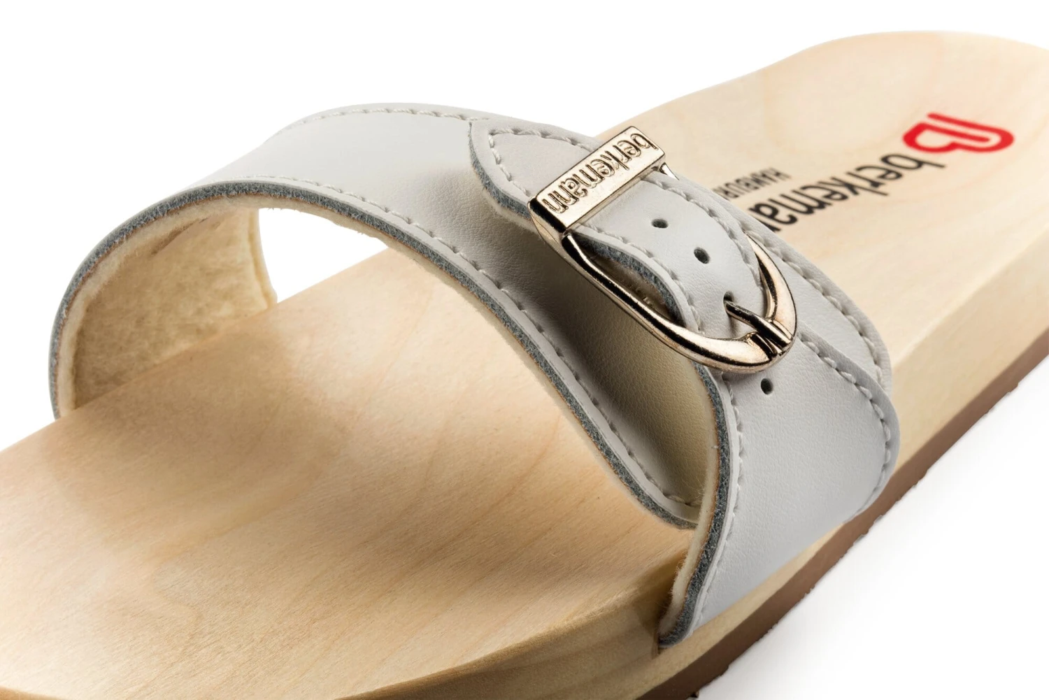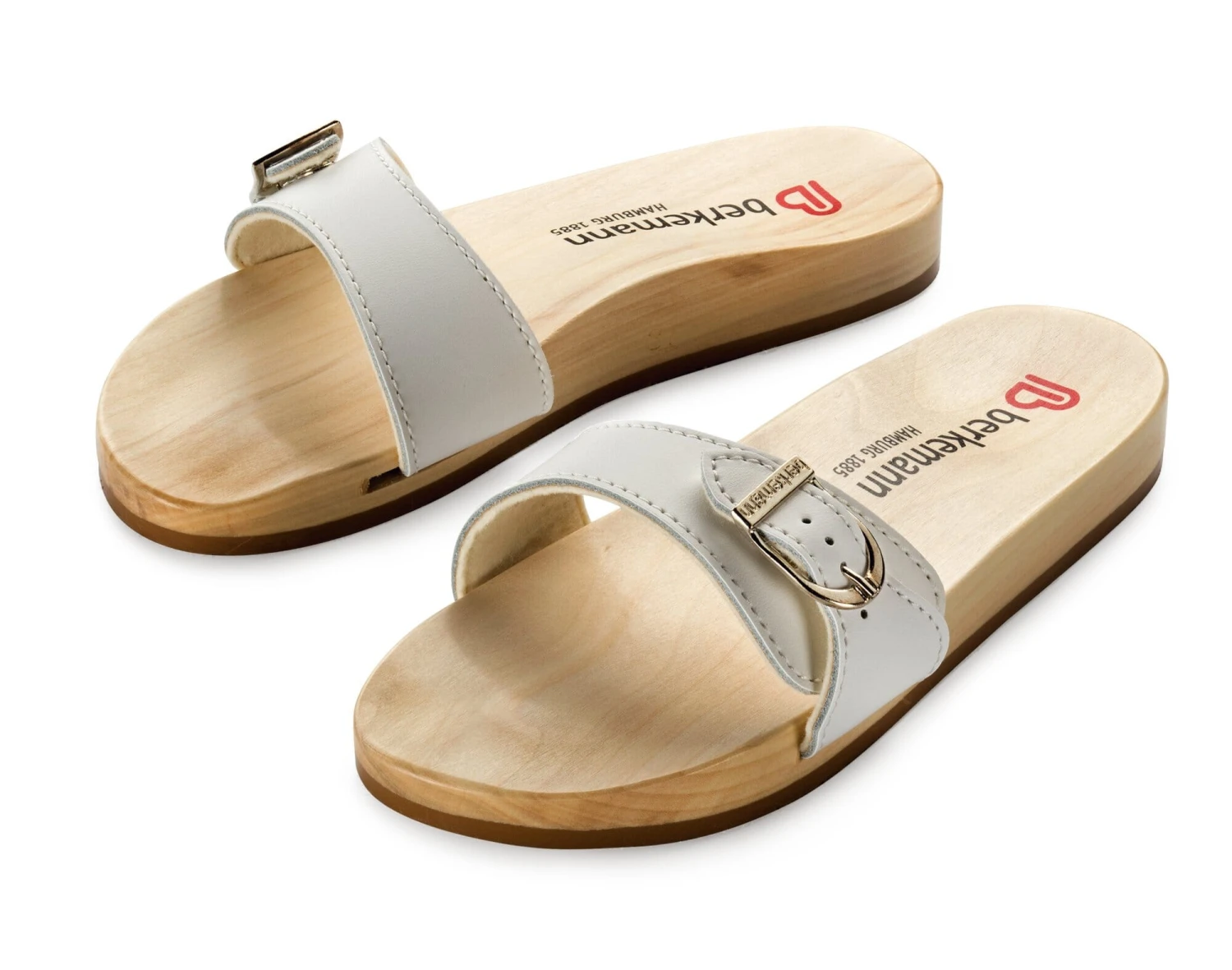 De “Berkemann original sandal”, ontwikkeld in 1946, zet de voet aan tot een krachtige grijpbeweging. De houten zool heeft een blank gelakte zijde en is voorzien van een zool van natuurrubber. De lederen band, met vilt (80% wol, 20% viscose), is door de zool geregen. De gesp wordt bevestigd met een klinknagel die ook aan de zijkant flexibel is.