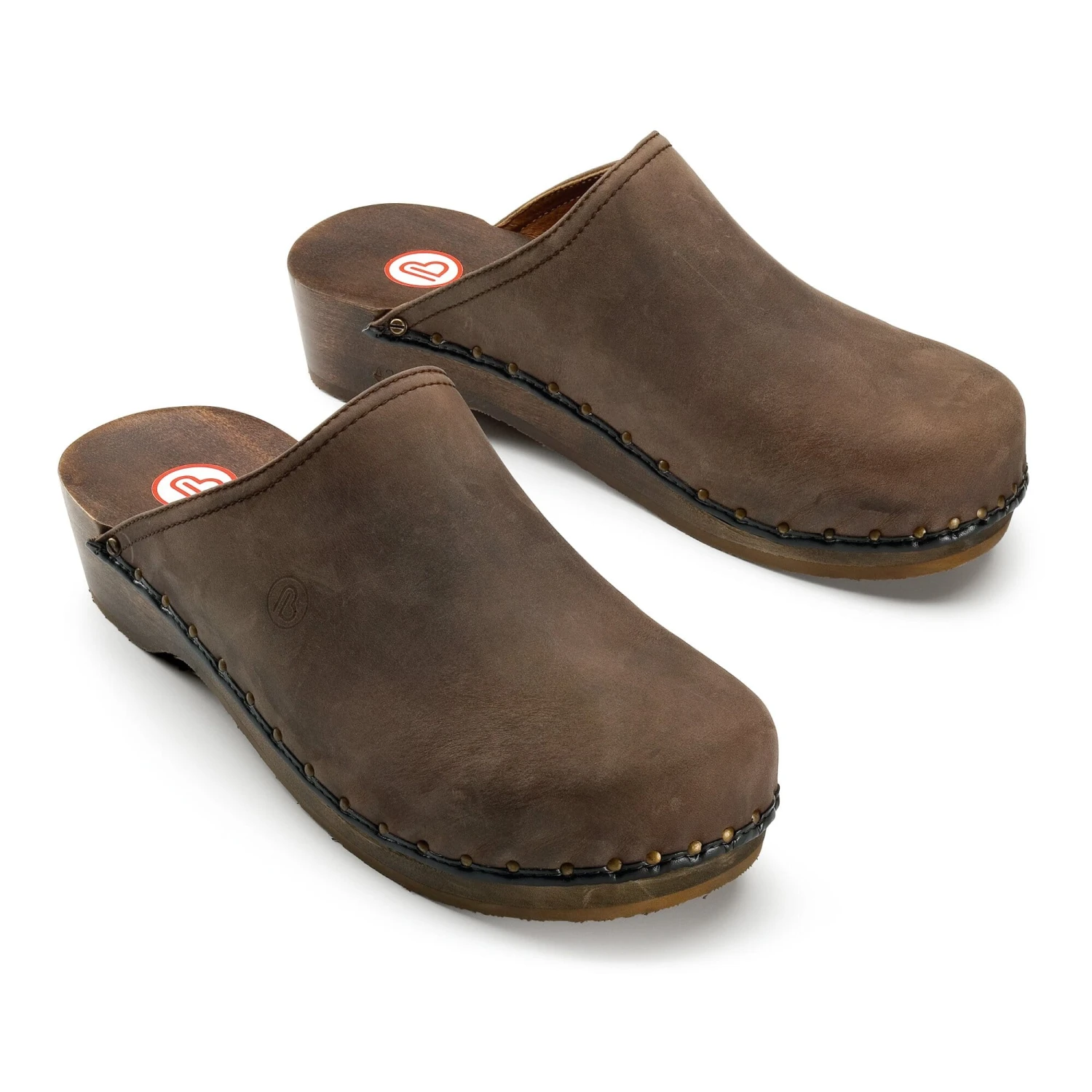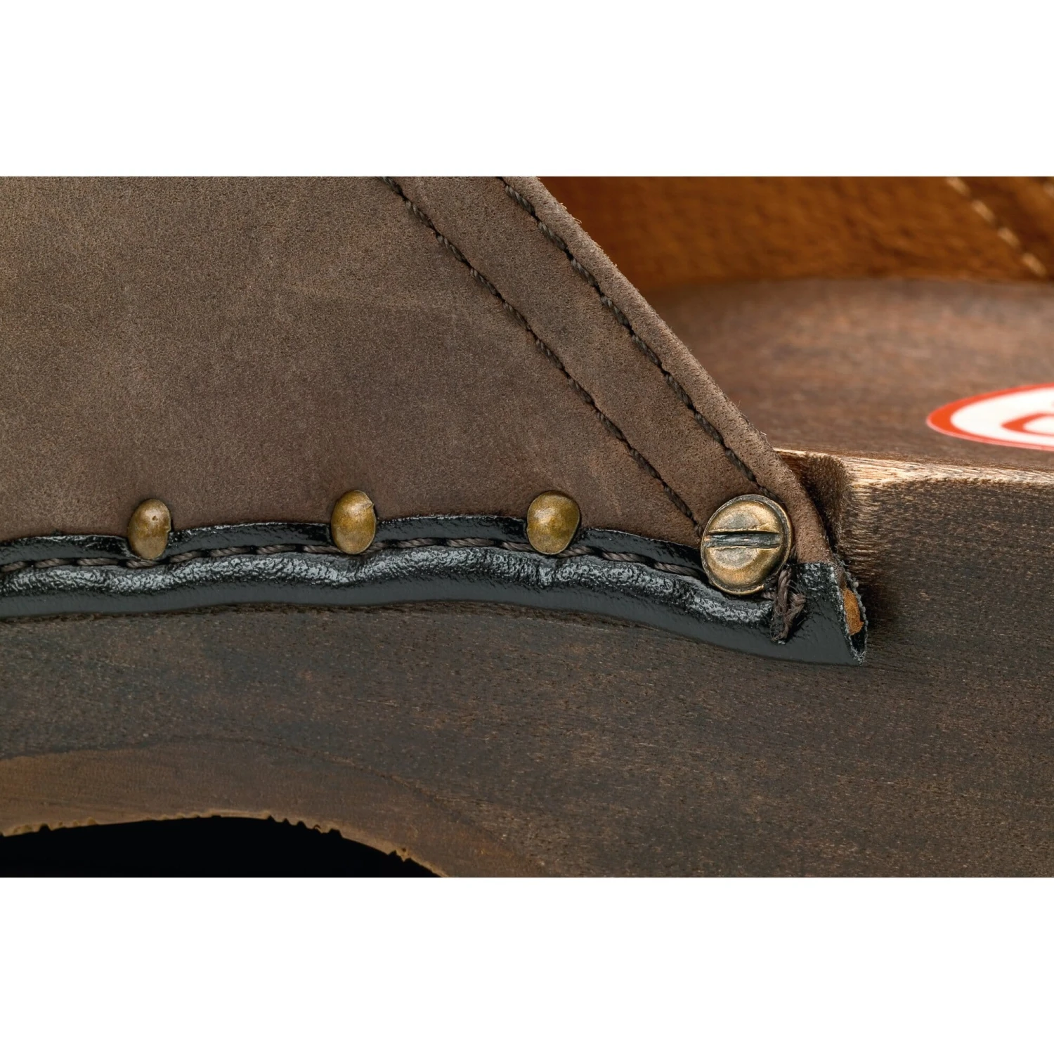 Het lichaam van deze klompen is gemaakt van licht, maar stevig populierenhout. In tegenstelling tot conventionele modellen is het bovenleer niet aan het hout geniet, maar met de hand genageld en zelfs aan de basis geschroefd. Een bies beschermt de snijrand van het leer en verhoogt verder de duurzaamheid van de nagelbevestiging. Het bovenleer is een doorgeverfd vetleer, het voeringleer is een natuurlijk, zacht gemalen varkensleer. Beide zijn laag-chroom gelooid. Leer en hout komen uit Italië en worden met de hand gemaakt in Hongarije. De buitenzool is gemaakt van zeer slijtvast rubber. De sticker op de hiel bedekt een klein gaatje in het houten lichaam als gevolg van het fabricageproces.