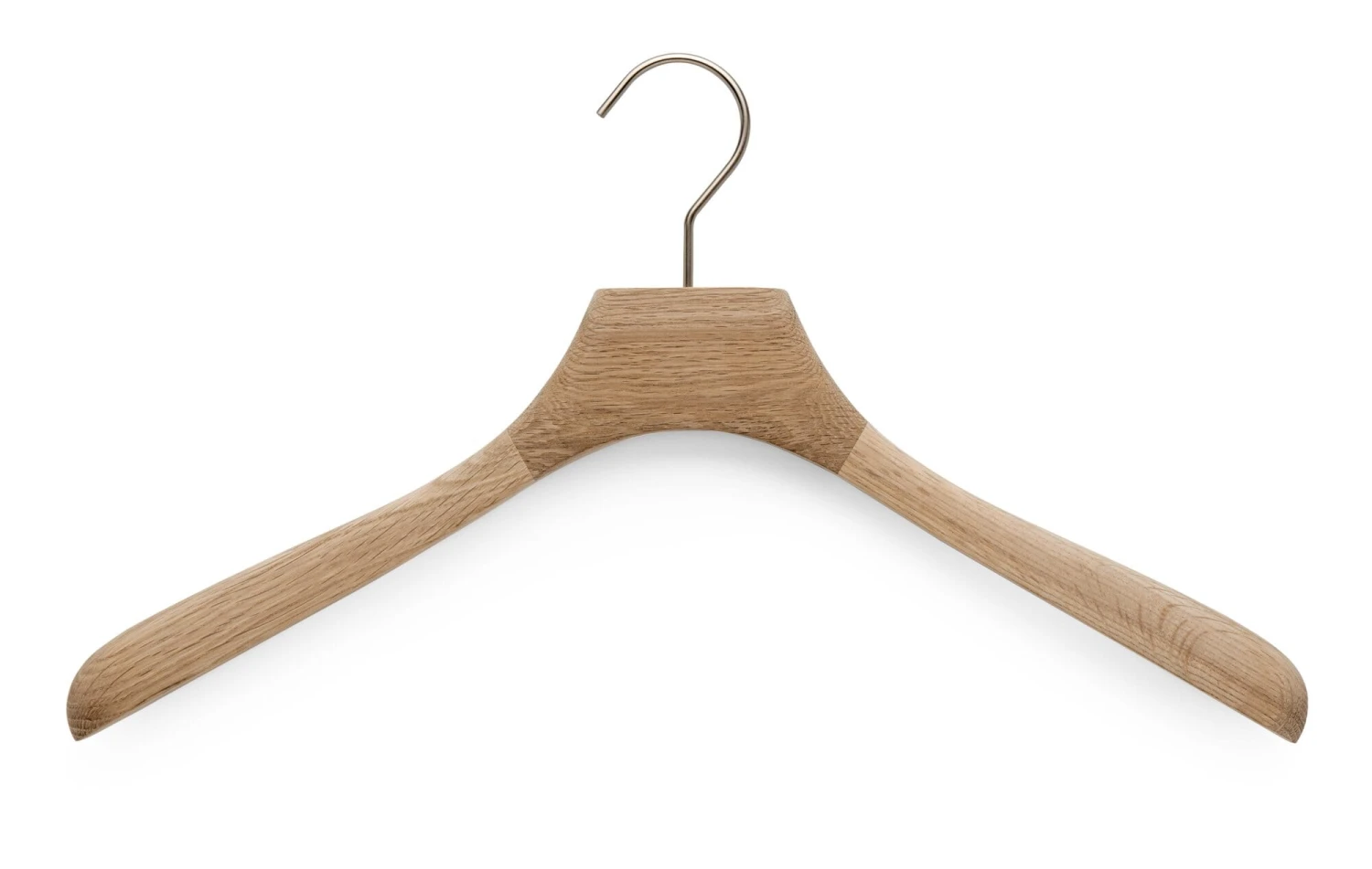 Grote hanger, met breed steunvlak van massief eikenhout en een matte zilverkleurige stalen haak.