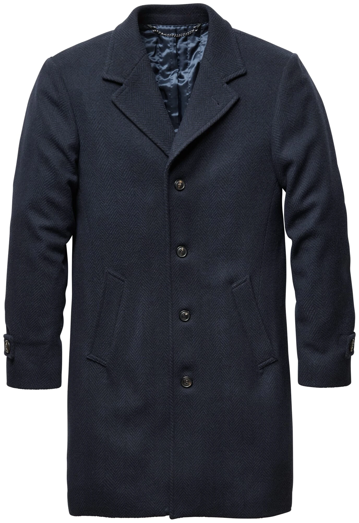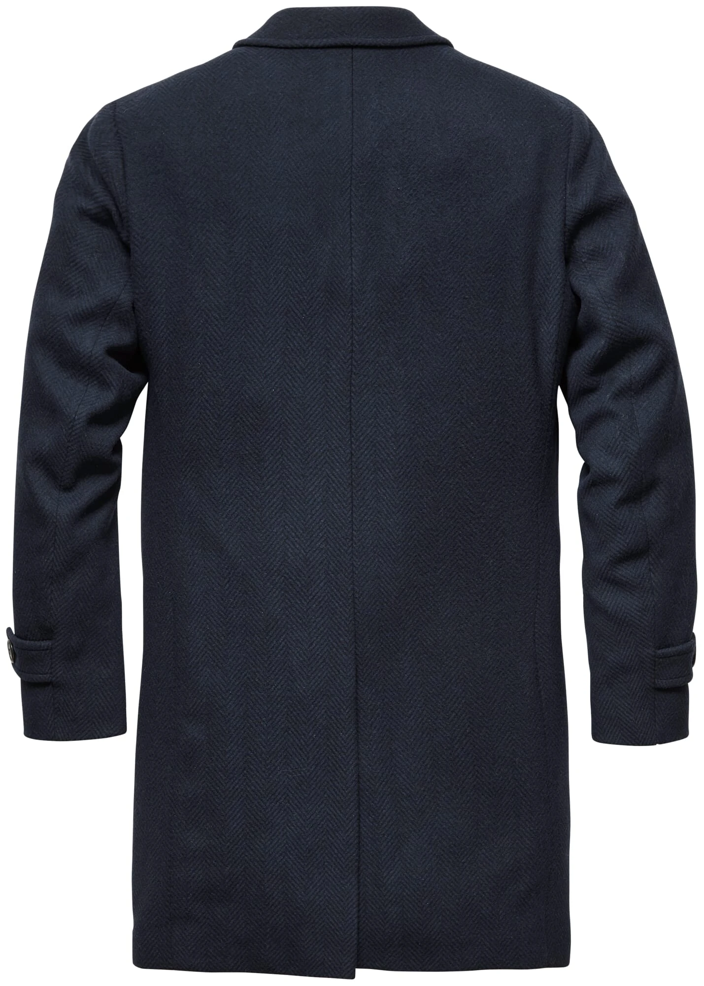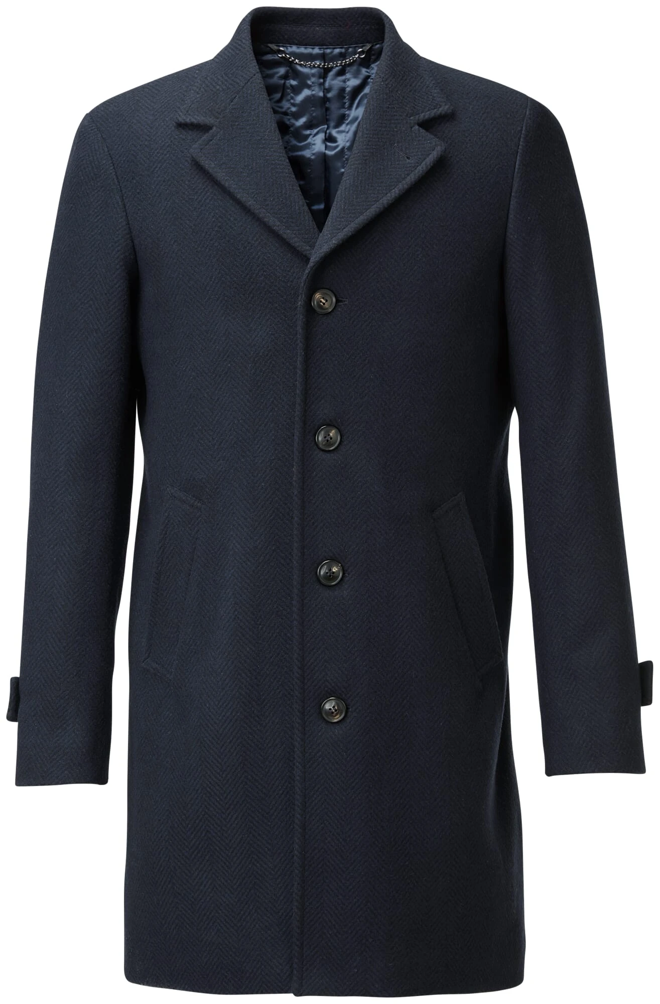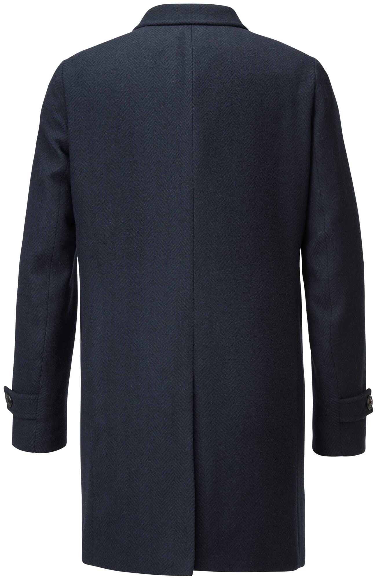 100% scheerwol, voering 100% viscose, vulling 100% katoen. Bevat niet uit textiel bestaande delen van dierlijke oorsprong: Echte hoornknopen. Metalen hanger. Gemaakt in Bulgarije. Ruglengte in maat 52 = 94,5 cm.
