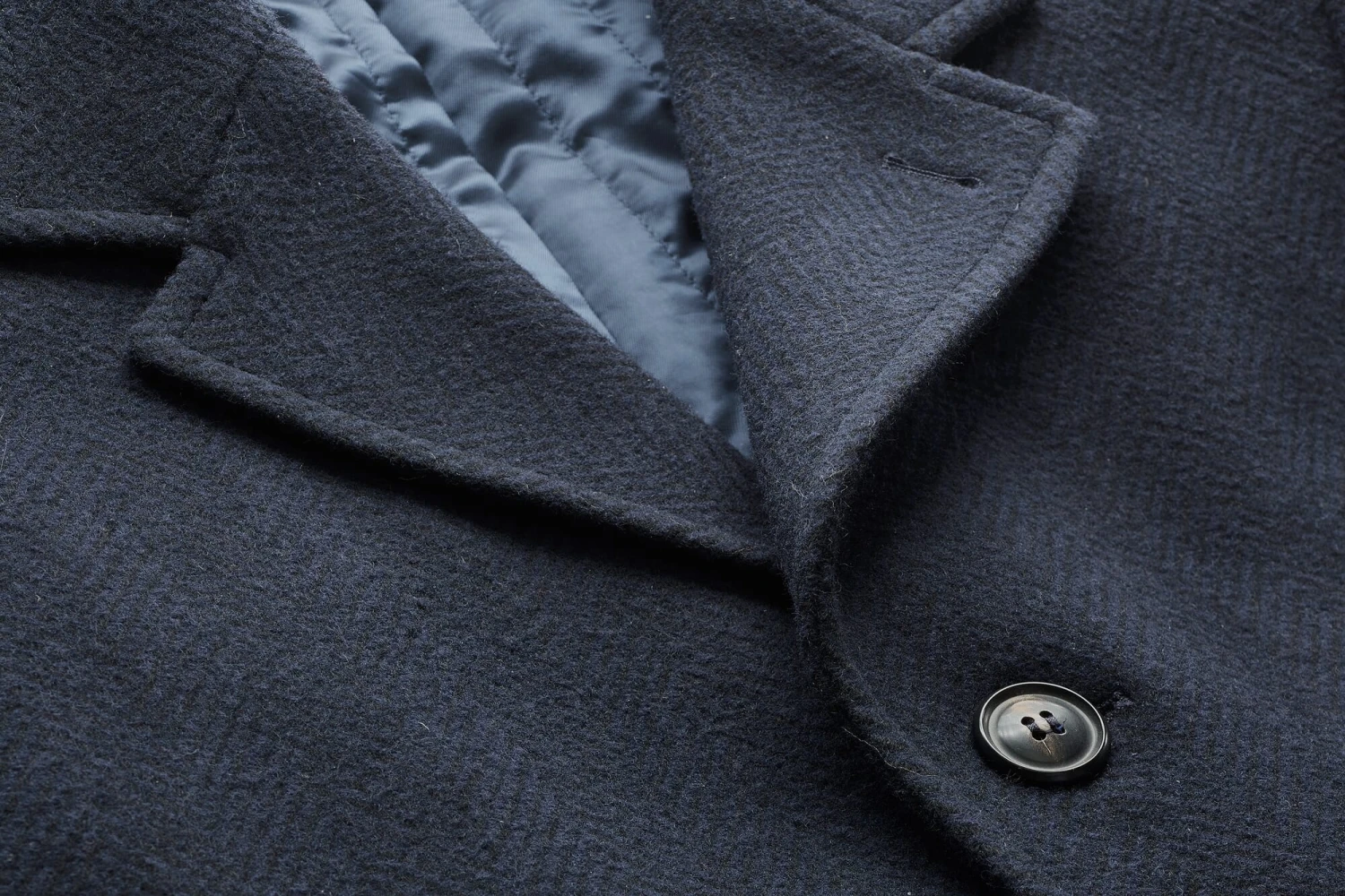 Met deze korte jas kan de koelere helft van het jaar komen. Onder de verwarmende buitenstof van zuiver scheerwol ligt een extra katoenen vulling. Binnenin zit een gladde viscose voering met doorgestikte naden die in de lengte lopen om de vulling op zijn plaats te houden. De jas heeft twee zijzakken en drie binnenzakken, waarvan er twee zijn ingezet in buitenste stoffen facings, waardoor ze steviger zijn. Splitnaden aan de voorkant geven de jas vorm, en een split aan de achterkant verhoogt het comfort. Een scheidingsnaad in de lengte op de rug slankt het optisch af.