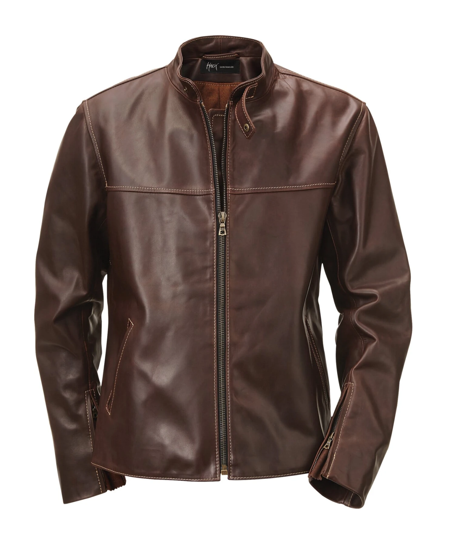 Hack maakt deze jas met opstaande kraag en een wollen voering in de romp van hoogwaardig pull-up paardenleder met een vettig gevoel, dat door veelvuldig dragen een levendig patina ontwikkelt. Het is iets langer gesneden aan de achterkant, en heeft een afgeronde zoom naast de ingezette bewegingsplooien. Met messing rits; aan de mouwen zitten nog twee korte ritsen, waarvan de leren inzetstukken eindigen met een muizentandrand. Heldere contrasterende stiksels. Met paspelzakken opzij en twee binnenzakken, waarvan de linker verticaal is ingezet.