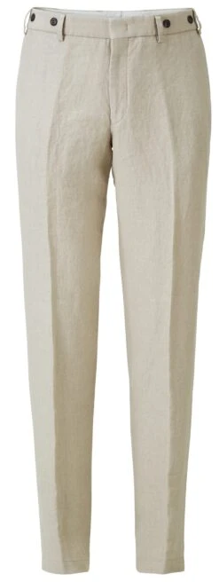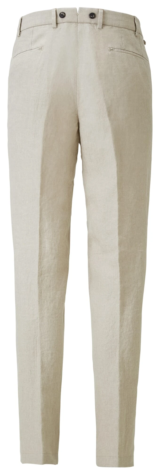 Hiltl maakt deze ongevoerde broek van een sterke en toch zachte linnen stof. Ze zijn gemaakt zonder plooien, maar met een plooi. De tailleband heeft een gekleurde voering. De broek heeft twee steekzakken en twee achterzakken met paspel, en wordt gesloten met een rits- en haakknoop. Ze hebben riemlussen en bretelknopen. Aan een lus in de buitenstof kunt u kleine voorwerpen voor dagelijks gebruik of een ketting bevestigen.