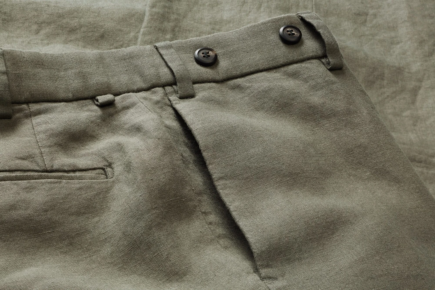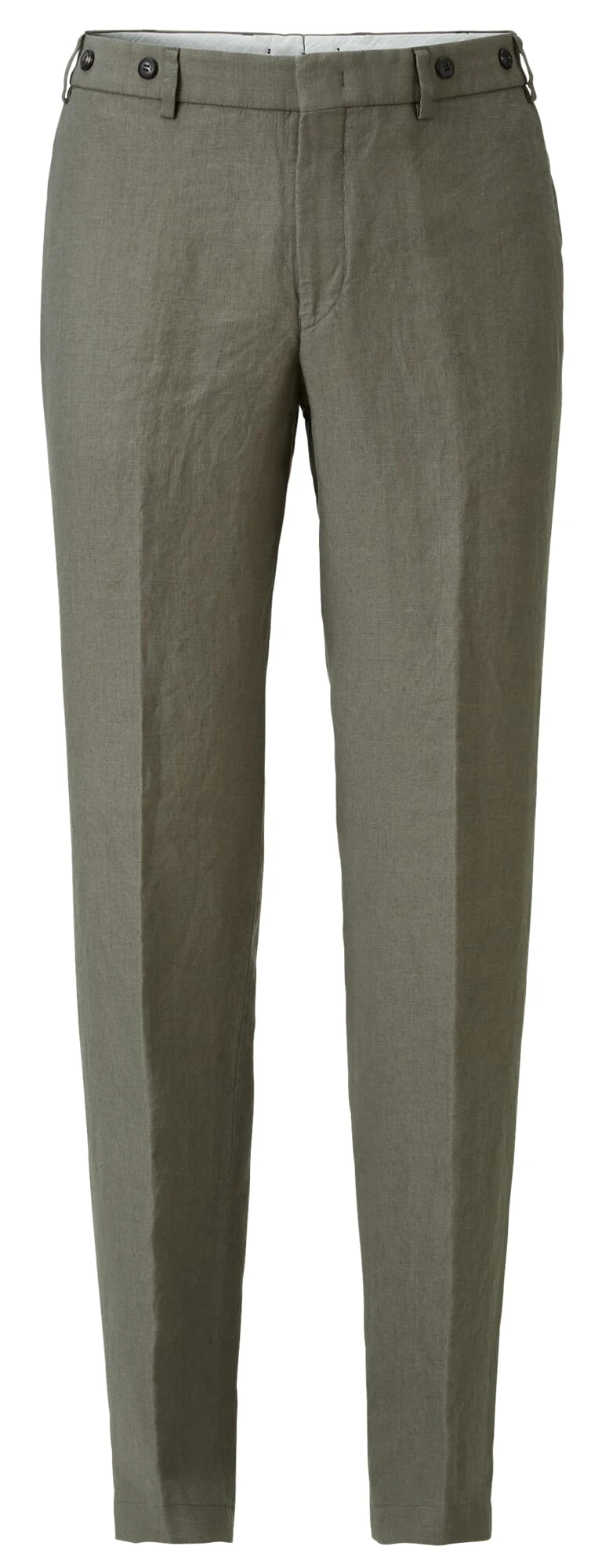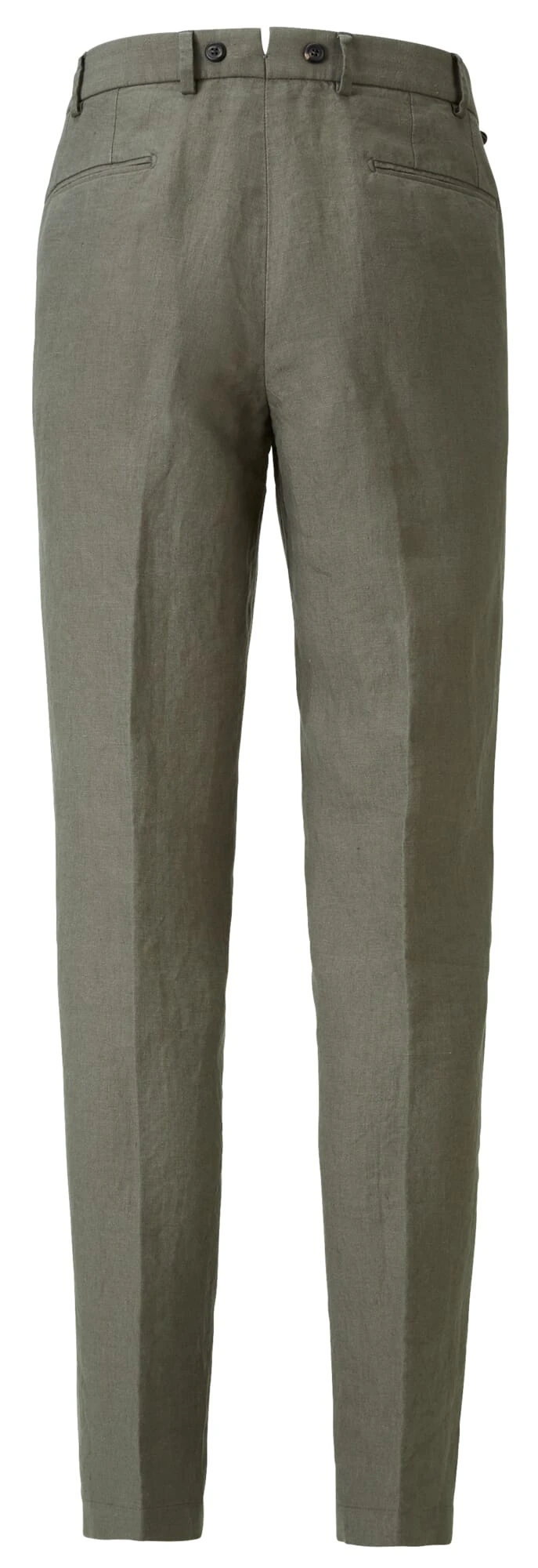 Hiltl maakt deze ongevoerde broek van een sterke en toch zachte linnen stof. Ze zijn gemaakt zonder plooien, maar met een plooi. De tailleband heeft een gekleurde voering. De broek heeft twee steekzakken en twee achterzakken met paspel, en wordt gesloten met een rits- en haakknoop. Ze hebben riemlussen en bretelknopen. Aan een lus in de buitenstof kunt u kleine voorwerpen voor dagelijks gebruik of een ketting bevestigen.