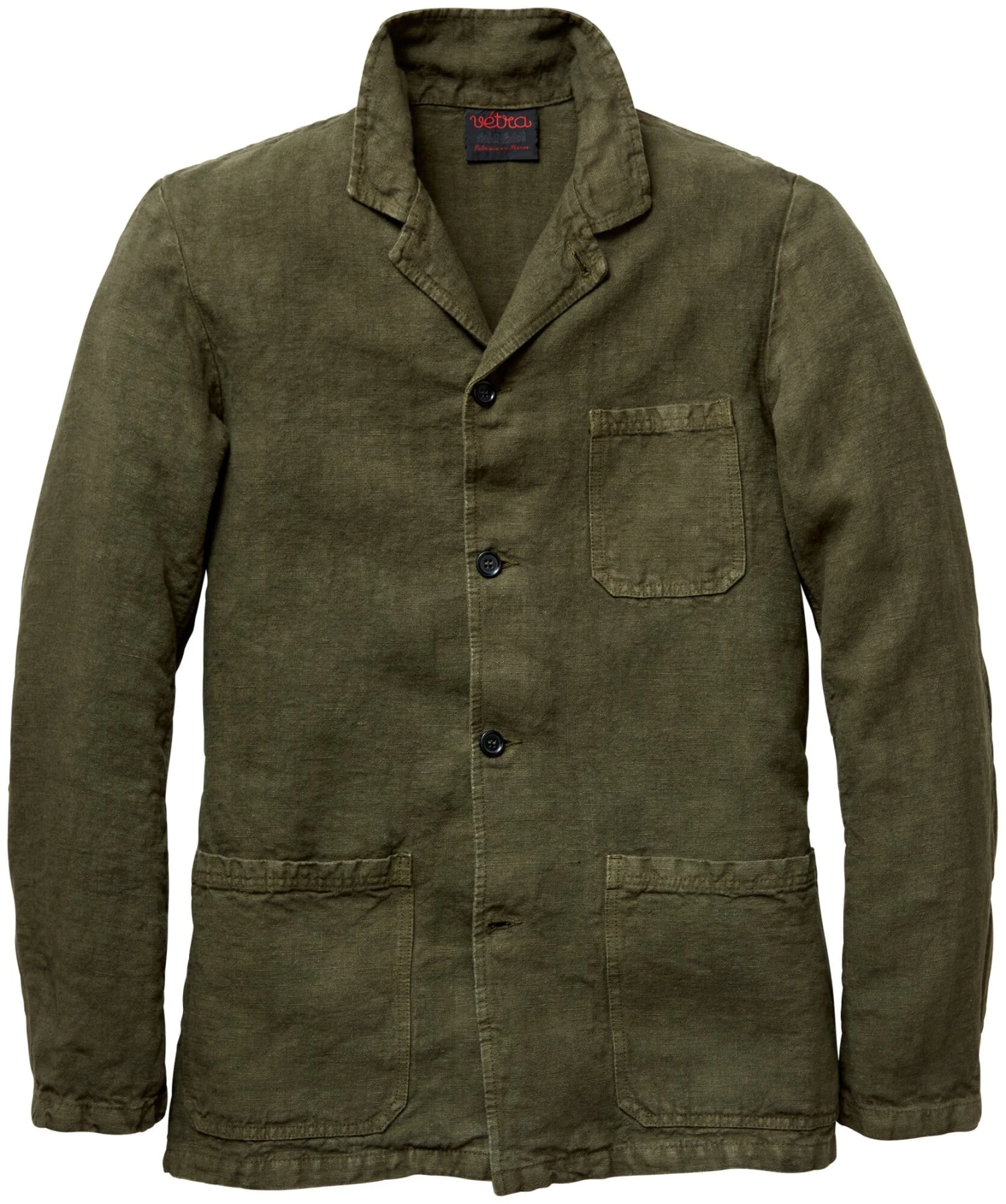 100% linnen. Ongevoerd. Plastic knoppen. Gemaakt in Frankrijk. Ruglengte in maat 52 = 76 cm.