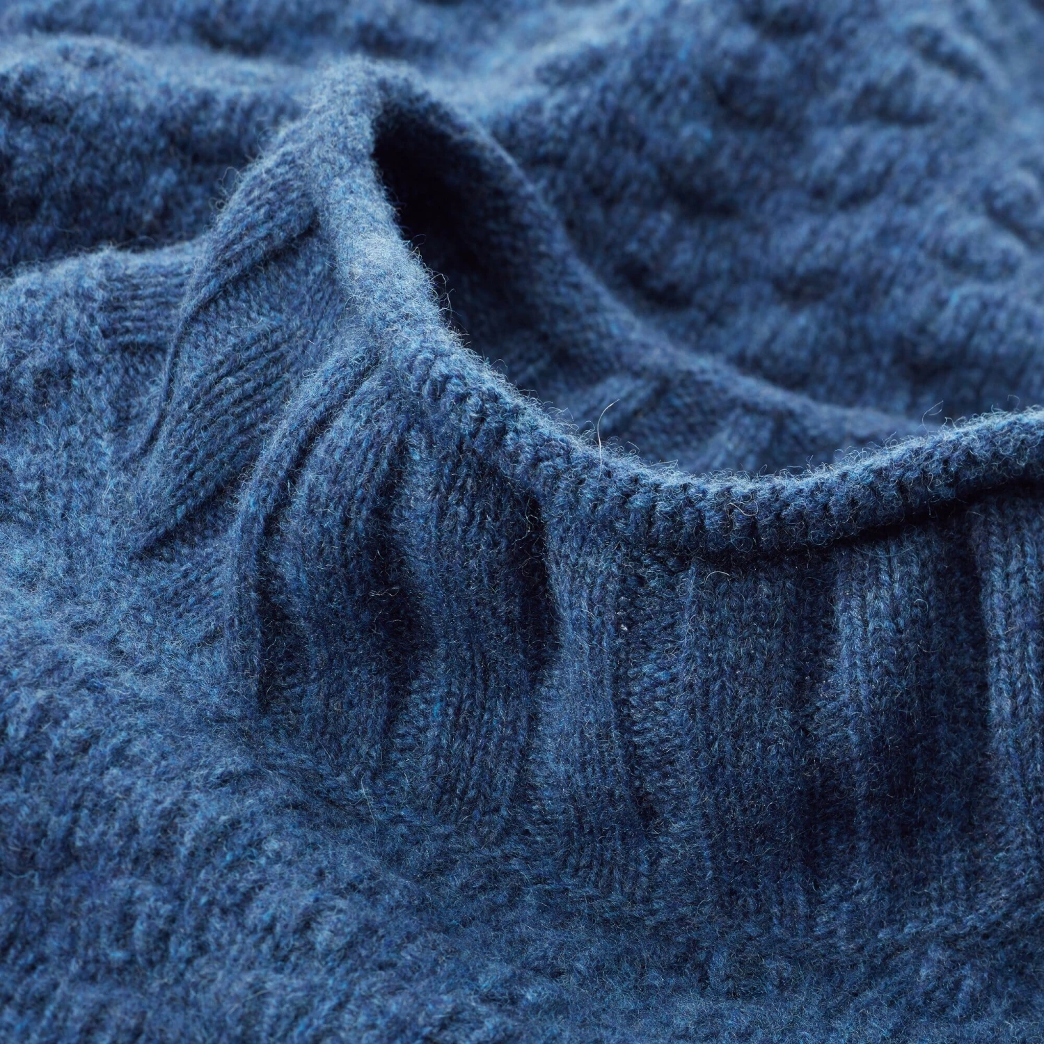 Deze trui van zachte en verwarmende merinowol heeft een levendig, sculpturaal breipatroon. De vrij hoge opstaande kraag is van breed ribbreisel, afgewerkt met een fijne rolzoom. Ribboorden maken de mouwen en de romp af.