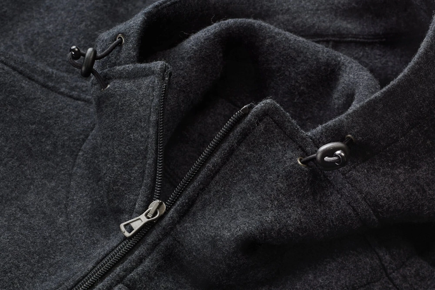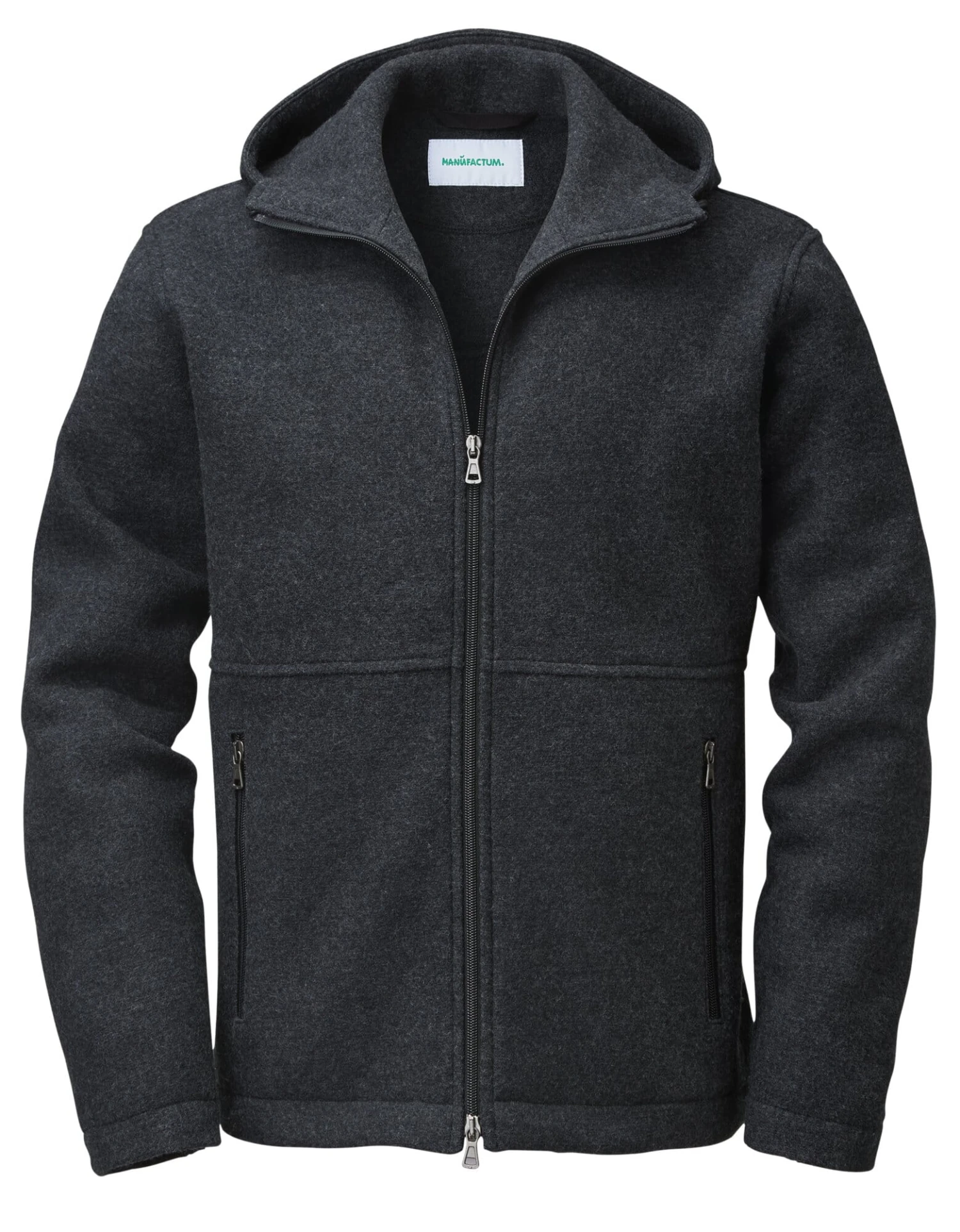 We hebben deze jas met capuchon van een antracietkleurige merinoswol stof met een gemêleerde look. De tweewegrits sluit hoog en de capuchon kan worden versteld met een trekkoord. Twee zijzakken met ritssluiting en twee binnenzakken houden kleine voorwerpen voor dagelijks gebruik. De voorzijde van het jasje is verdeeld door een dwarsnaad halverwege de romp, terwijl de achterzijde is voorzien van een schouderstuk. Het merino jack kan solo worden gedragen, maar ook in combinatie met het Manufactum outdoorjack voor heren.